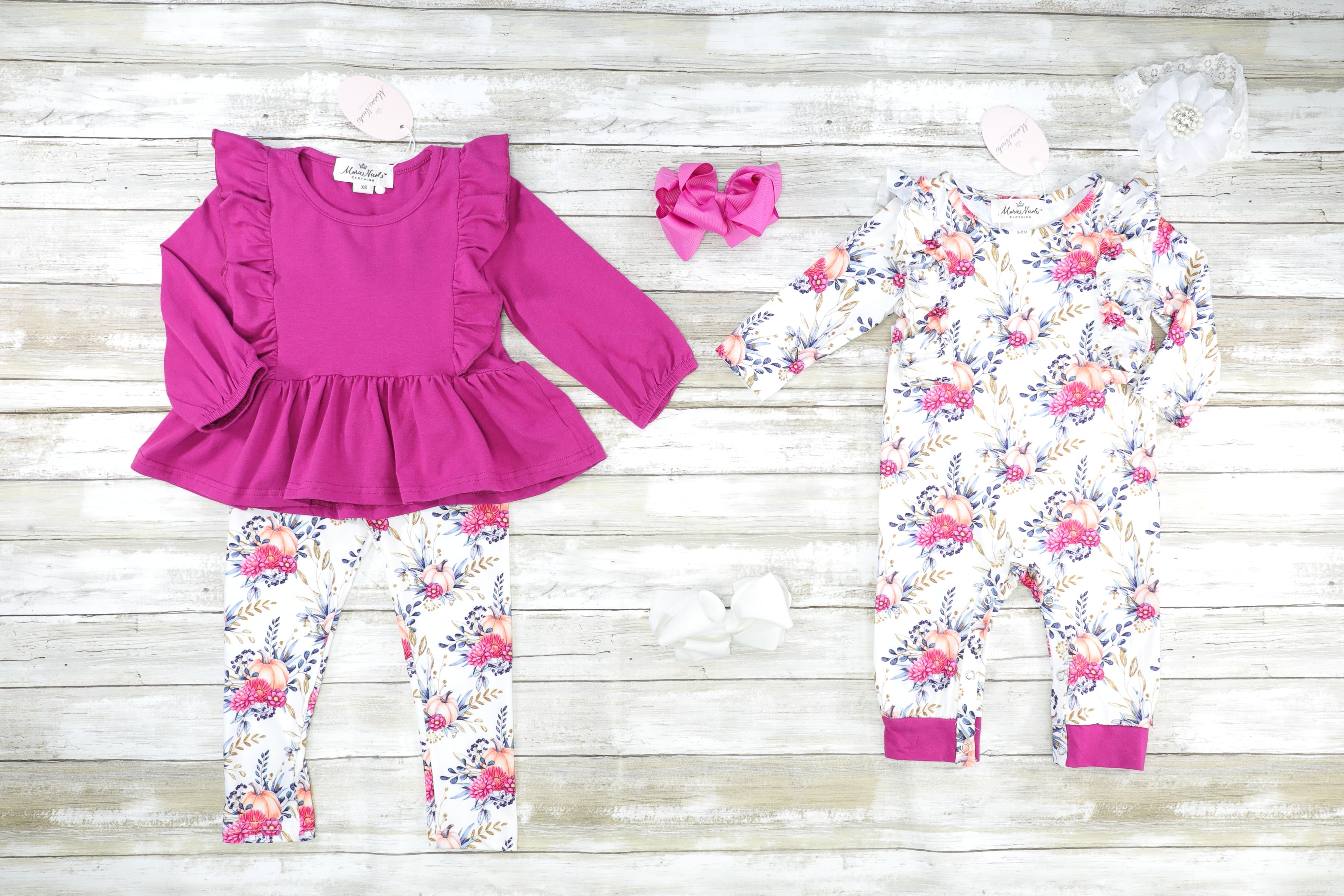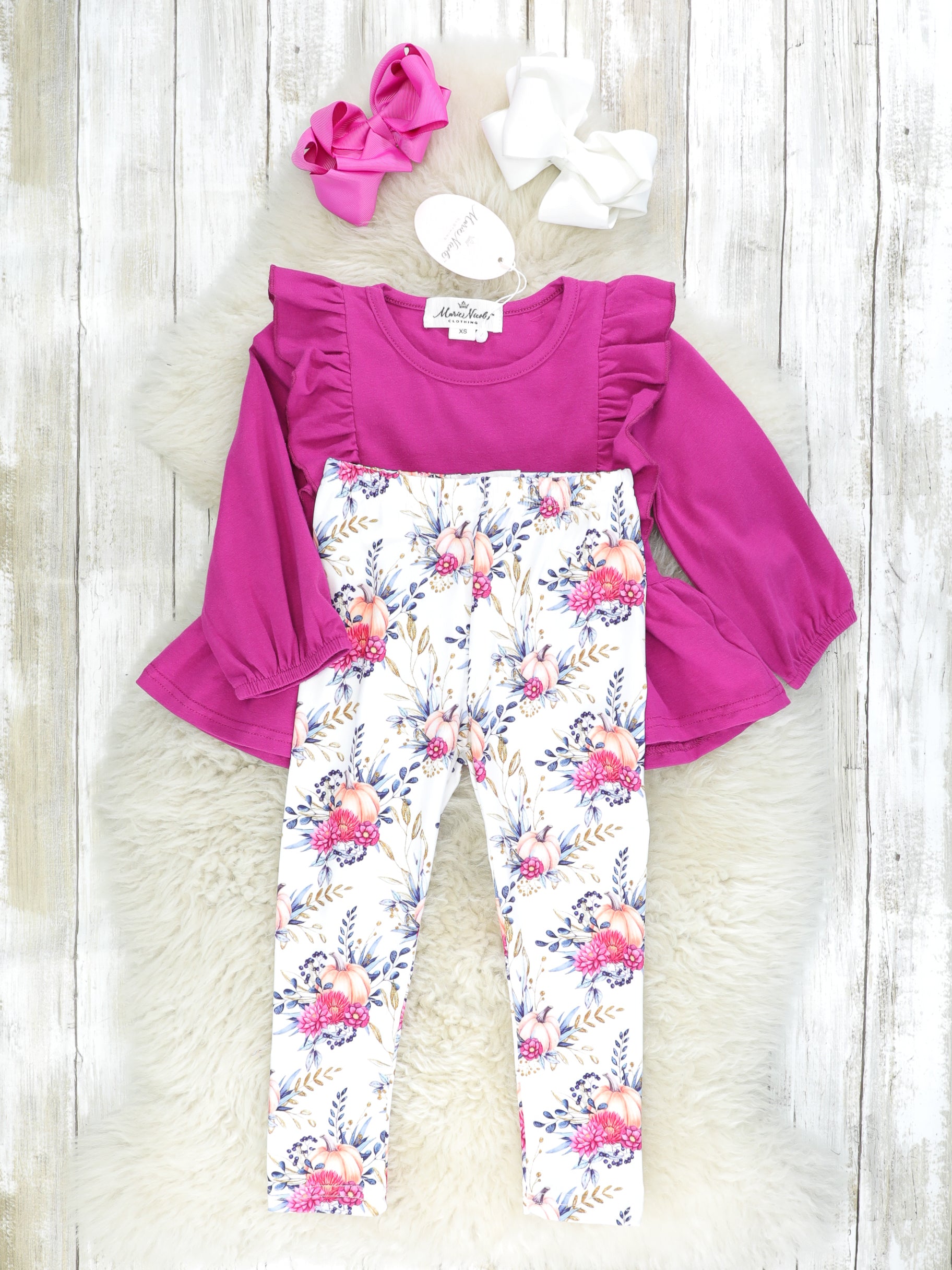This sweet sister set is perfect for all your little pumpkins! This outfit features a dark magenta peplum top with flutter trim and leggings with pumpkin details & florals.