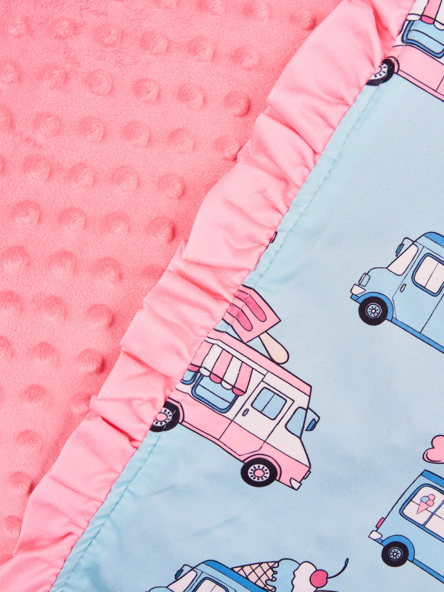 This sister set is perfect for special occasions or everyday wear. This blanket features a cheerful ice cream truck print, pink ruffle trim, and the coziest minky fabric. Make a stylish statement with this classic design!