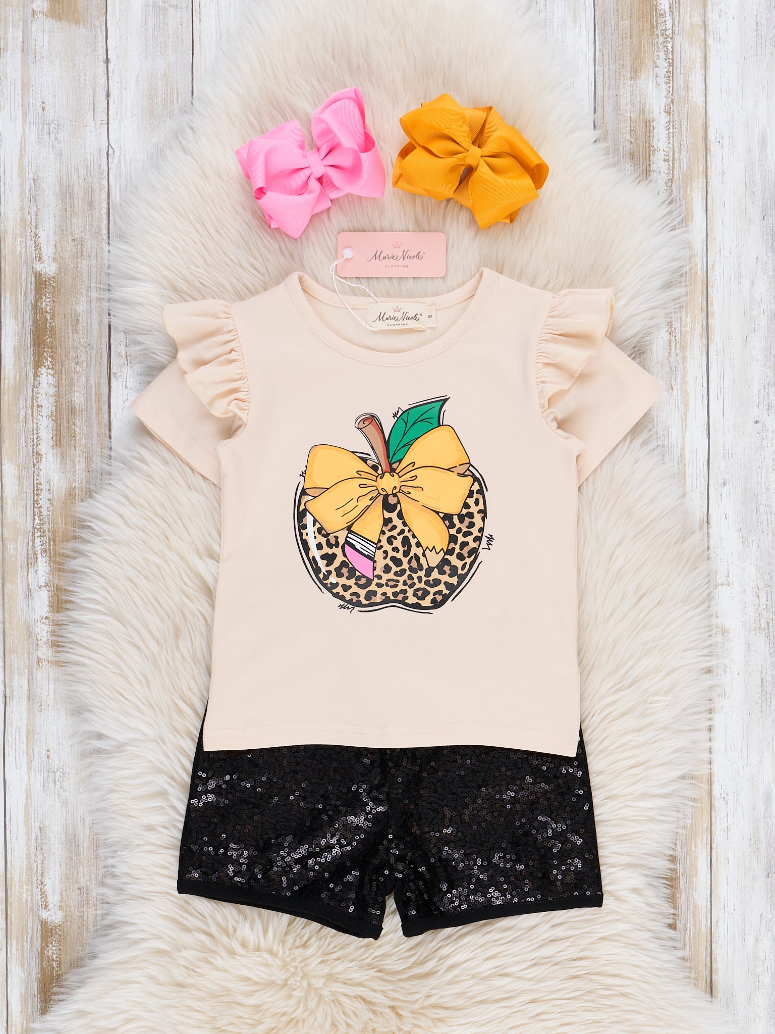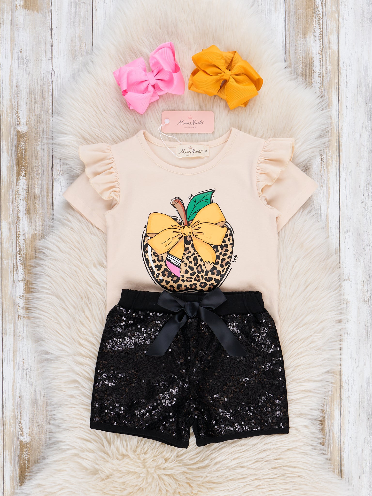 Make a statement with the Leopard Apple Sequin Outfit! Combining the wild charm of leopard apple print with the playful pop of a sequin on the short, this outfit from Marie Nicole Clothing is both fierce and fabulous.  Perfect for those who love to stand out, this outfit is ideal for school days, playdates, or any occasion that calls for a little extra flair.