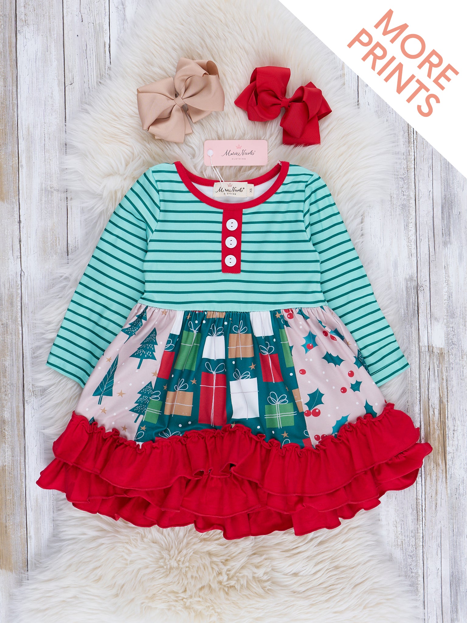 We love this Merry Stripes Dress! Bring on the jolly with its striped bodice, mixed print skirt, and tiered ruffle hem!