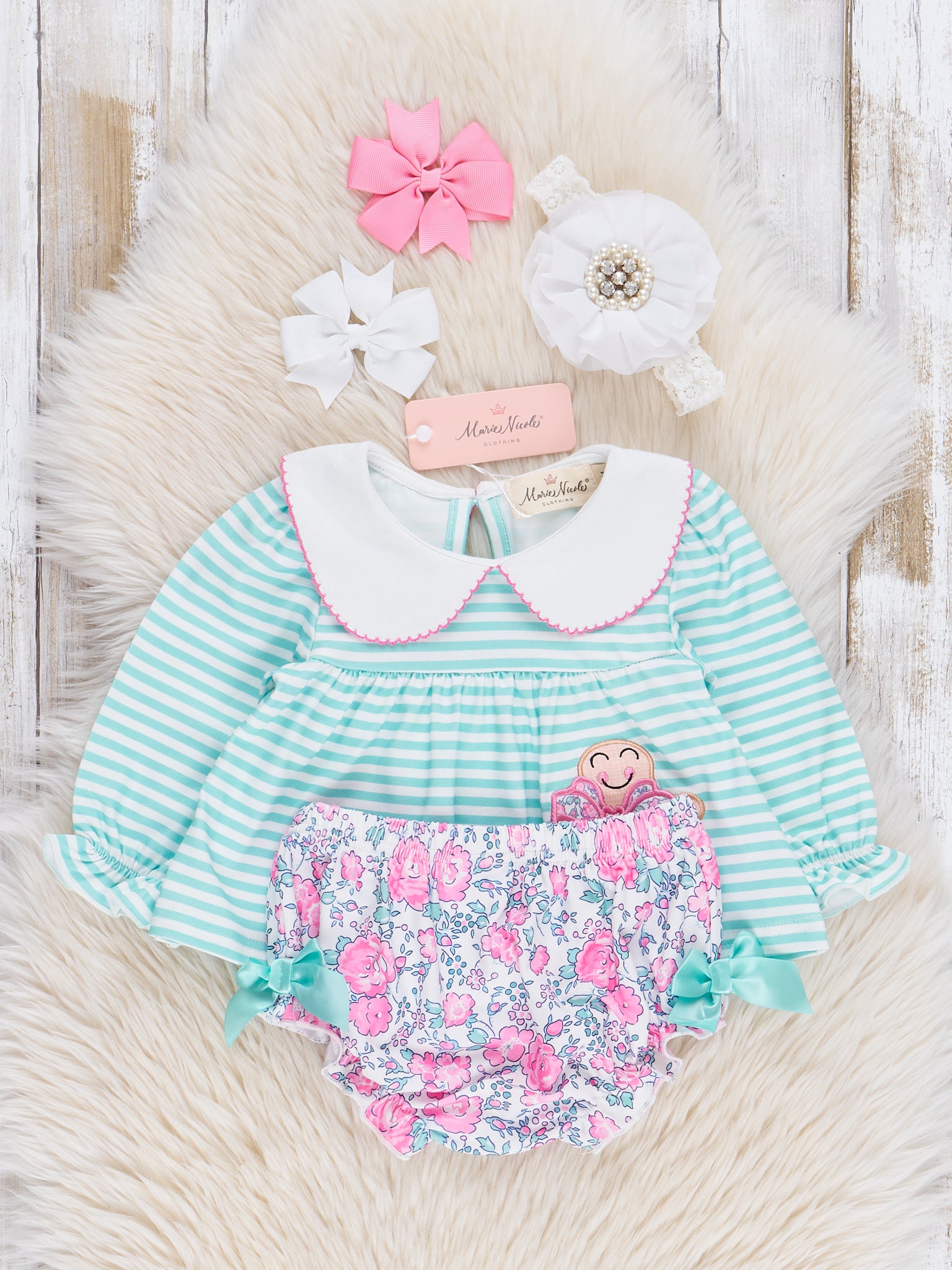 Mint Embroidered Gingerbread Striped Bloomers Outfit