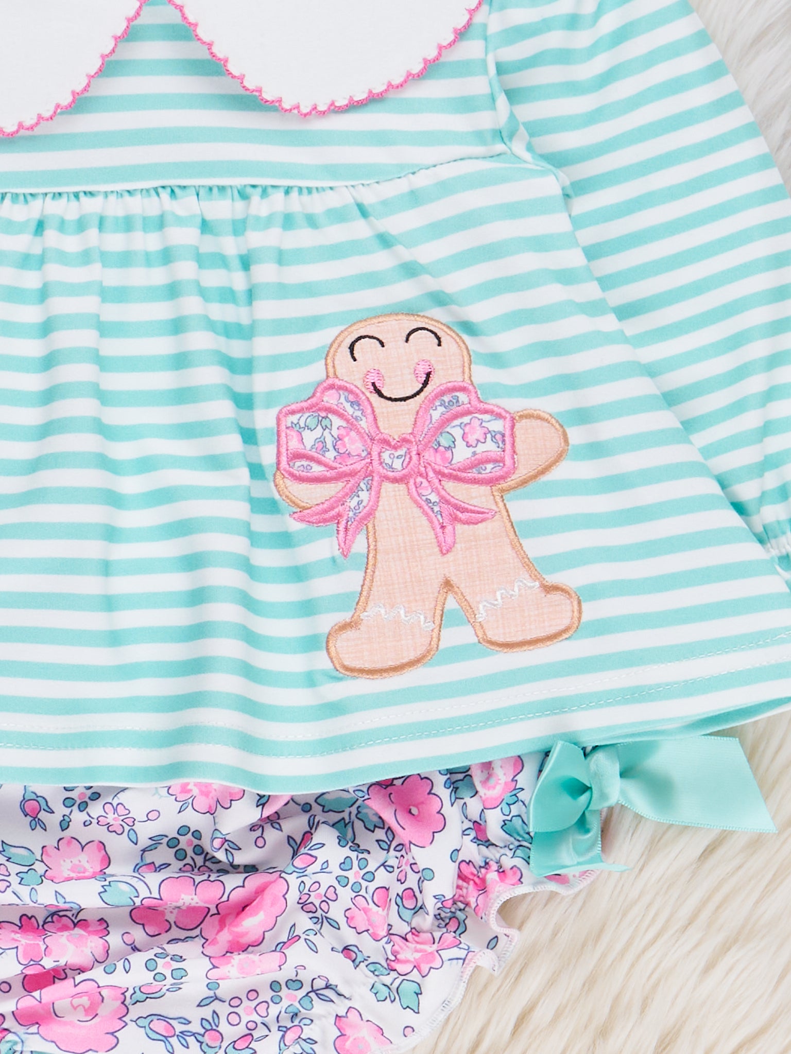 Get ready for some festive fun with our Mint Embroidered Gingerbread Striped Bloomers Outfit! This girls' outfit features a playful striped puff sleeve top with an embroidered gingerbread cookie, paired with floral bloomers for a perfectly sweet and stylish Christmas look. Complete the look with our matching sibling set.