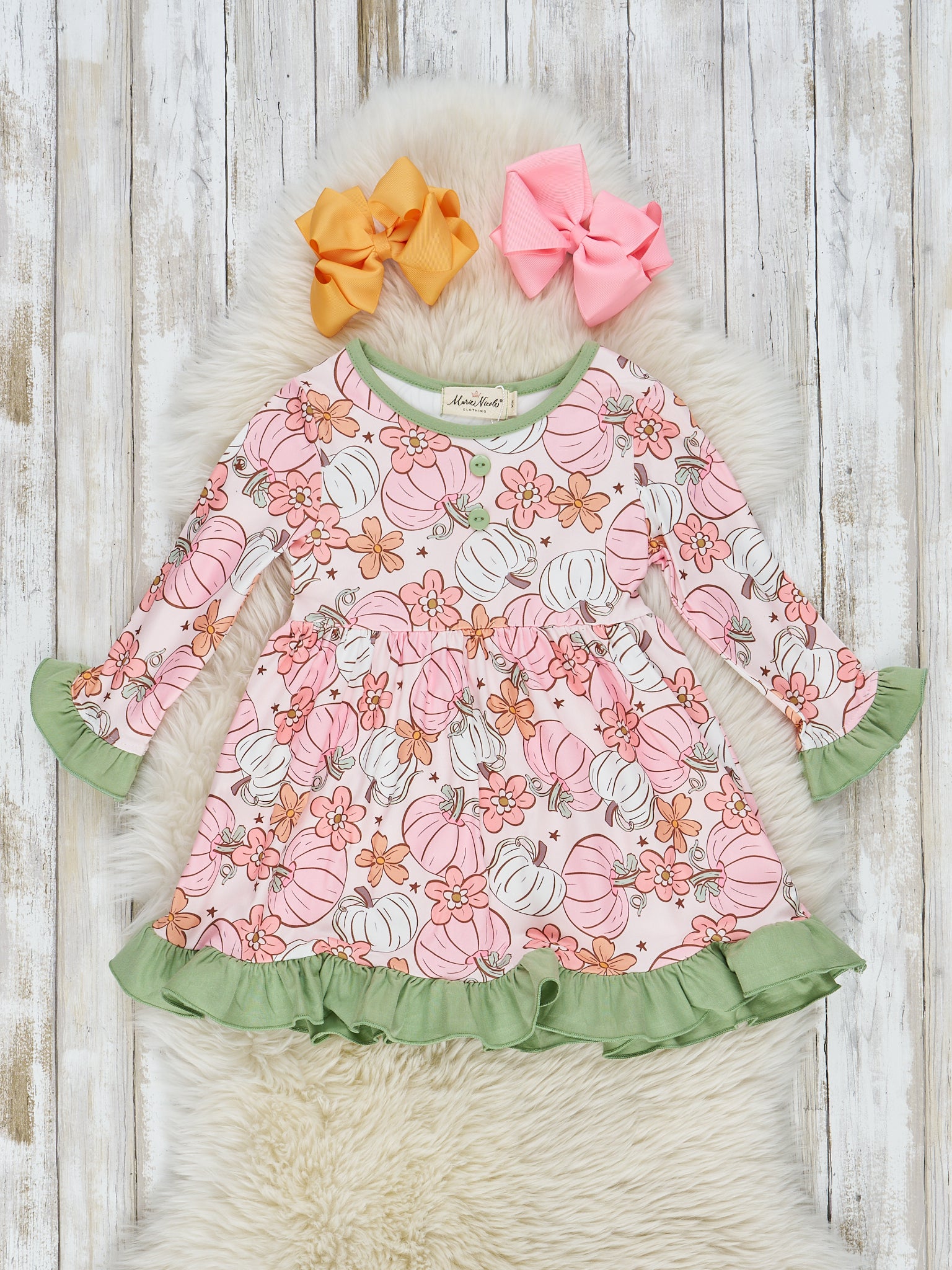 Pink & Green Doodle Pumpkin Garden Ruffle Dress