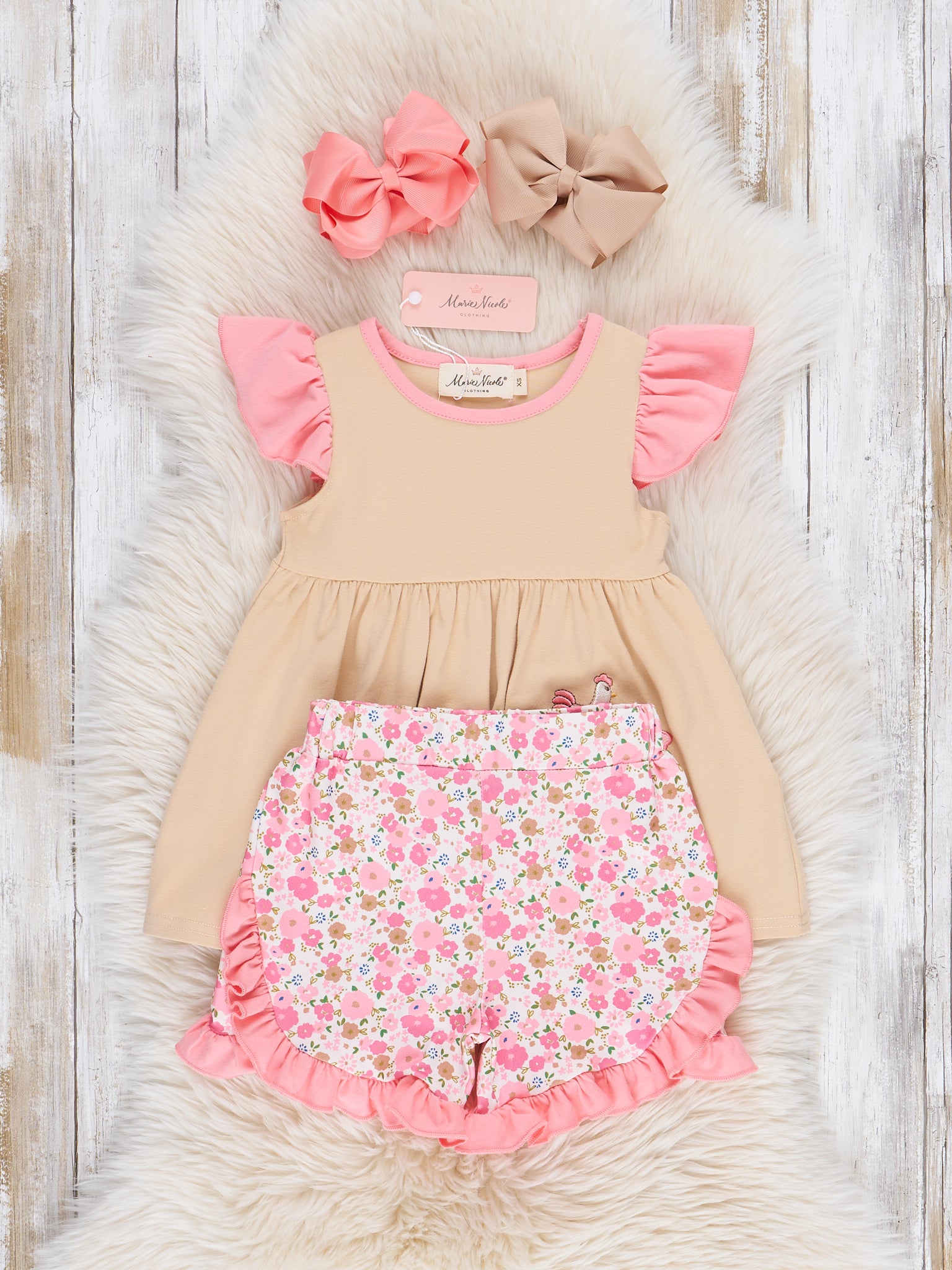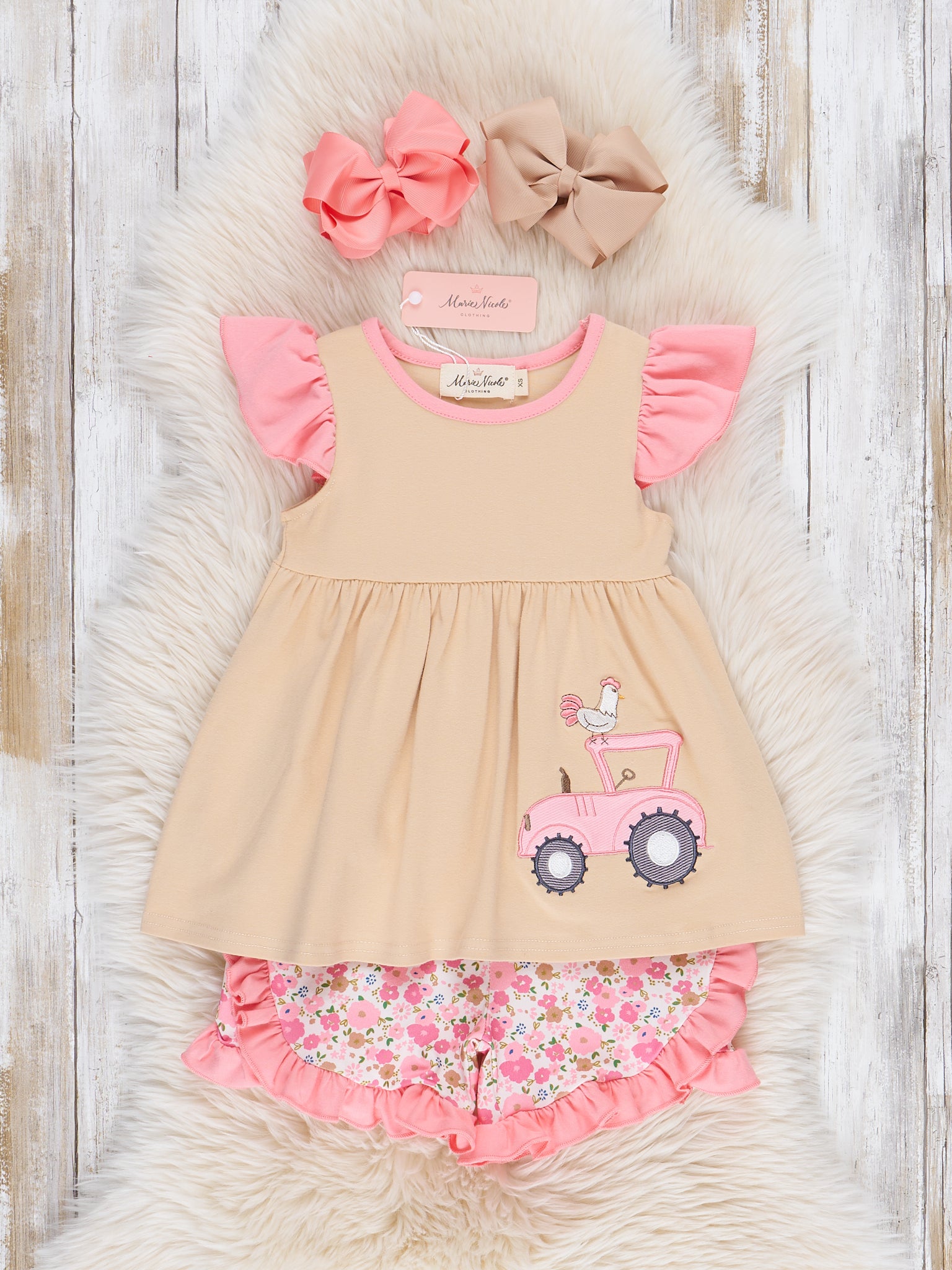 Get your little one ready for some farm fun with the Sweet Tractor Ride Floral Ruffle Outfit by Marie Nicole Clothing! This adorable girls shorts set features a tan top and playful ruffle detail. But the real showstopper? An embroidered chicken riding a tractor on the top paired with the floral ruffle shorts. Perfect for a sister set, this dress is as unique as it is charming.