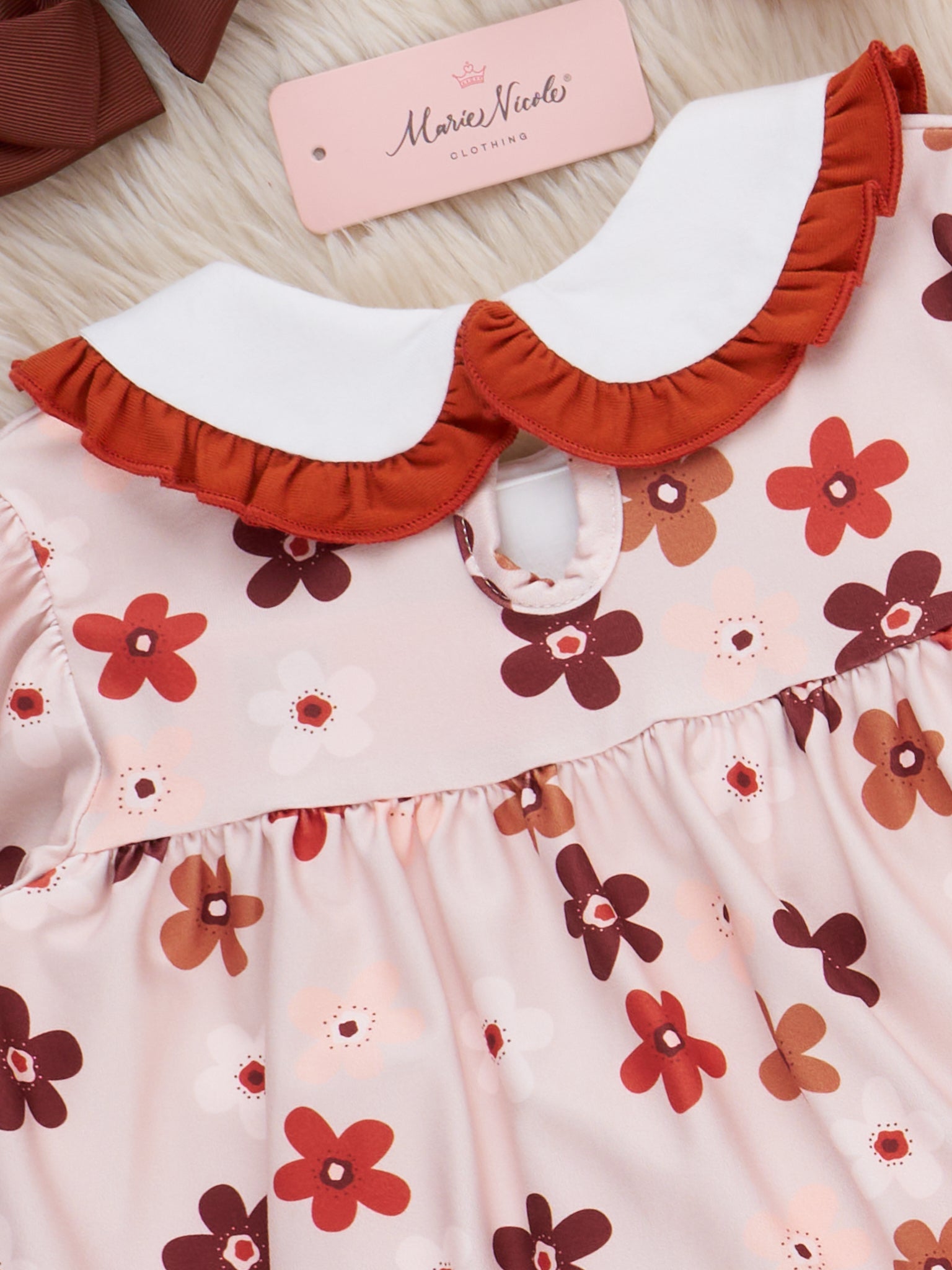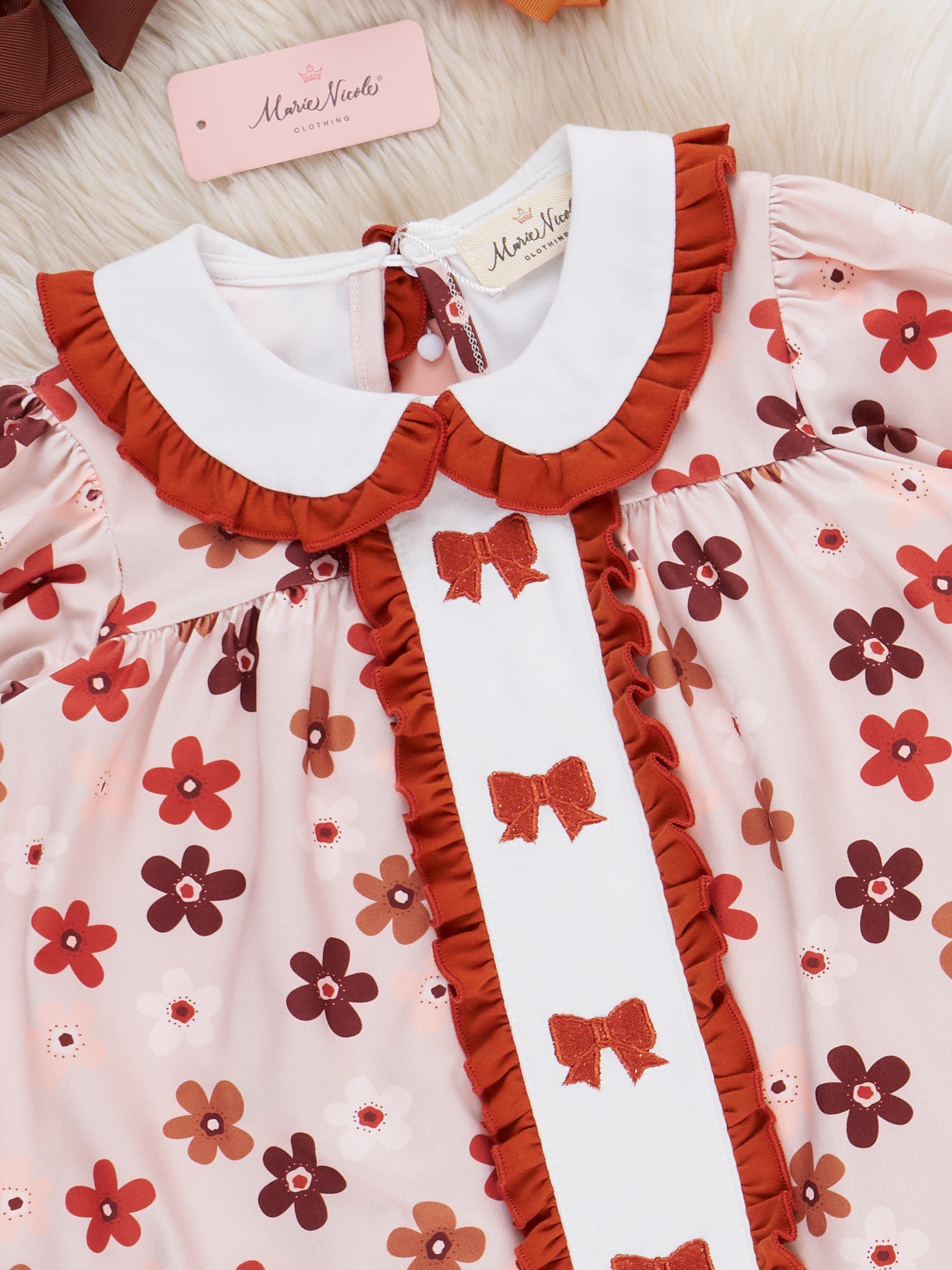 The Maple Bloom Embroidered Bow Dress by Marie Nicole Clothing features a charming floral print and sweet embroidered bows on the front, paired with a peter pan collar and long sleeves. This dress blends classic, nostalgic style with soft, comfortable fabric, making it ideal for special events, photos, or fall gatherings.