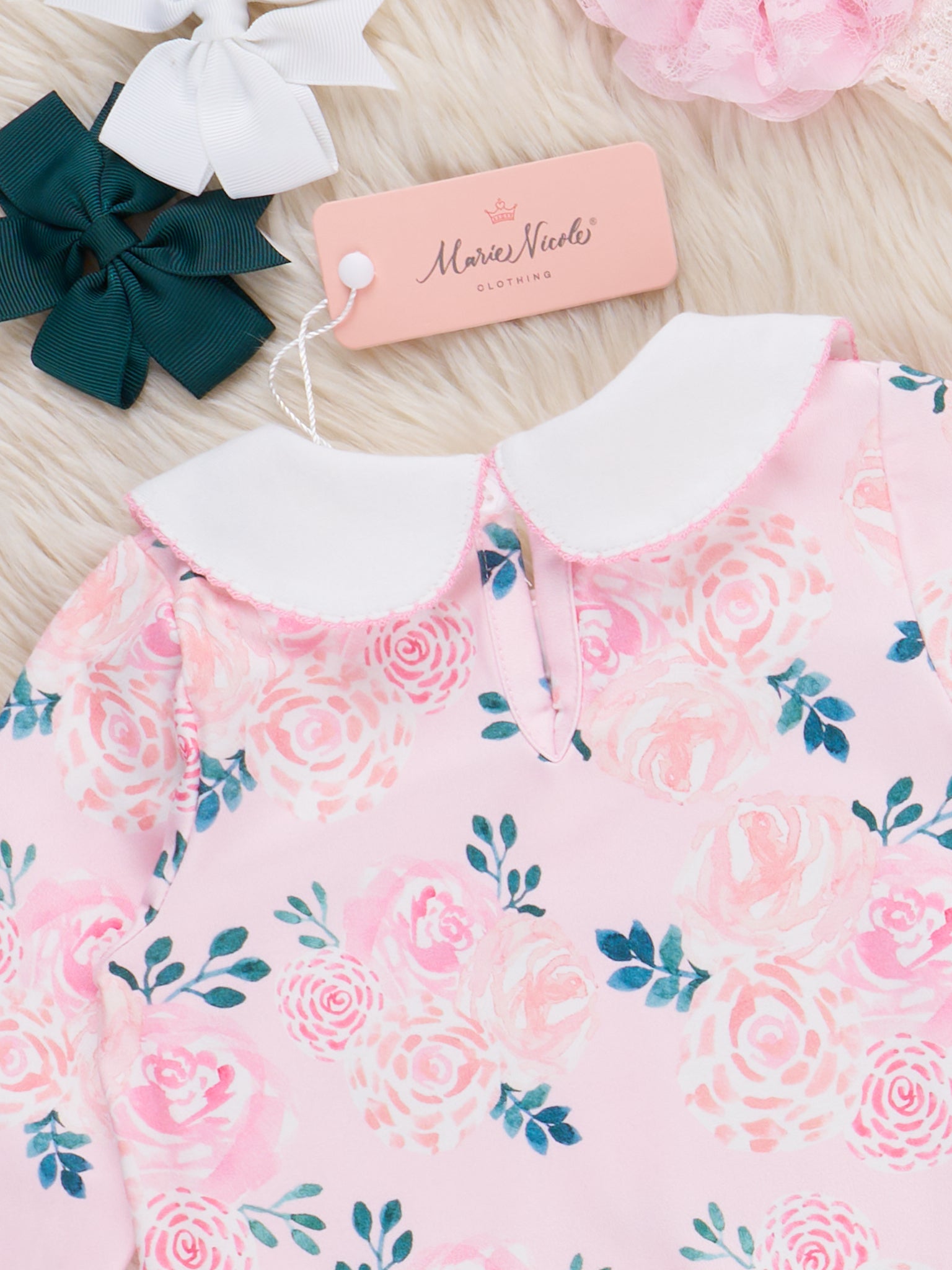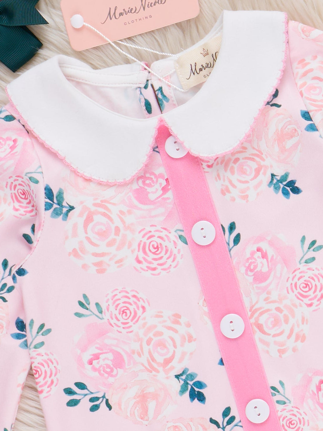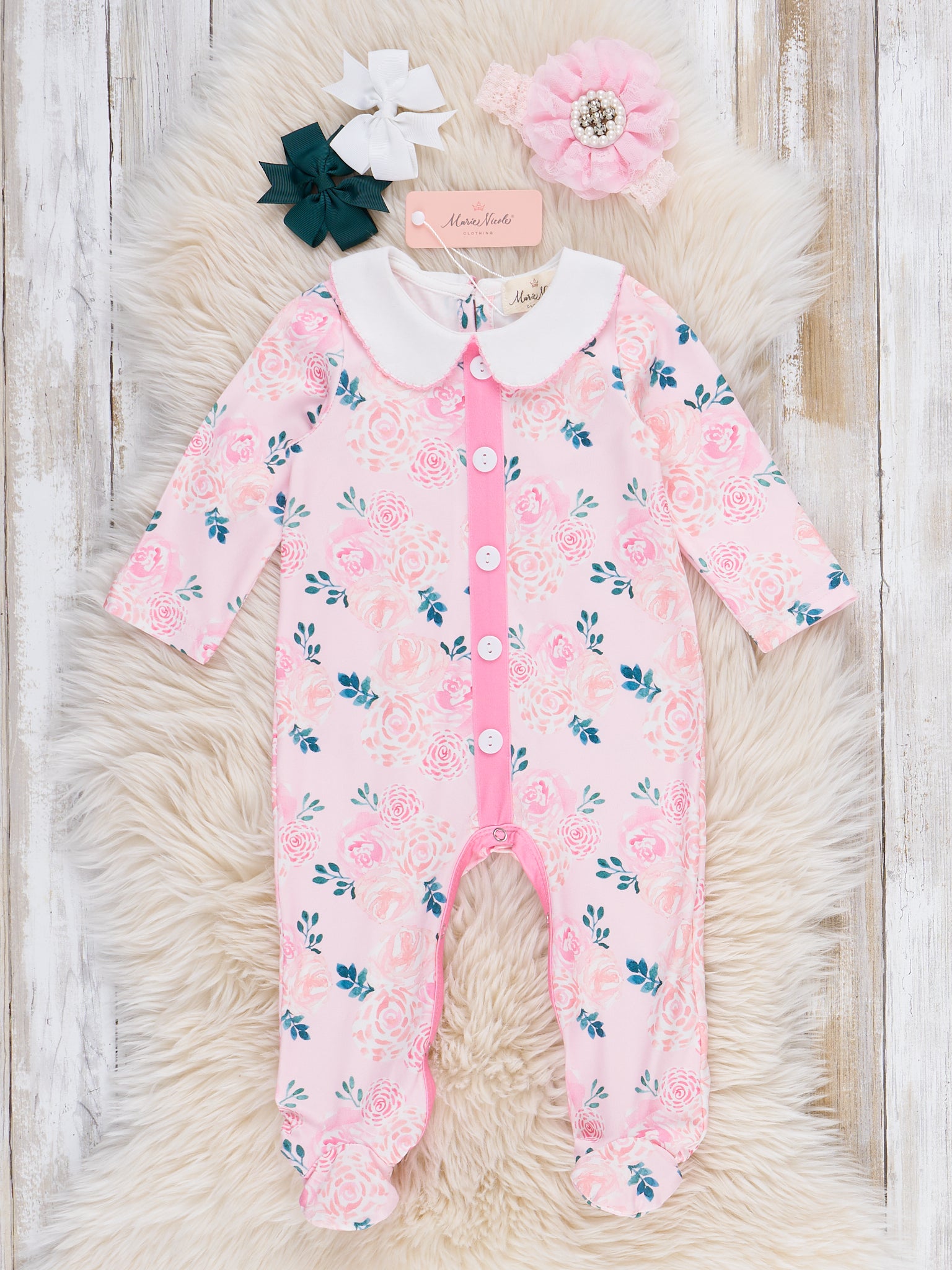 The Petal Soft Footed Sleeper Pajamas by Marie Nicole Clothing offer cozy, all-over floral prints and gentle, stretchy fabric for restful nights and sweet dreams. Featuring a delicate collar and easy snap closure, these pajamas keep little ones snug, stylish, and comfortable throughout bedtime routines.
