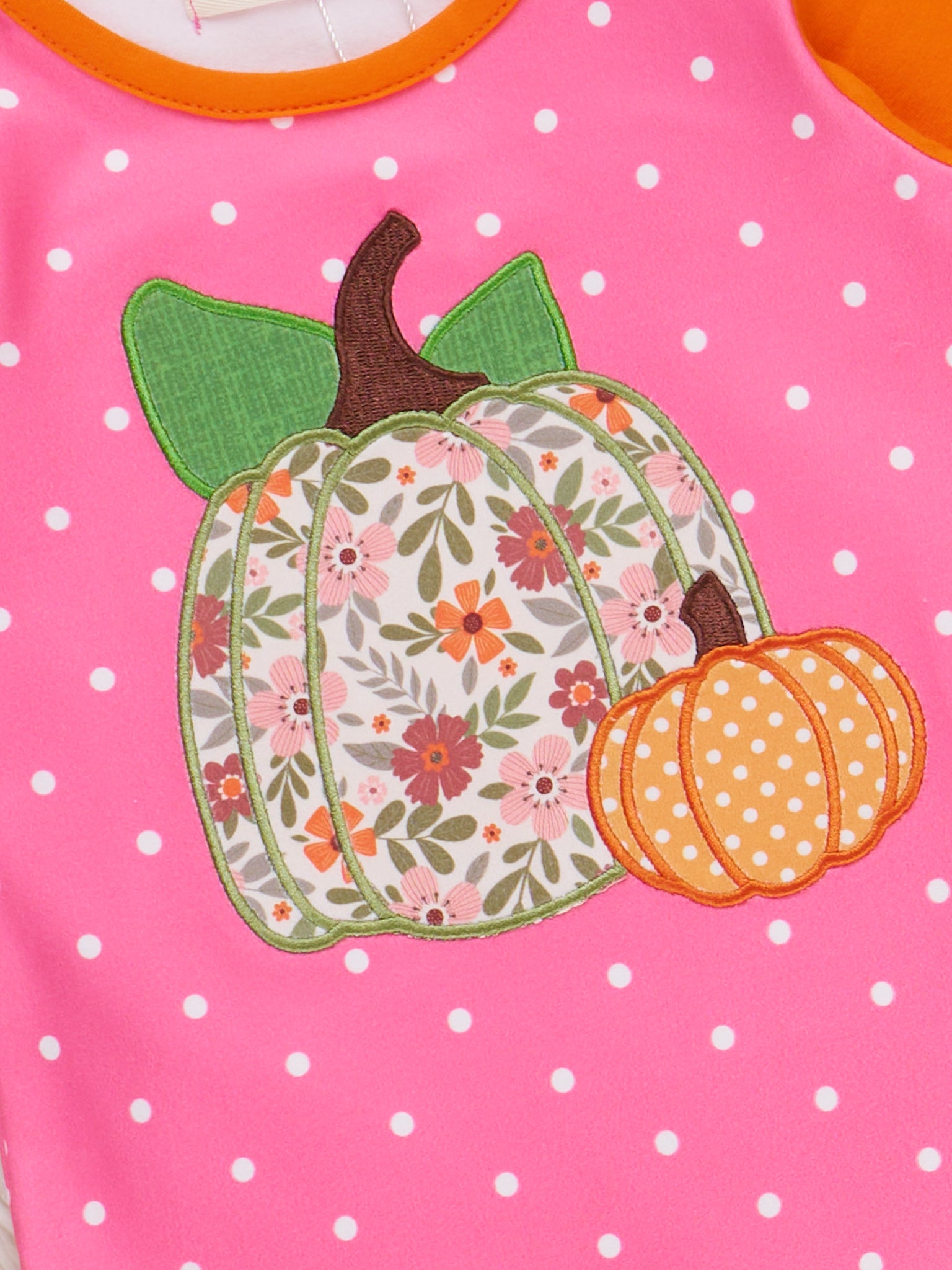 The Pumpkin Lane Ruffle Romper by Marie Nicole Clothing features a sweet pumpkin appliqué and polka dot print, finished with layered ruffle details at the cuffs and legs. This cozy one-piece is perfect for fall outings, playful days, and capturing festive autumn memories.