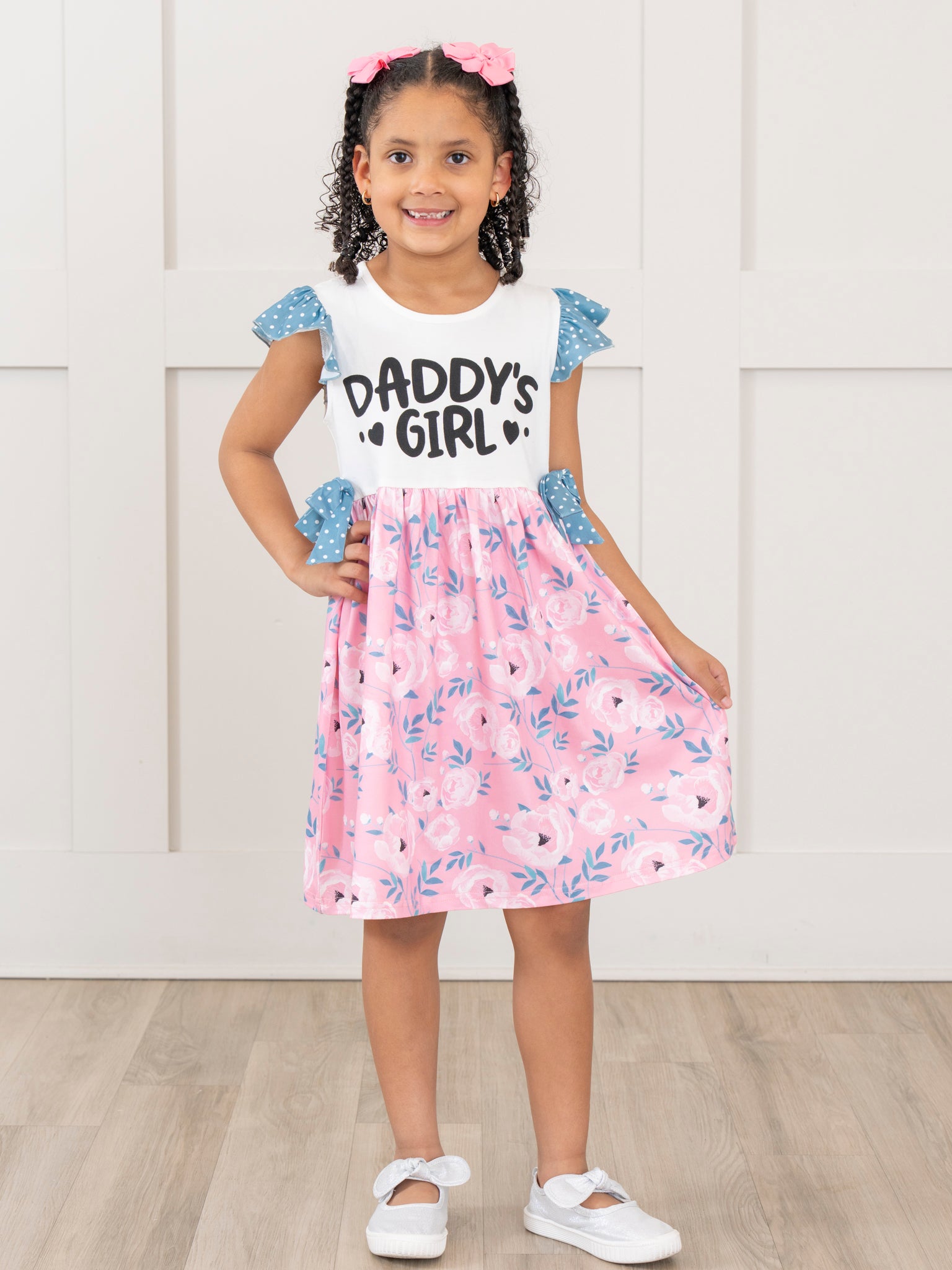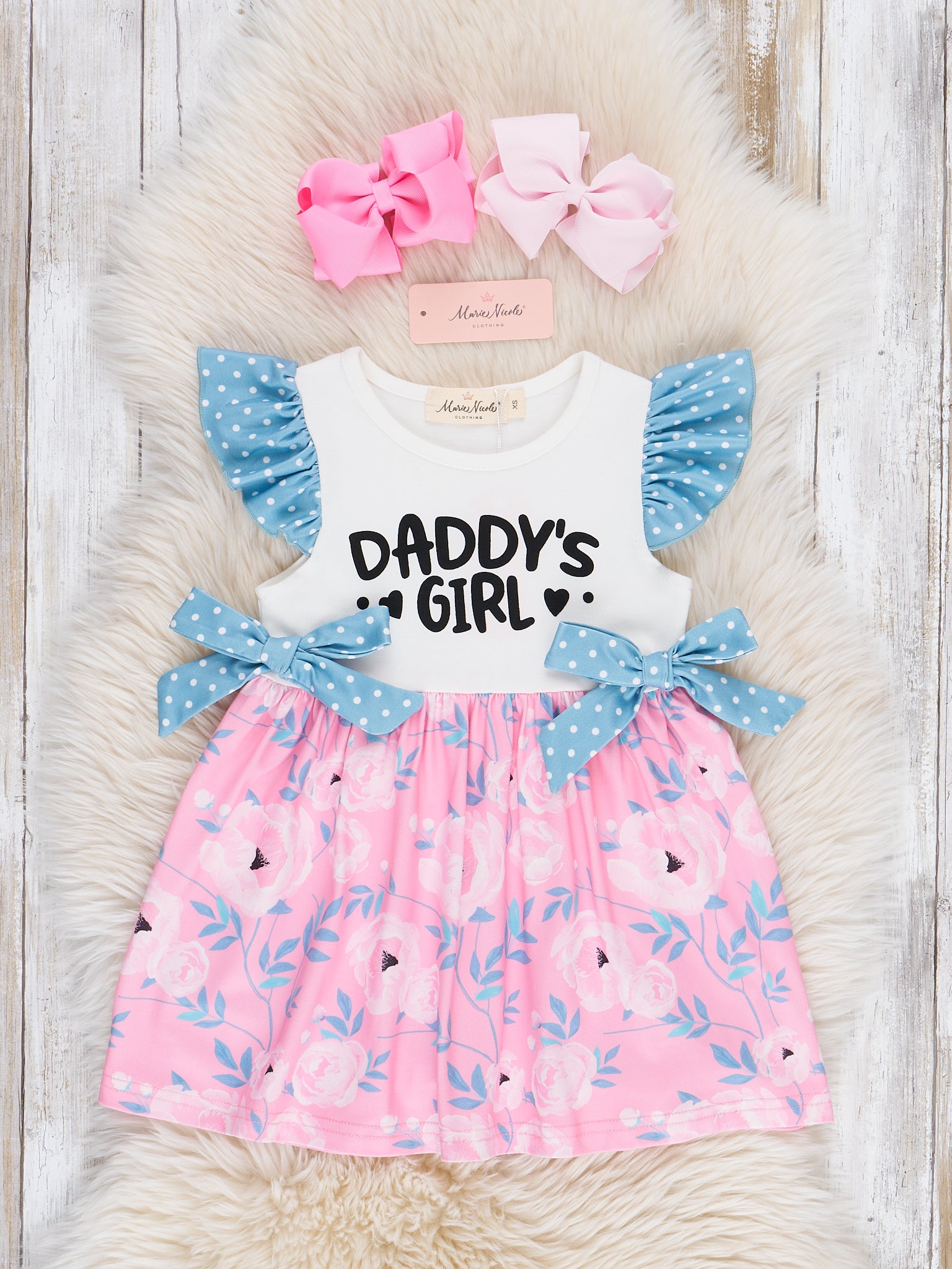 Get ready for spring with the Daddy's Girl Rose Garden Ruffle Dress! This girls dress from Marie Nicole Clothing is perfect for a sibling set, featuring a printed "Daddy's Girl" design and a playful rose garden printed skirt. The blue ruffle and bow trim add a charming touch.