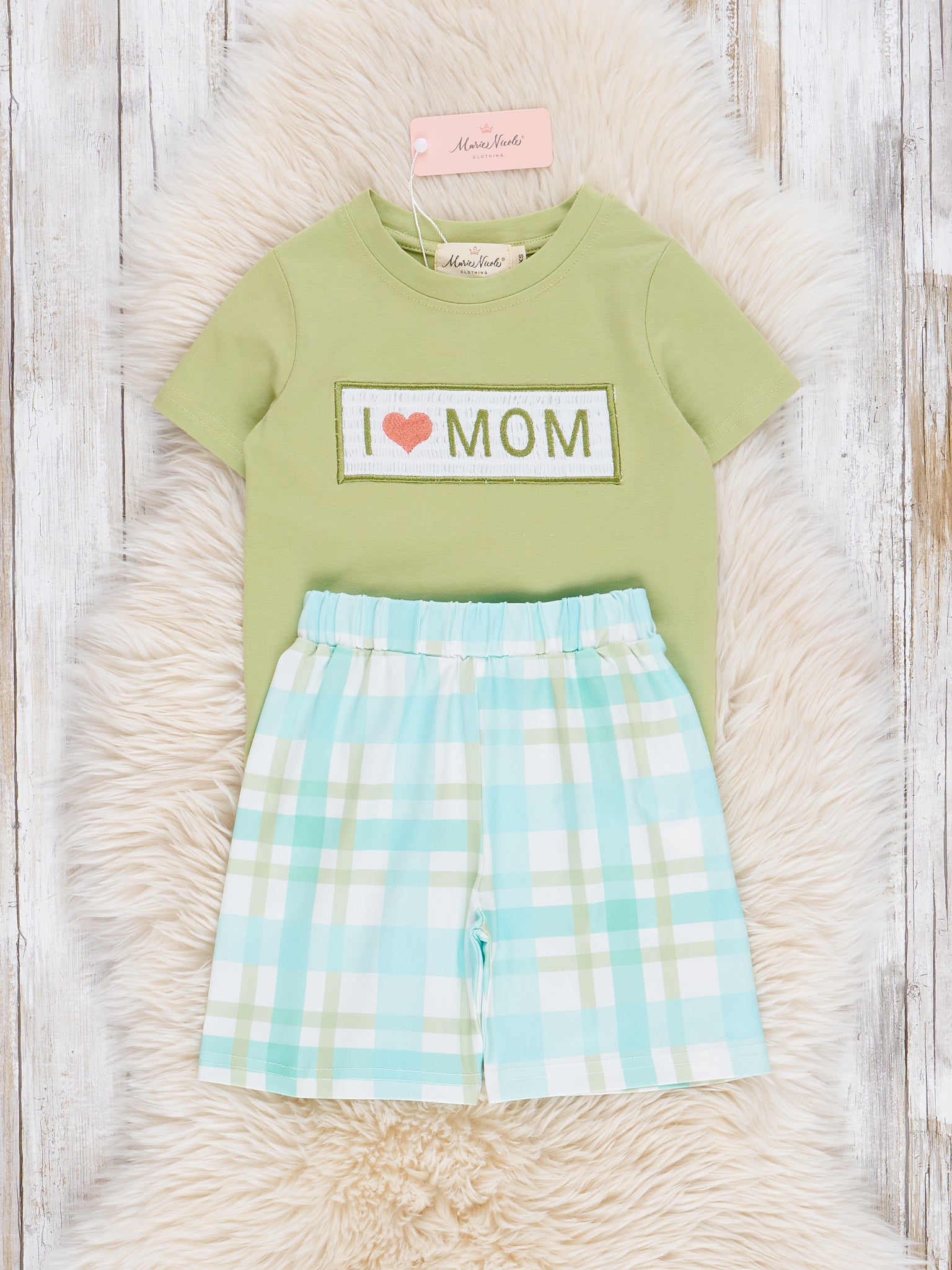 Get your little man ready for summer with this adorable I ❤️ MOM outfit! Perfect for family gatherings, this green shirt and blue plaid shorts set features embroidered detailing and a smocked design. A must-have for siblings, from the playful minds at Marie Nicole Clothing.