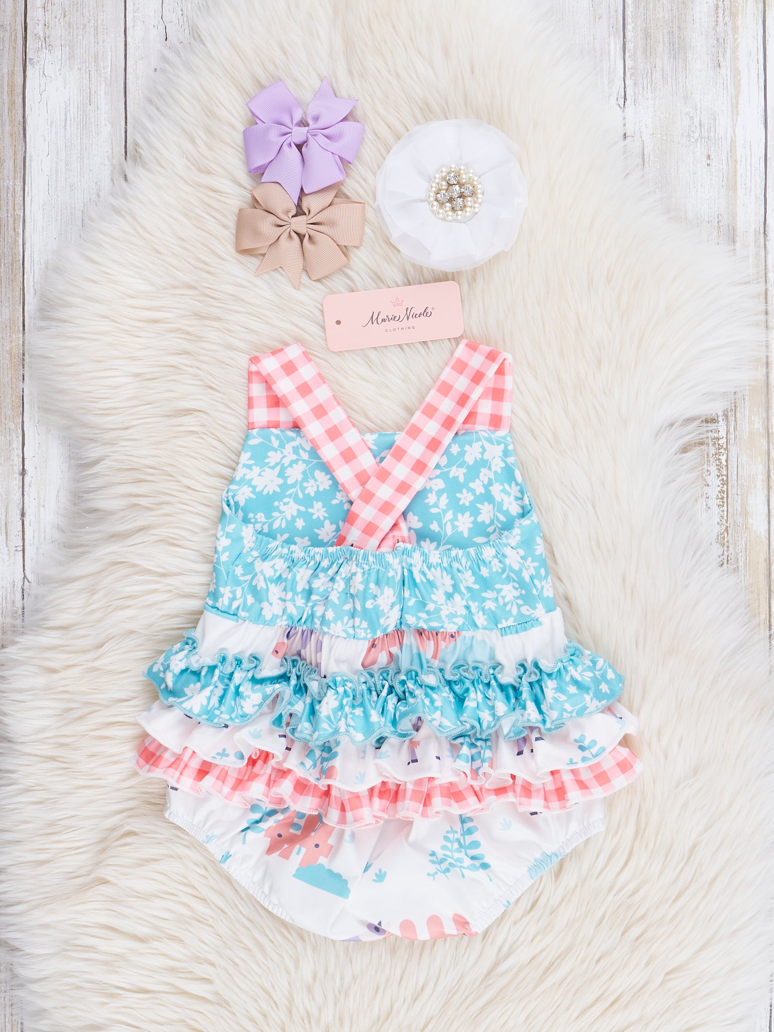 This charming bubble combines country charm with floral flair. The red gingham trim  accents a colorful floral bodice featuring cute farm friends. Complete with a playful ruffle hem, this bubble is perfect for the free-spirited fashionista. Yeehaw! Shop the complete sister set!