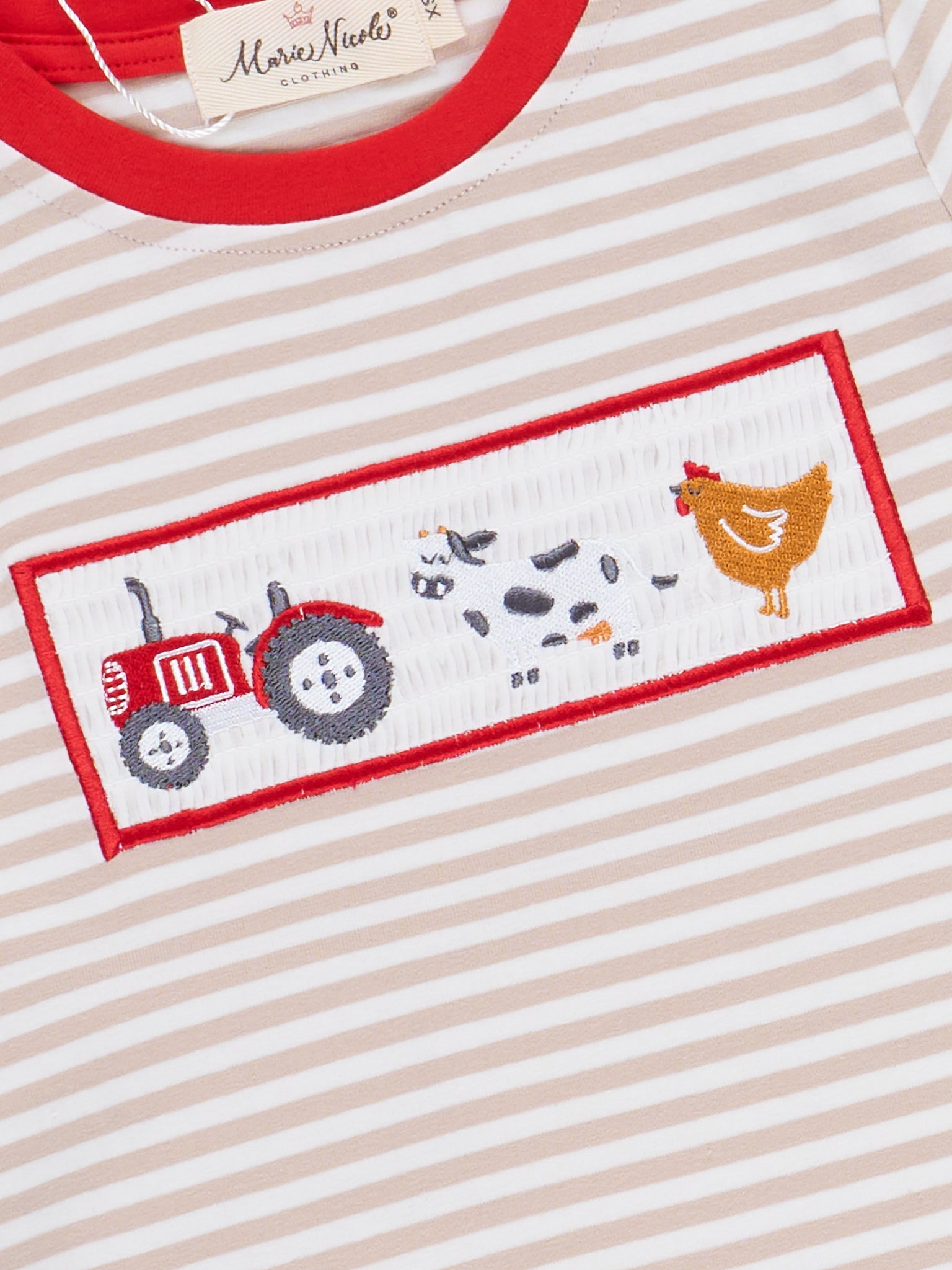 The Farm Friends Smocked Romper is a fun and charming romper by Marie Nicole Clothing. Featuring a playful striped pattern with adorable farm embroidery. Perfect for casual outings or everyday play, this romper combines style, comfort, and a bit of country charm!