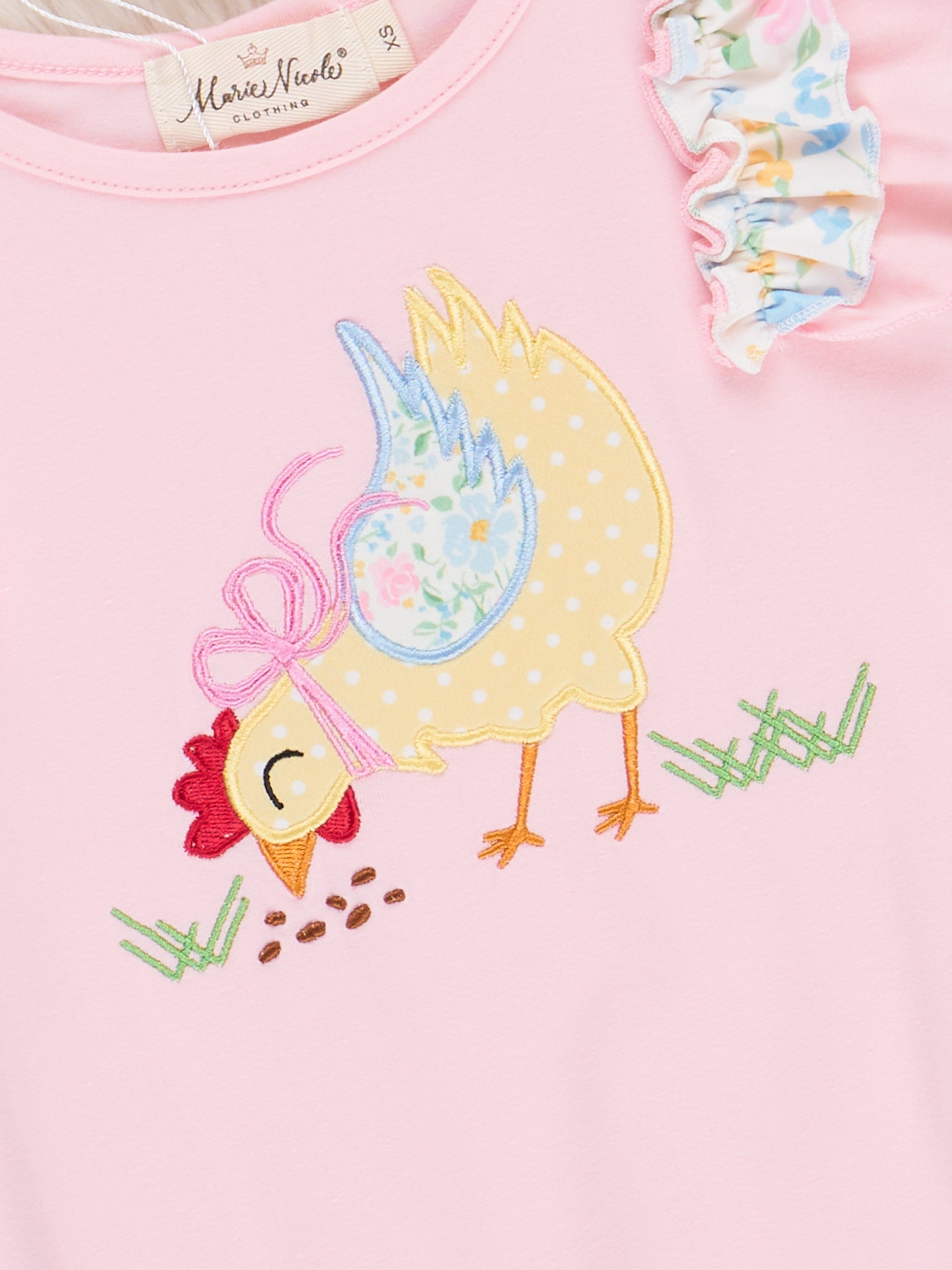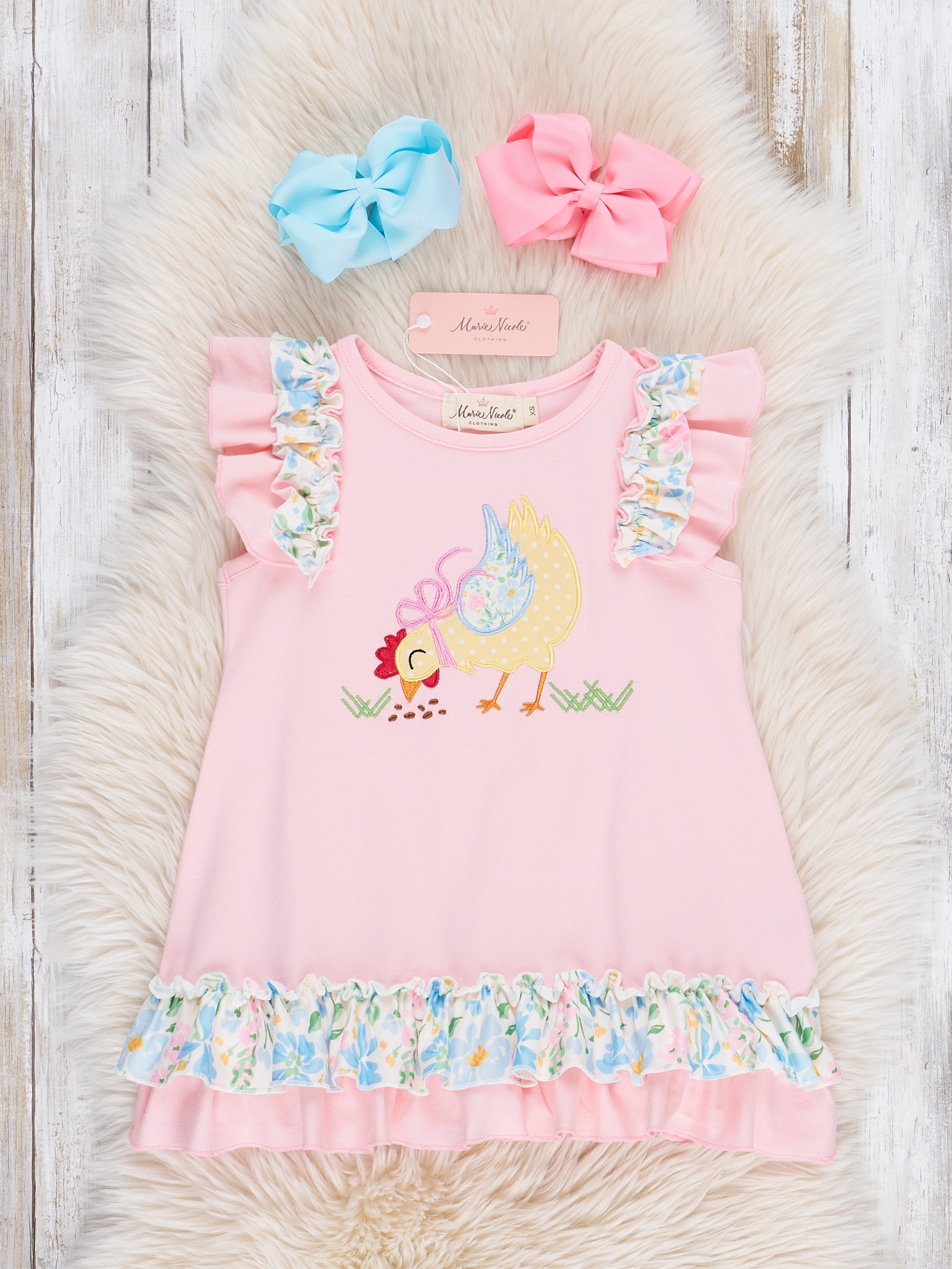 Bring a touch of farmyard charm to her day with the Grazing Hen Embroidered Ruffle Dress from Marie Nicole Clothing. Featuring delicate hen embroidery and sweet ruffle accents, this dress blends whimsy with comfort for everyday play or special outings. It's a chirping cute look she’ll love to wear!