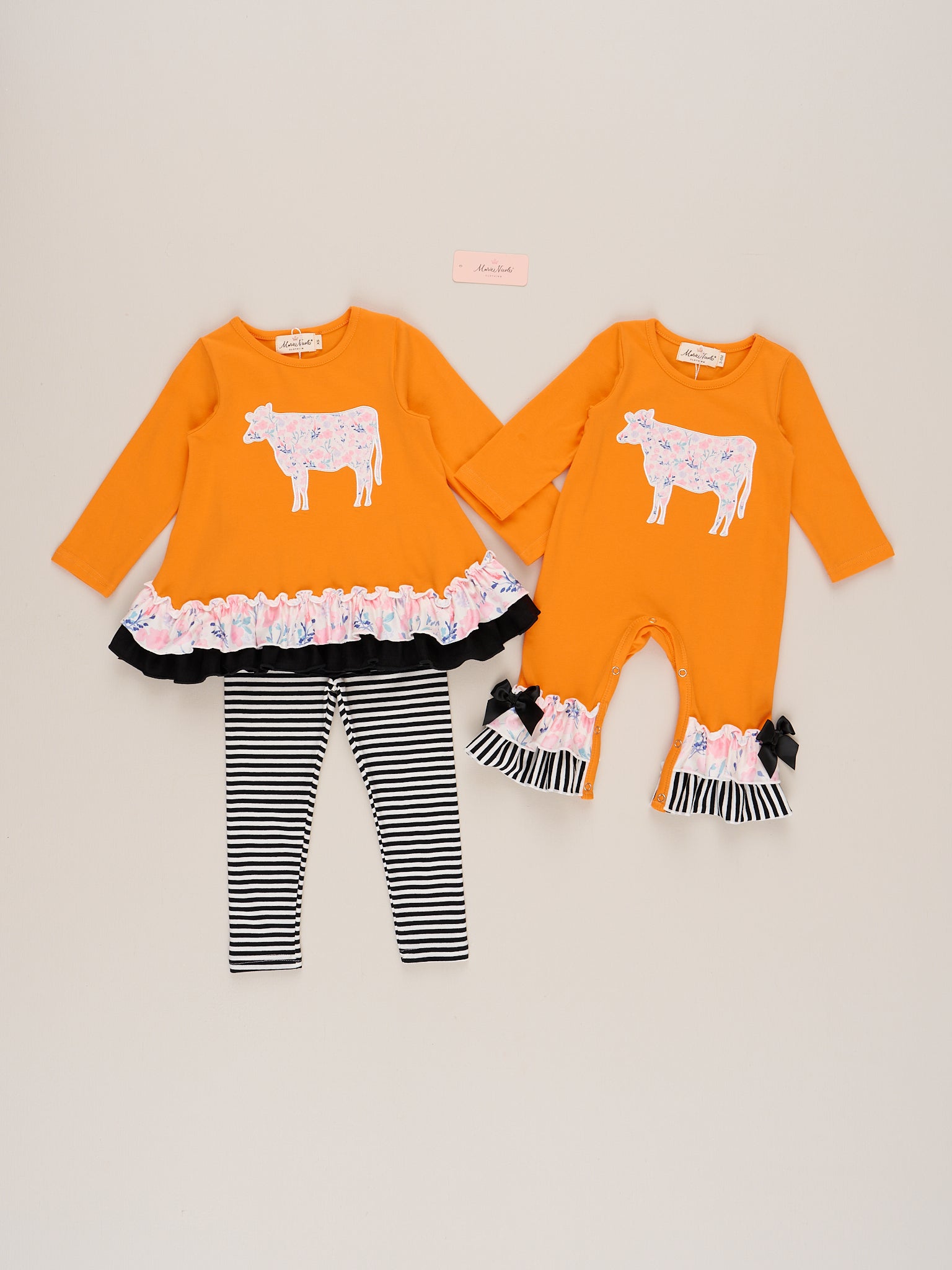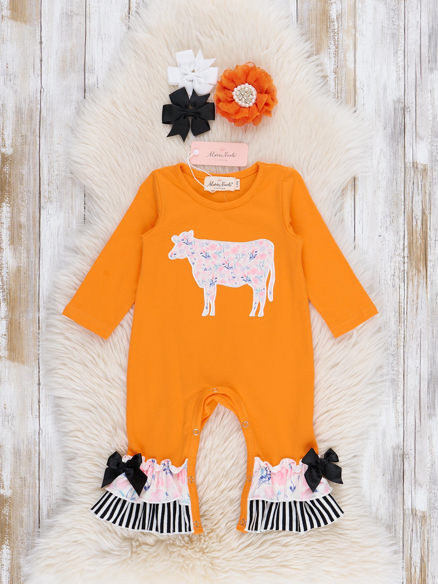 The Pasture Pal Embroidered Ruffle Cow Romper is an adorable and playful set perfect for little farm lovers. Featuring charming cow embroidery and sweet ruffle details, this romper from Marie Nicole Clothing combines cozy comfort with whimsical style. Made from soft, breathable fabric, it’s ideal for playdates, family outings, or any day she wants to show off her love for the barnyard.
