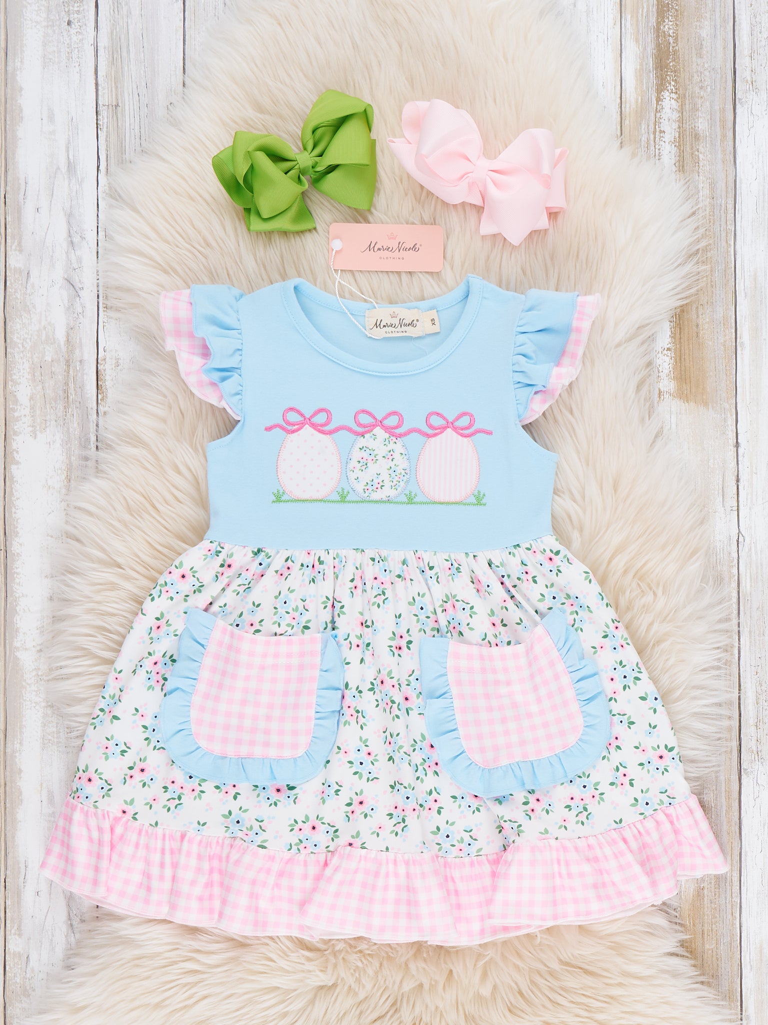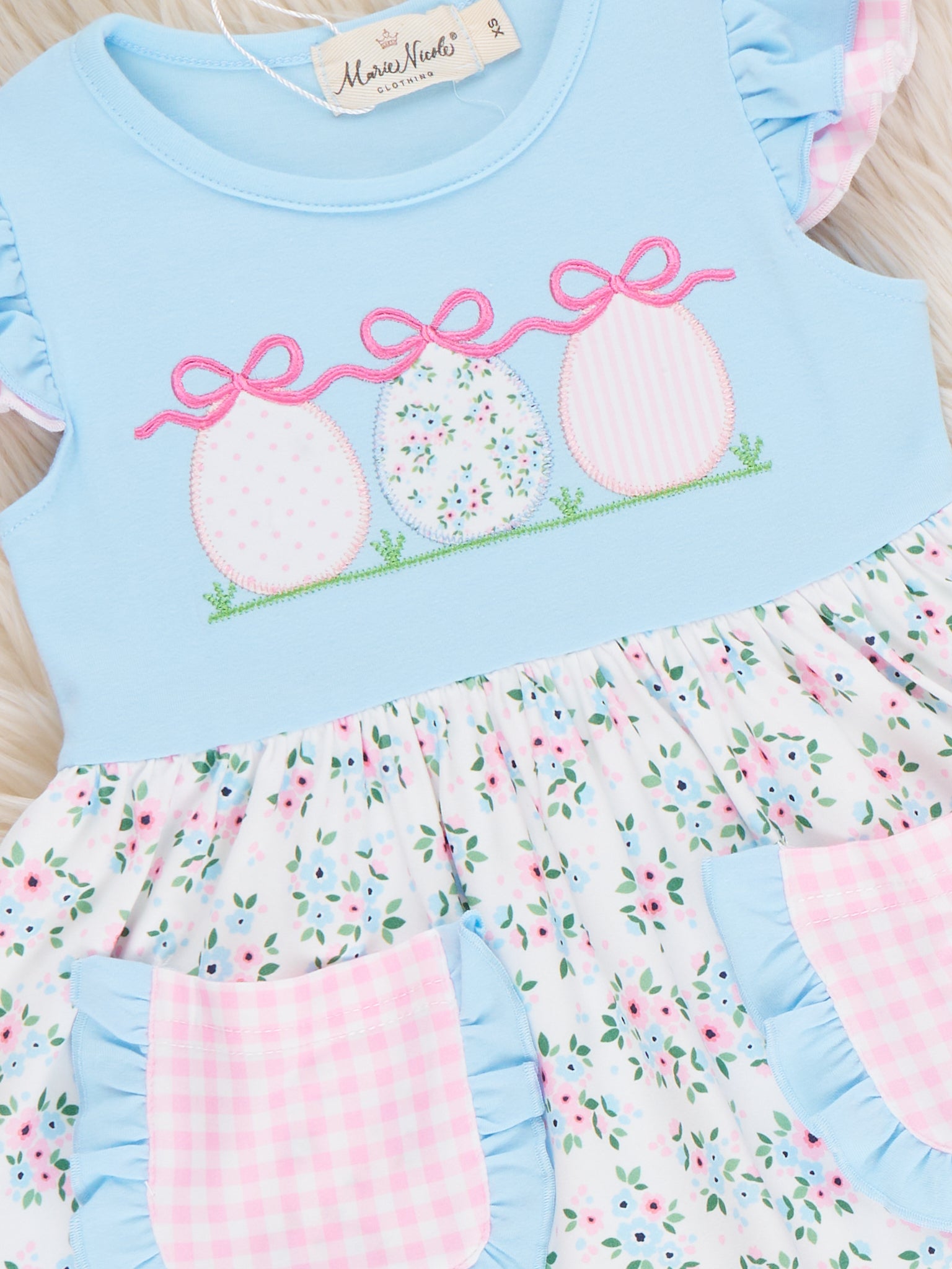 Ribbons & Eggs Garden Embroidered Ruffle Dress by Marie Nicole Clothing features flutter sleeves, a bodice with delicately embroidered and appliqued Easter eggs and bows, playful contrasting pockets, and a ruffle hem. The gathered skirt is adorned with a floral and gingham mix, creating a cheerful and twirl-ready silhouette. This dress is perfect for spring festivities, egg hunts, and garden parties, blending classic embroidery with modern cottage charm for little ones.