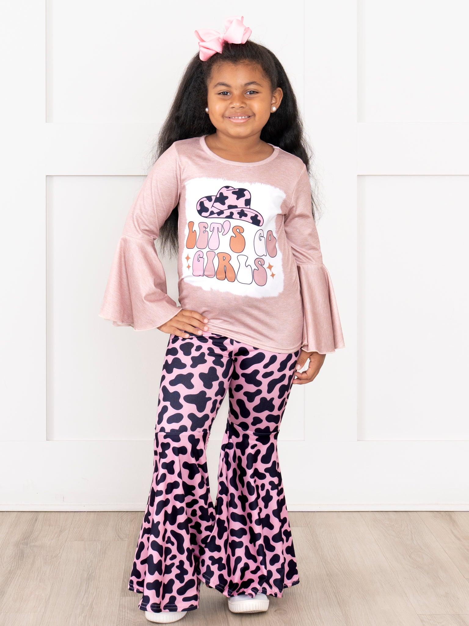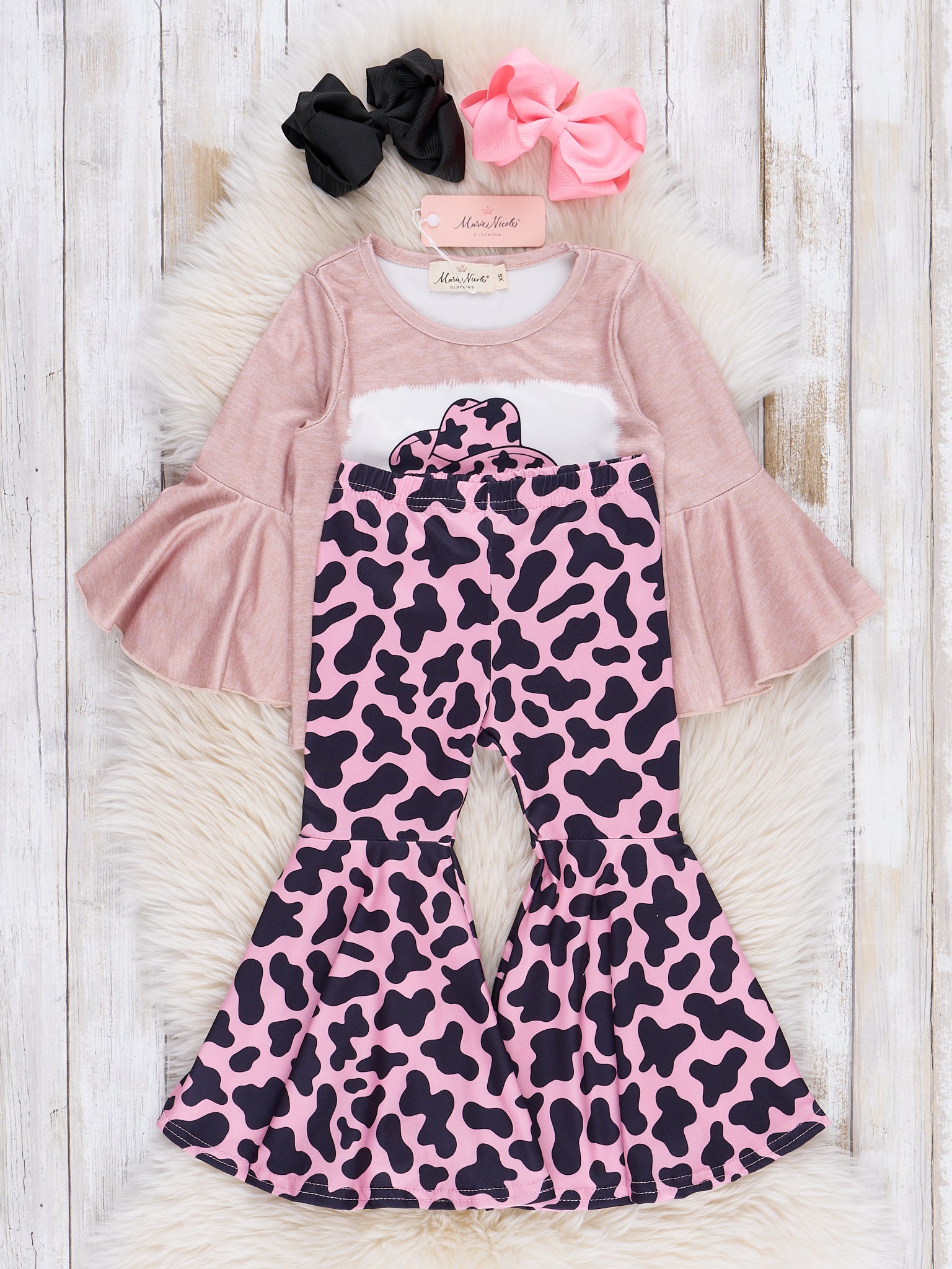 Let's Go Girls! This country cowgirl outfit by Marie Nicole Clothing features a tan bell sleeve top with scoop neck and pink & black cow print bell bottoms!