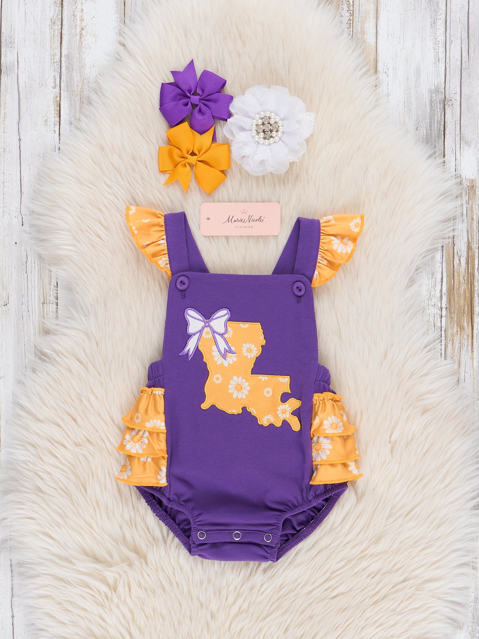 The Louisiana Embroidered Floral Ruffle Bubble is a bright and playful and perfect for sunny days and sweet adventures. Featuring a bold purple color with ruffled floral sleeves and a charming Tennessee applique, this outfit from Marie Nicole Clothing is ideal for warm weather, family outings, or cheering on your favorite team in style—perfect for game day spirit!