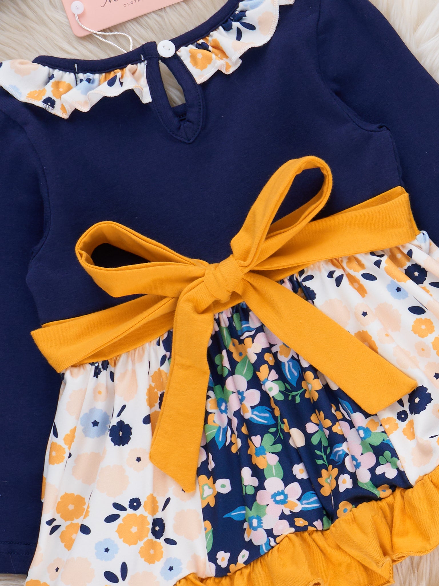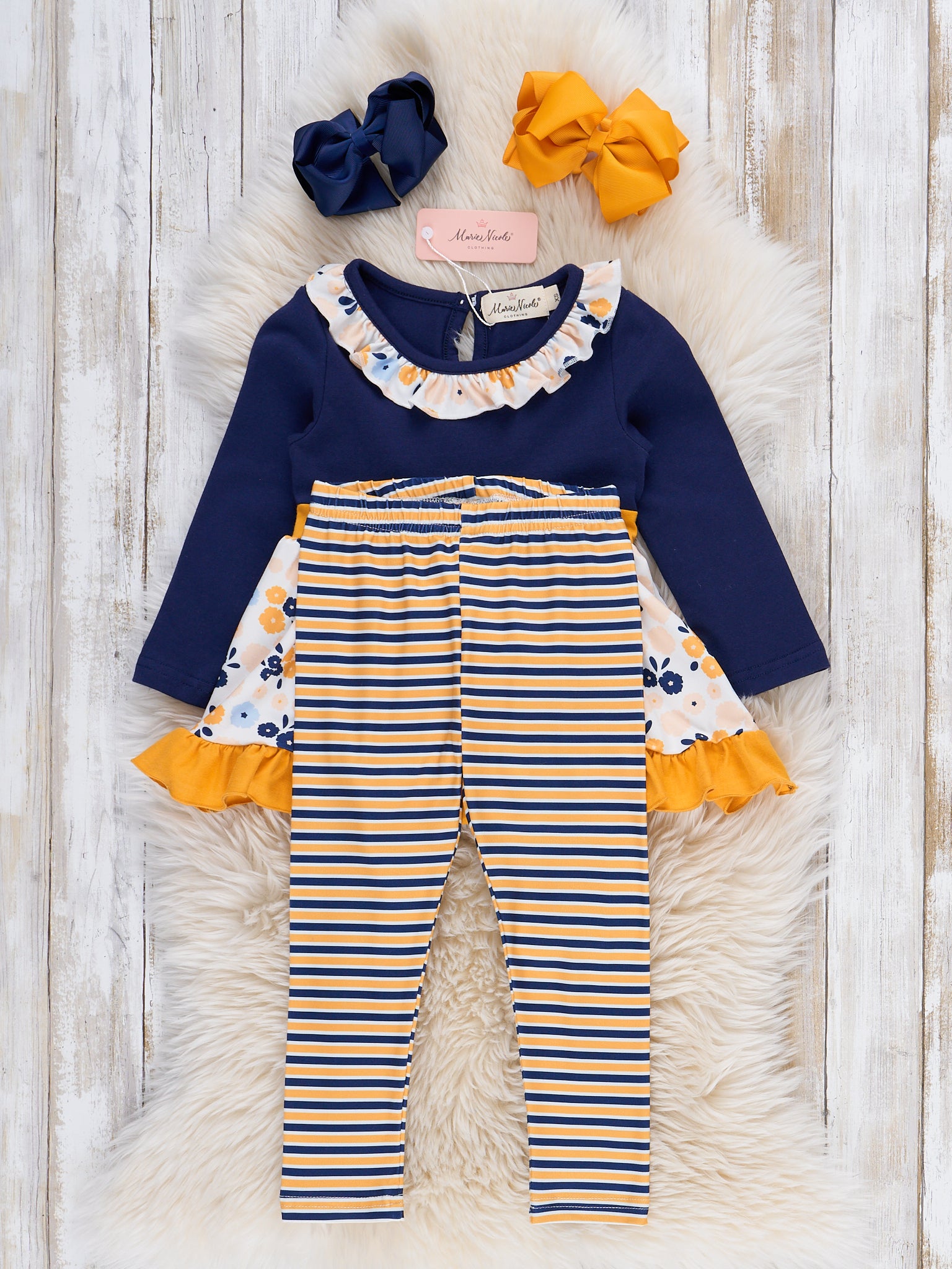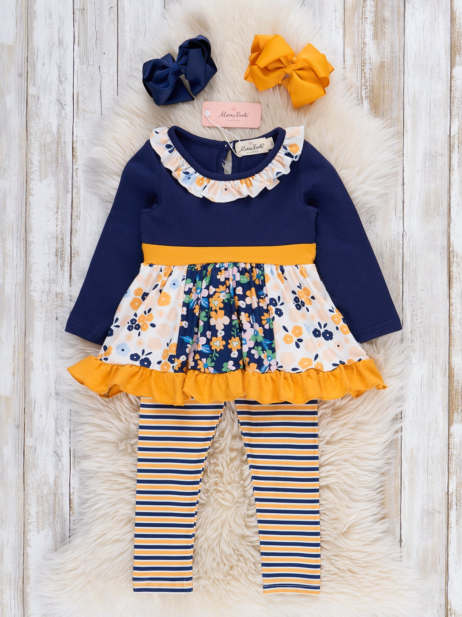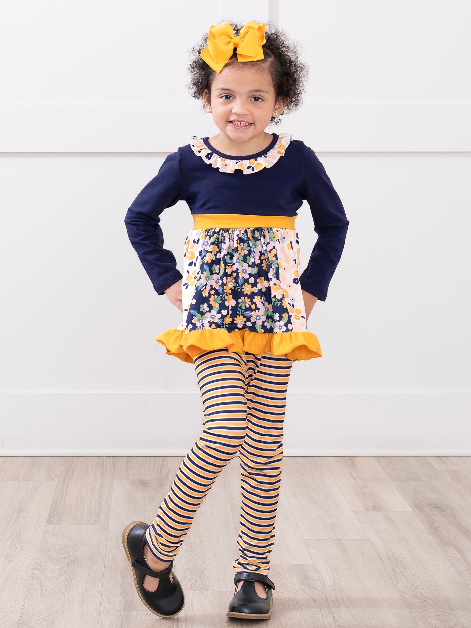 The Midnight Blooms Ruffle Outfit by Marie Nicole includes a long-sleeve peplum top with a playful ruffle collar, sash ties, and a layered floral skirt-like hem. The coordinating striped leggings complete this cheerful set, perfect for lively days and sweet occasions
