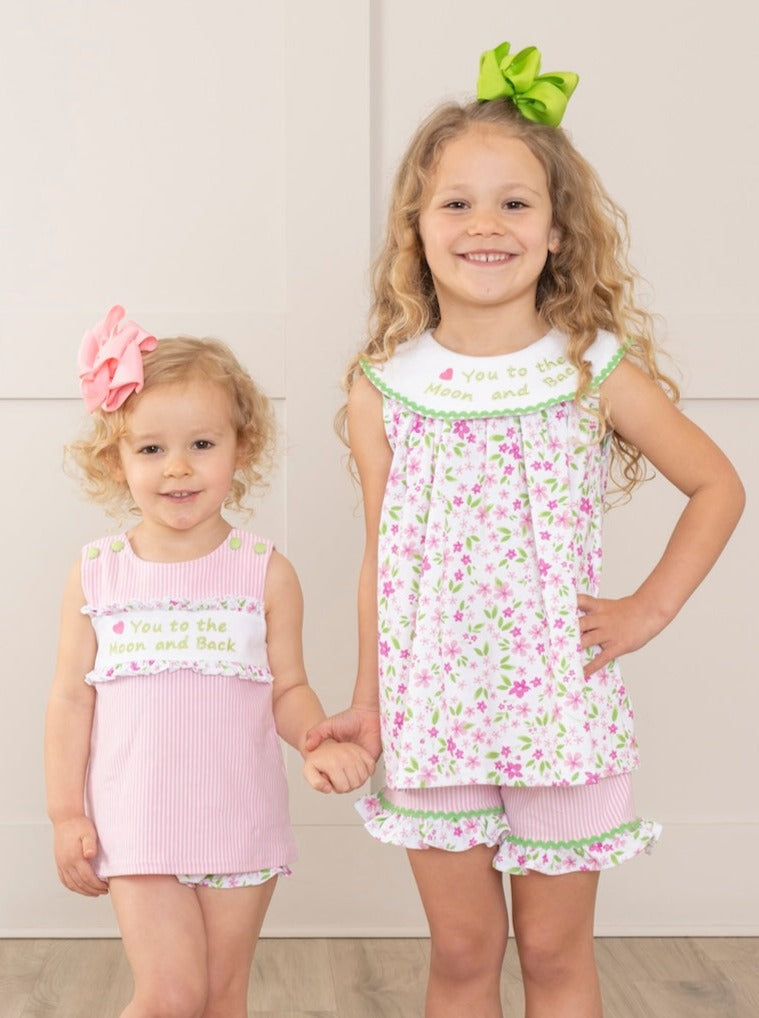 The perfect outfit for your little one's next adventure! This girls' bloomers set features a pink striped top with green button detail & a loving green embroidered message of "🩷 You to the Moon and Back". Complete with matching pink floral bloomers, this outfit is a perfect representation of family love.