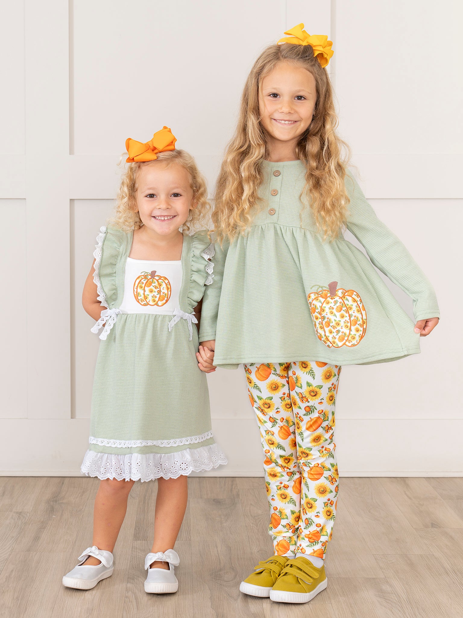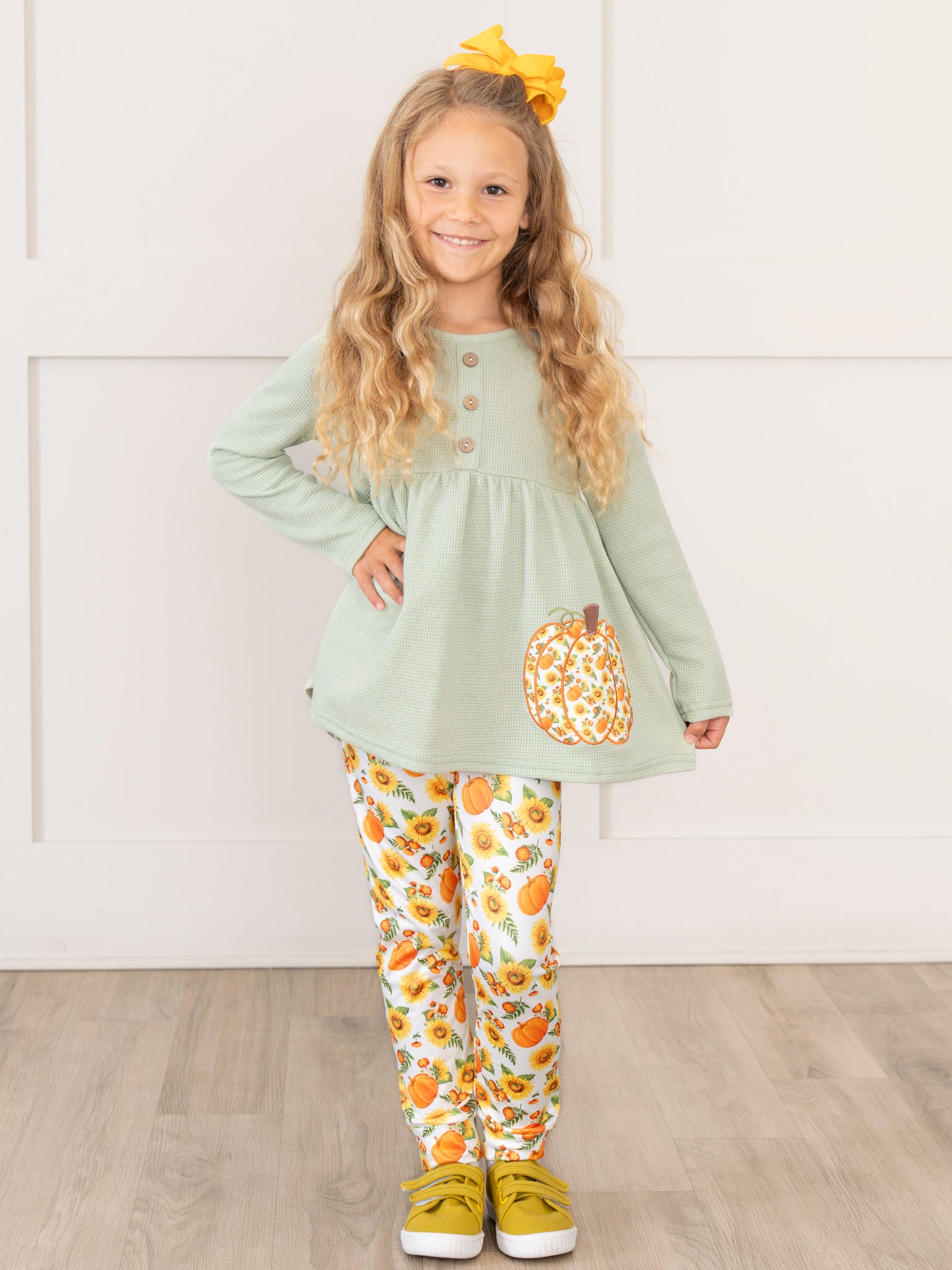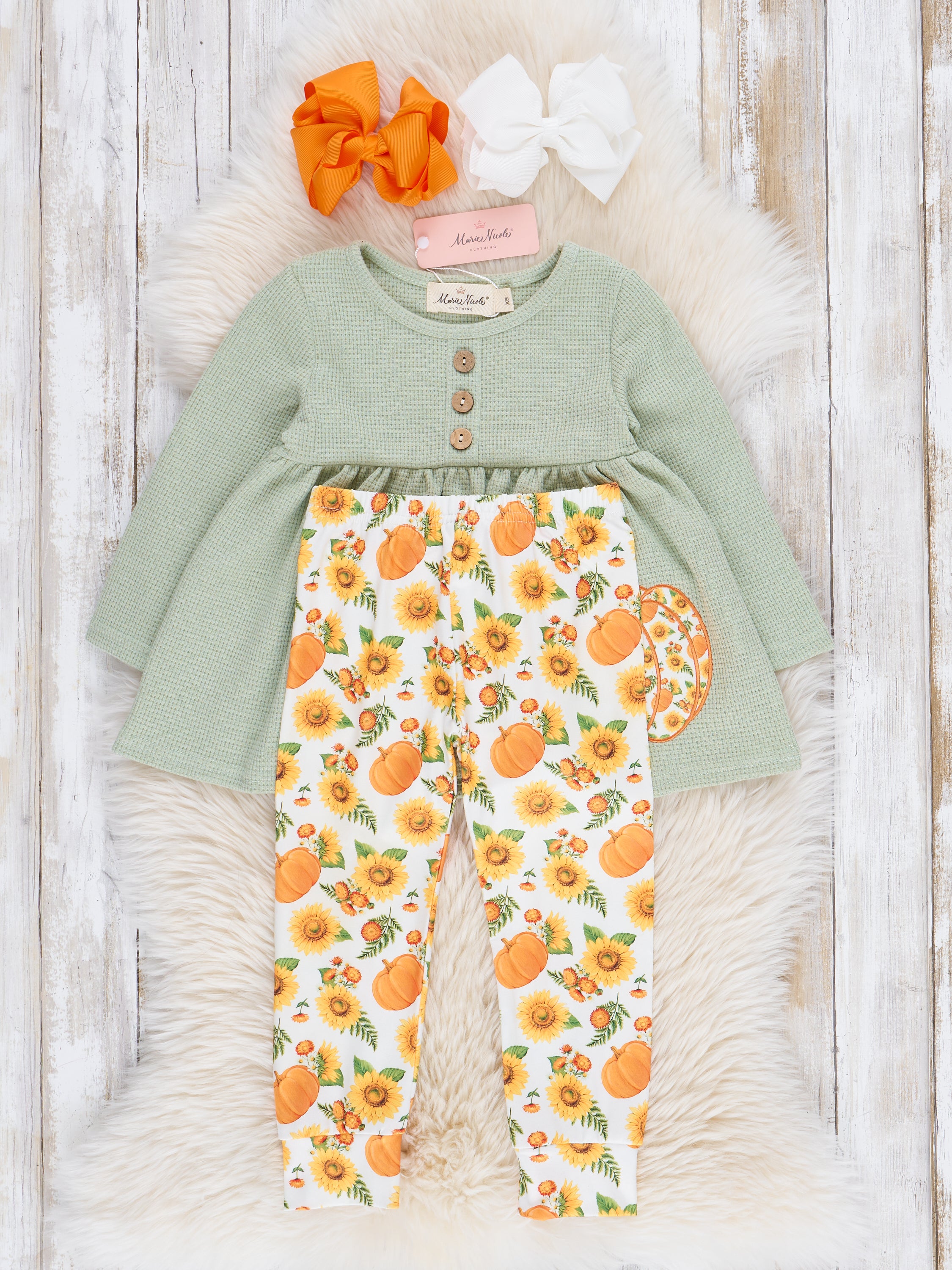Your minis will bloom in this sister set. Perfect for a trip to the pumpkin patch, this girls outfit features a waffle knit top in a serene shade of sage, with charming pumpkin accents and matching leggings. Perfect for any autumn occasion!