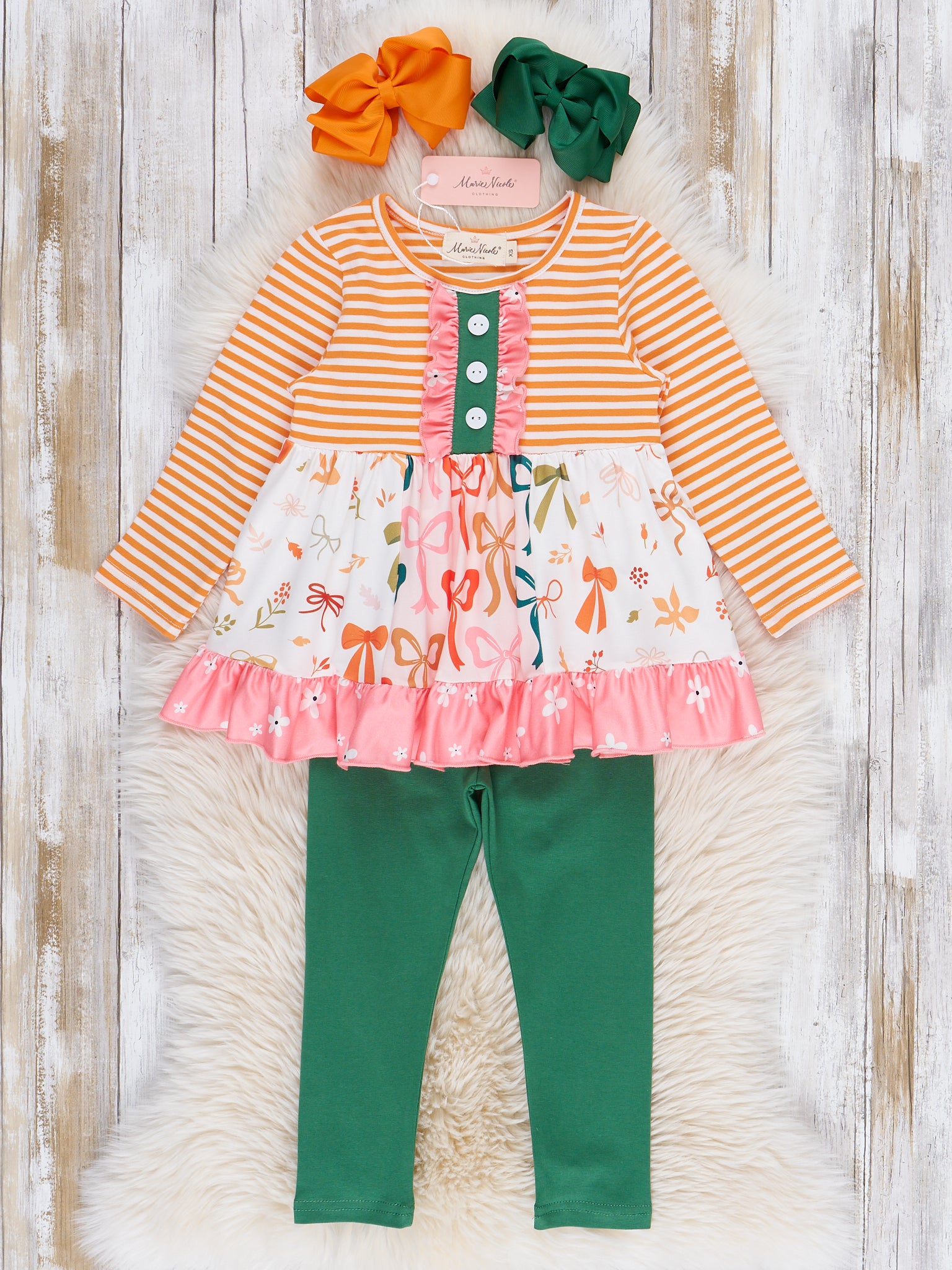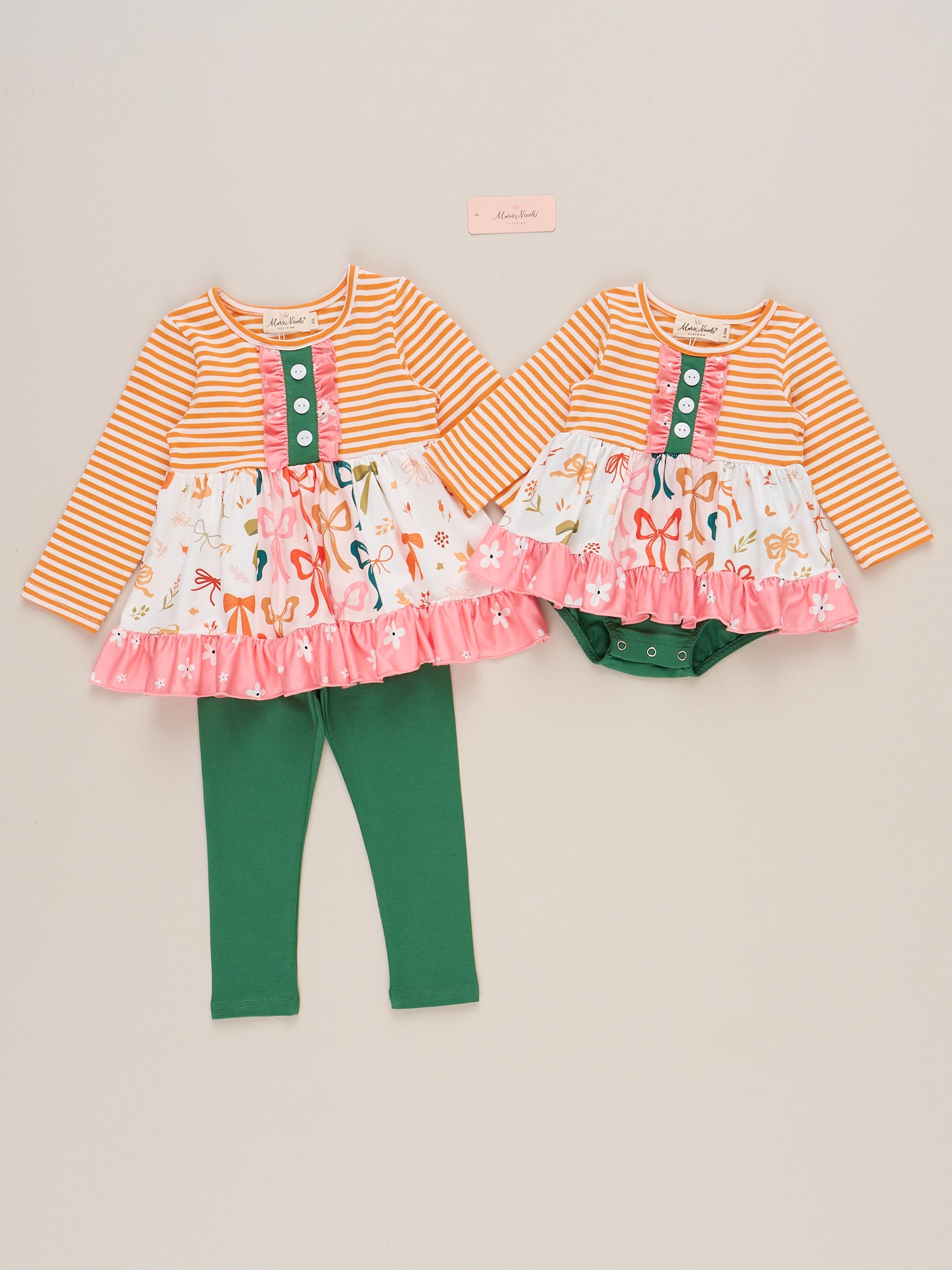 The Stripes & Bows Ruffle Outfit is a sweet and stylish staple for warm-weather days and playful adventures. Featuring classic stripes, charming bow print, and delicate ruffle details, this outfit from Marie Nicole Clothing blends timeless design with everyday comfort. Soft, breathable, and made for easy movement, it’s perfect for everything from playdates to picture-perfect moments.