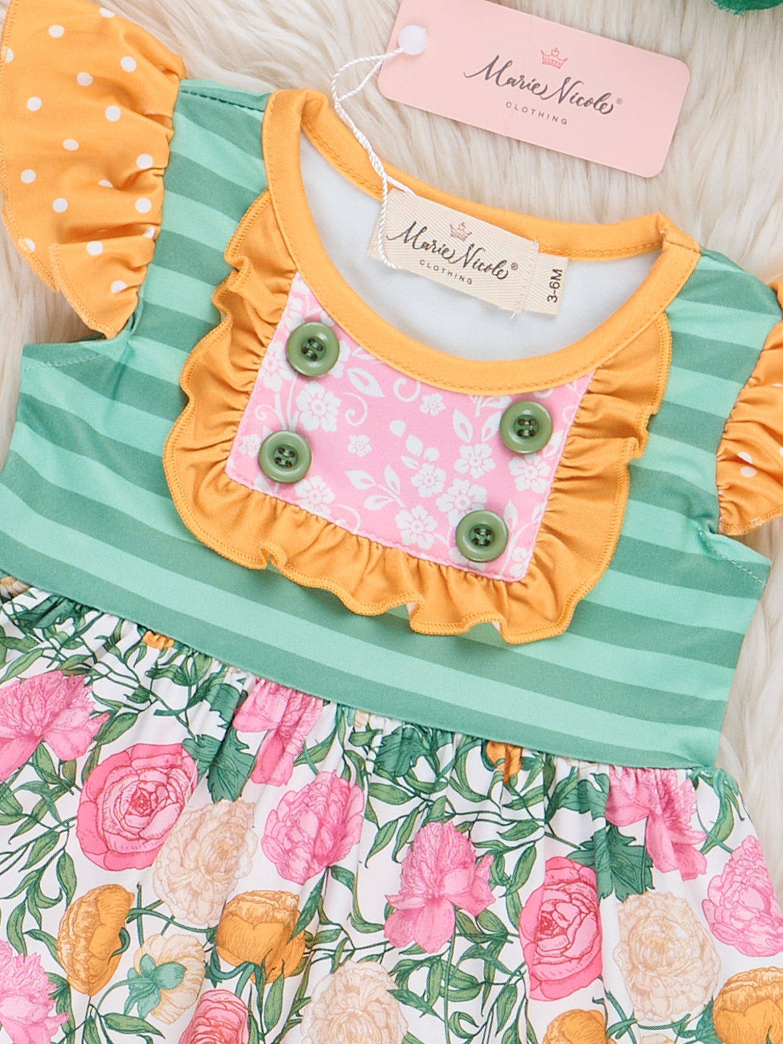 Garden parties just got a whole lot cuter with our Sweet Blooms Floral Ruffle Bubble! This girls' bubble features a fun rose garden print overlay, with a stripe bodice and playful ruffle sleeve detail. The floral bubble detail adds an extra touch of sweetness. Designed by Marie Nicole Clothing, it's the perfect bubble for twinning with a sister!
