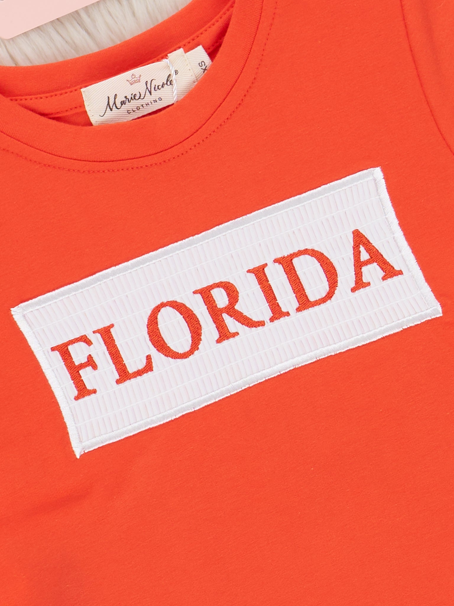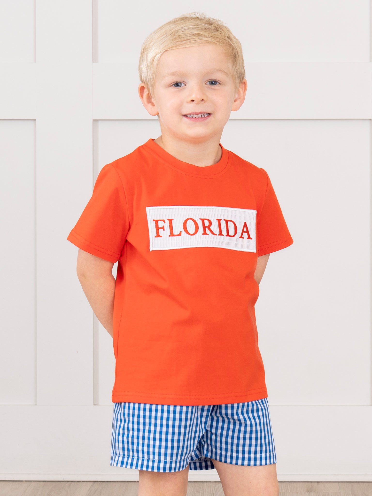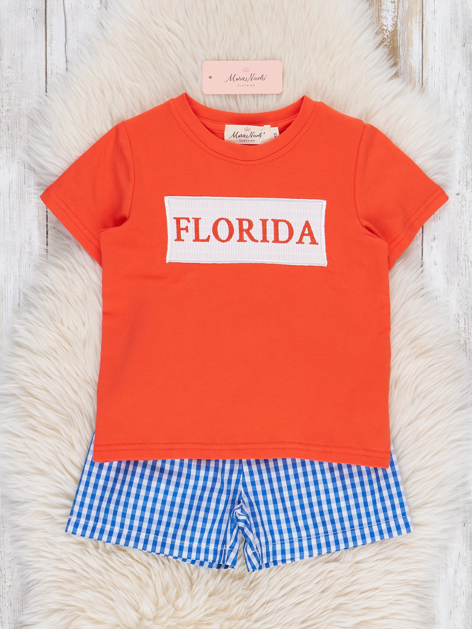 The Florida Smocked Gingham Outfit is a sweet and spirited look that’s perfect for your little fan. This two-piece set from Marie Nicole Clothing features a bright orange tee with a smocked “Florida” applique, paired with classic blue and white gingham shorts. Designed with breathable fabric and a comfortable fit, it’s ideal for warm-weather outings, tailgates, or cheering on the state in style. Southern charm and team pride come together in this adorable game day favorite.