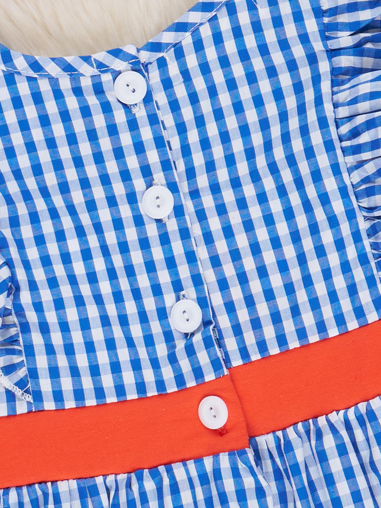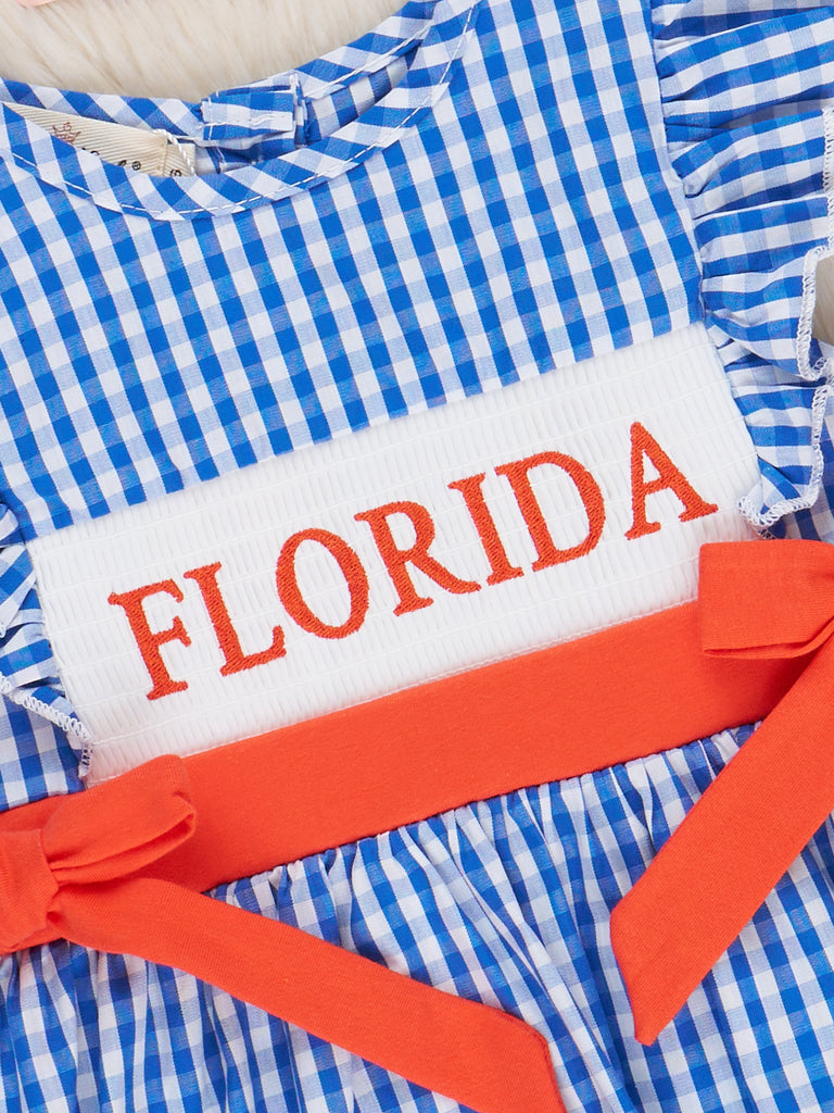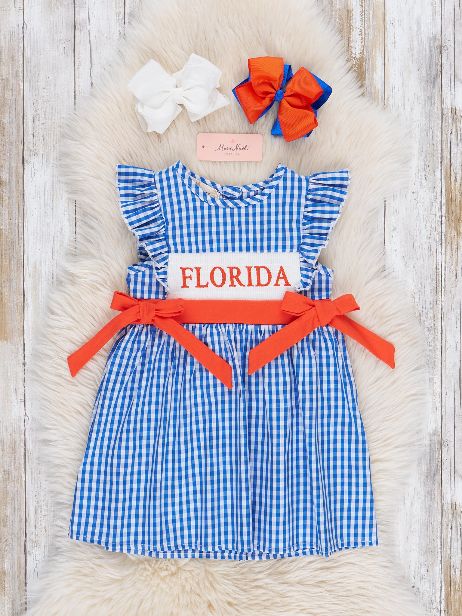 The Florida Smocked Gingham Dress is a darling combination of Southern charm and team spirit. Featuring a classic blue and white gingham pattern, sweet ruffle sleeves, and a smocked panel embroidered with “Florida,” this dress from Marie Nicole Clothing is perfect for game days, family gatherings, or sunny day adventures. Finished with bold orange waist ties for a polished look, it’s a spirited style your little fan will love to twirl in.