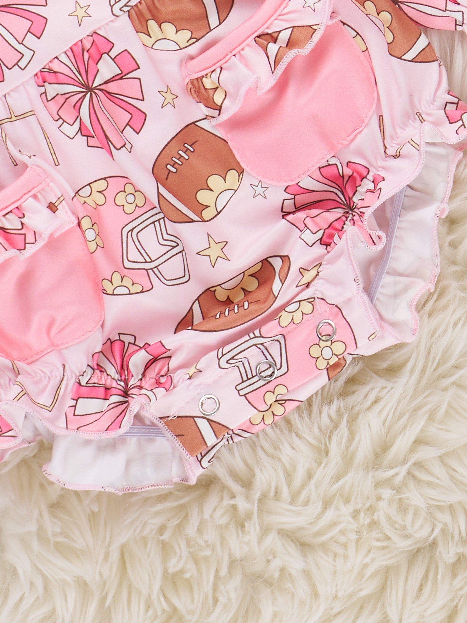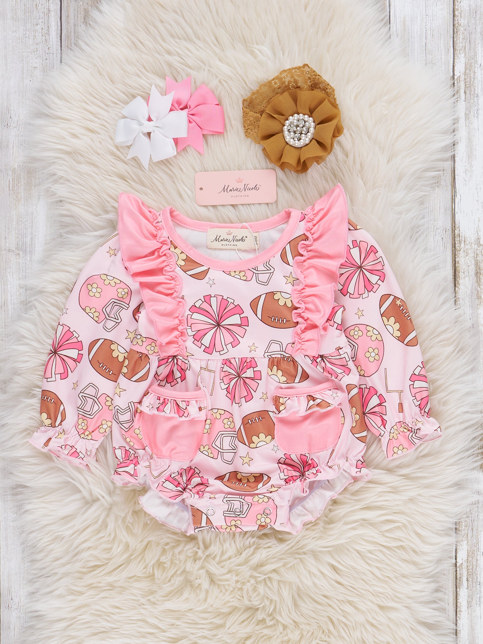 Time to cheer! The Sassy Snap Ruffle Dress, covered in a playful pattern of poms poms, footballs, and helmets, is the perfect piece for anyone excited for game day. With ruffle details and comfy, loose fabric, this piece by Marie Nicole Clothing, your little girl will love to cheer in this dress!