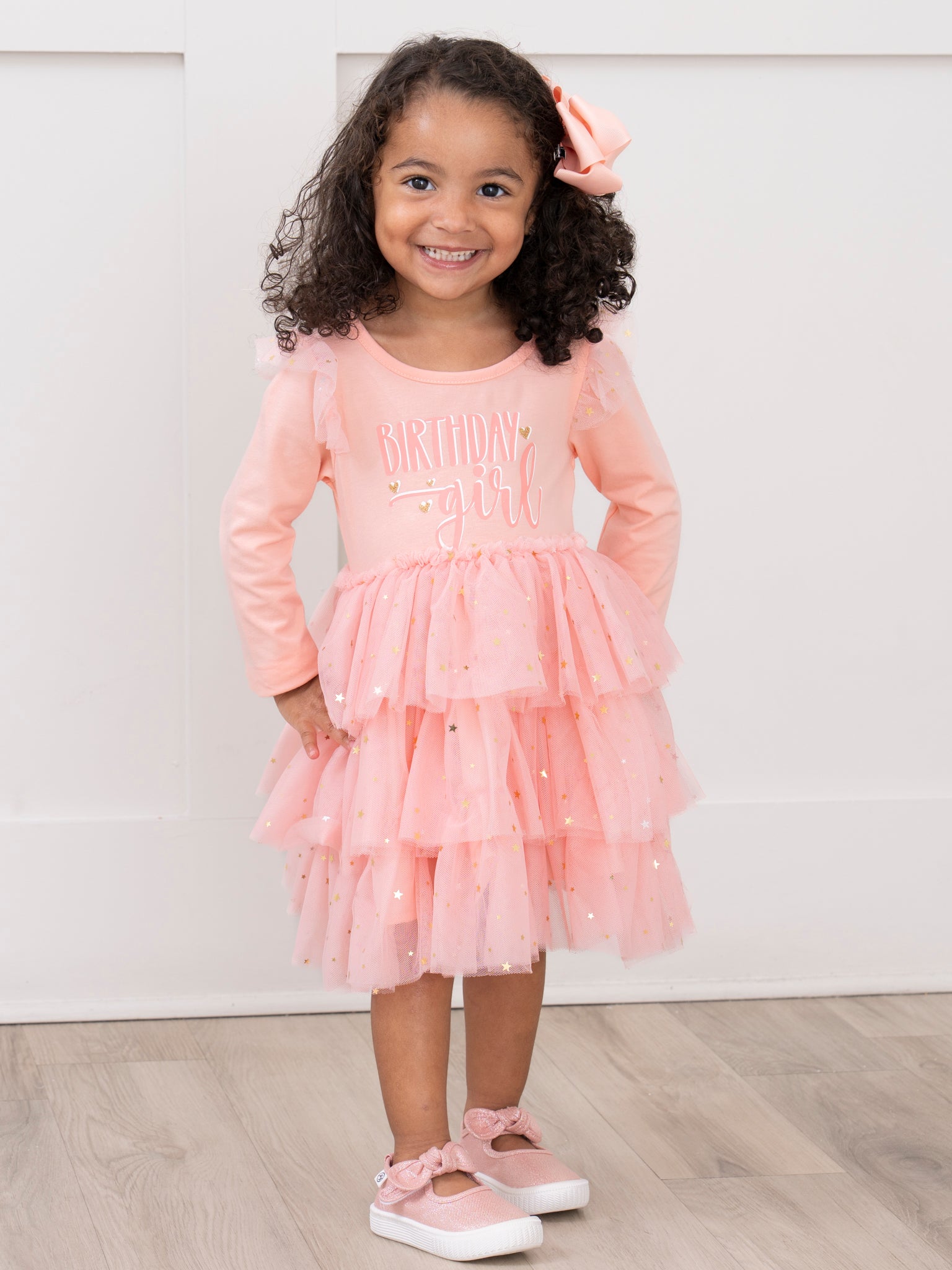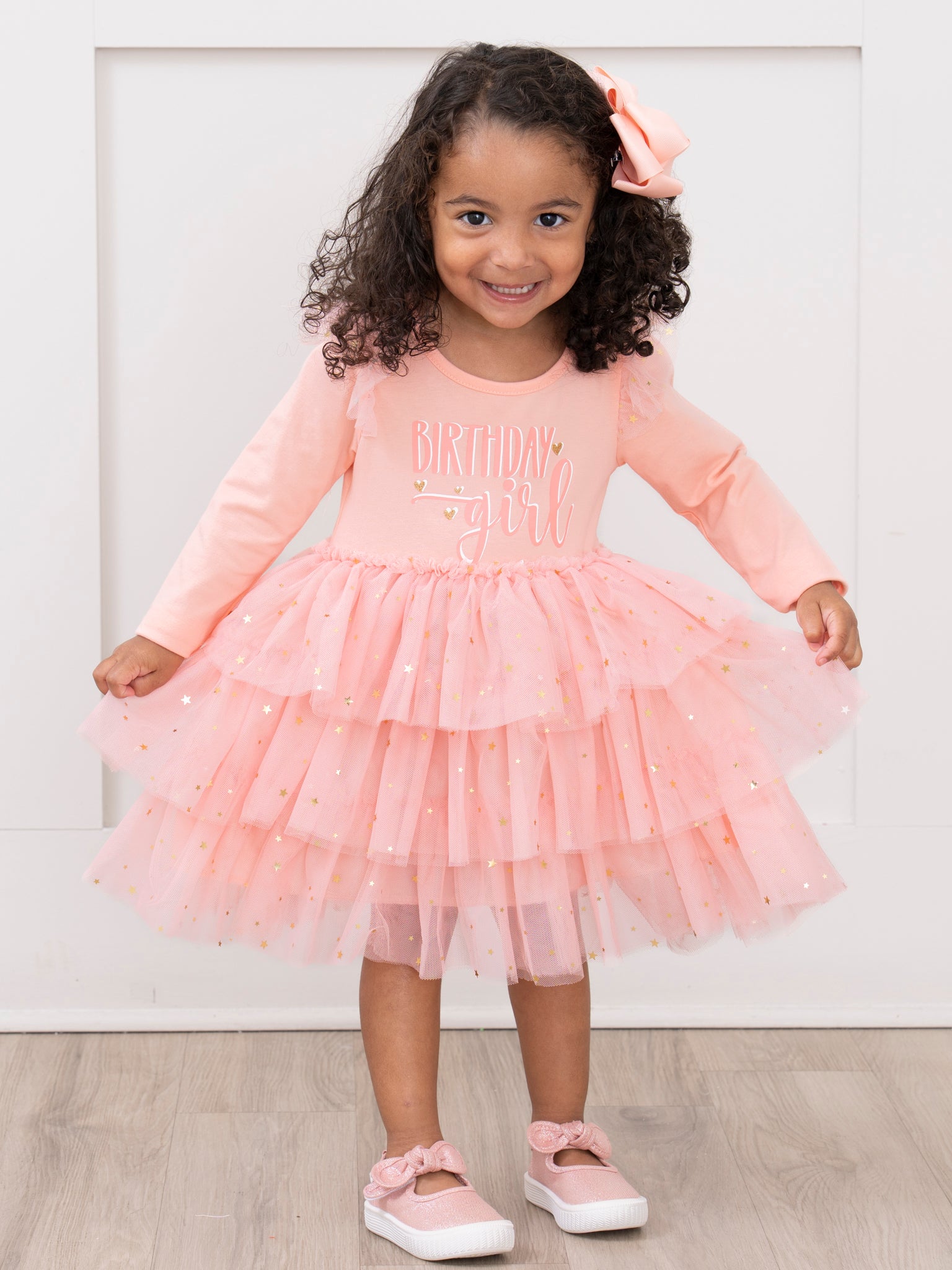 The "Birthday Girl" Pink Princess Tulle Dress by Marie Nicole features long sleeves, delicate print lettering on the bodice, and whimsical tiered ruffles of tulle for a magical and festive look. Special details like flutter accents at the shoulders and sparkling embellishments make this dress perfect for celebrating a special day.
