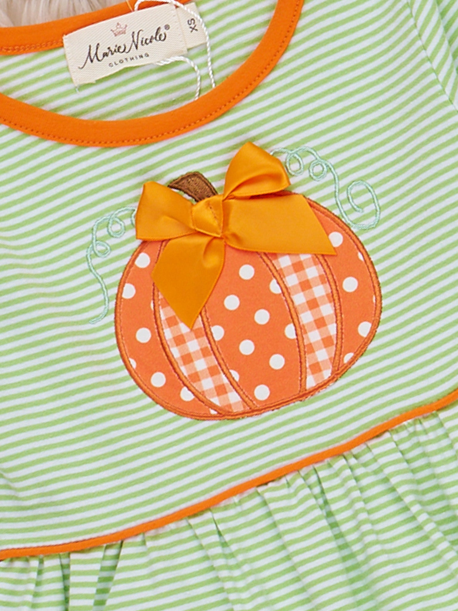 kThe Cozy Pumpkin Striped Embroidered Dress by Marie Nicole Clothing features soft striped fabric, a large pumpkin appliqué at the chest, and functional orange ruffle-trimmed pockets. This dress blends playful fall charm with practicality, making it perfect for autumn adventures and everyday seasonal style.