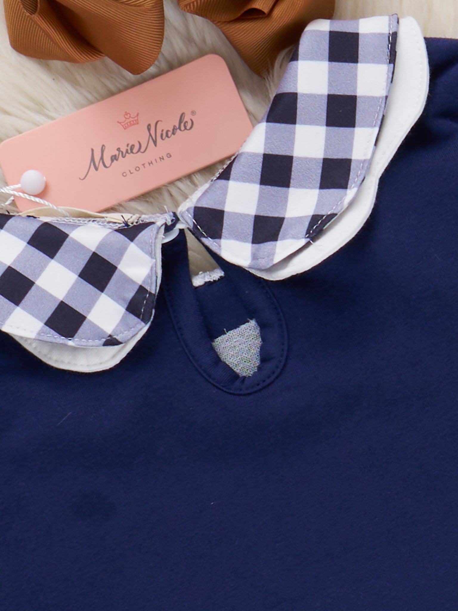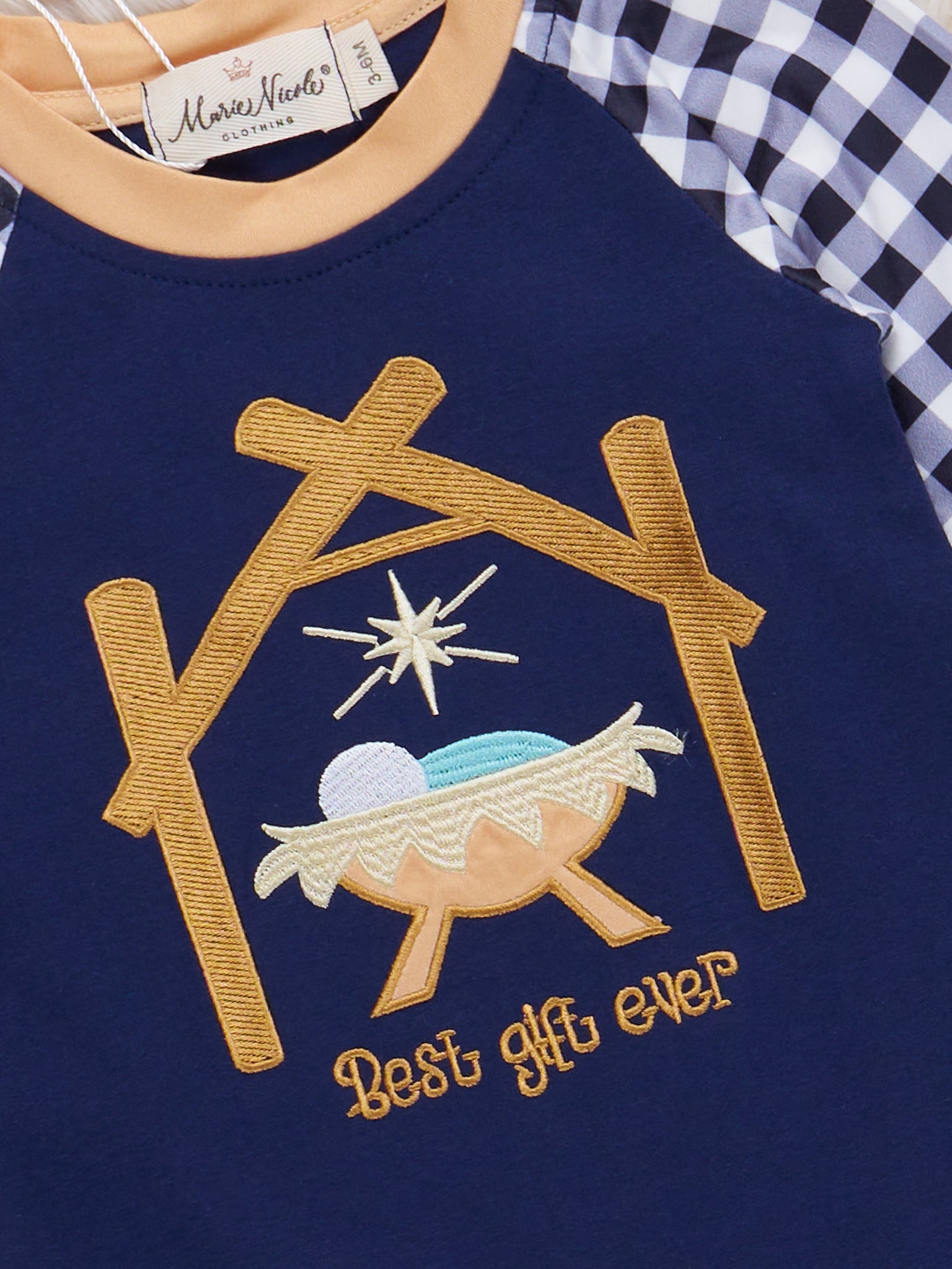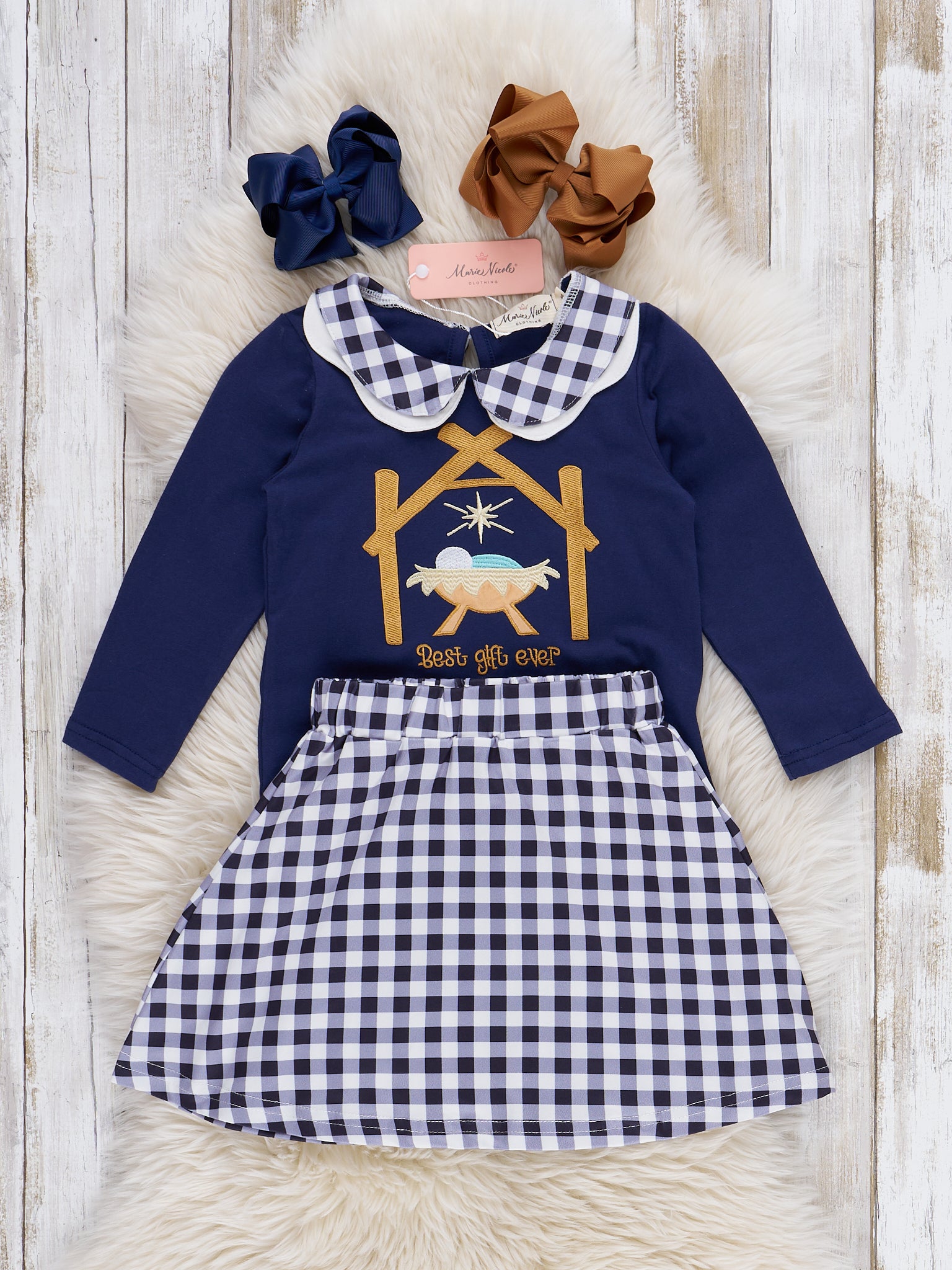 Celebrate Christmas in style with our "Best Gift Ever" Nativity Skirt Outfit. This adorable girls' outfit features an embroidered nativity designed top and navy & white gingham skirt. Perfect for celebrating the "best gift ever" of the holiday season. Shop the full sibling set!