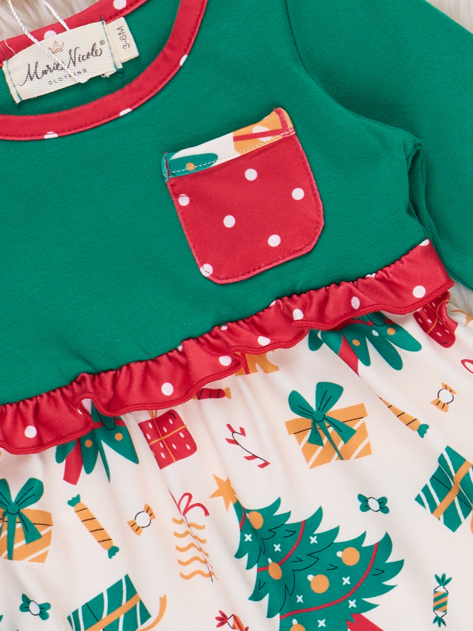 Dress your little one in playful holiday style with our Christmas Morning Ruffle Romper. This girls romper features a festive bodice. accented with a polka dot trim and pocket detail, all topped off with a fun Christmas morning print. Don't forget to check out our matching sister set for double the cuteness!