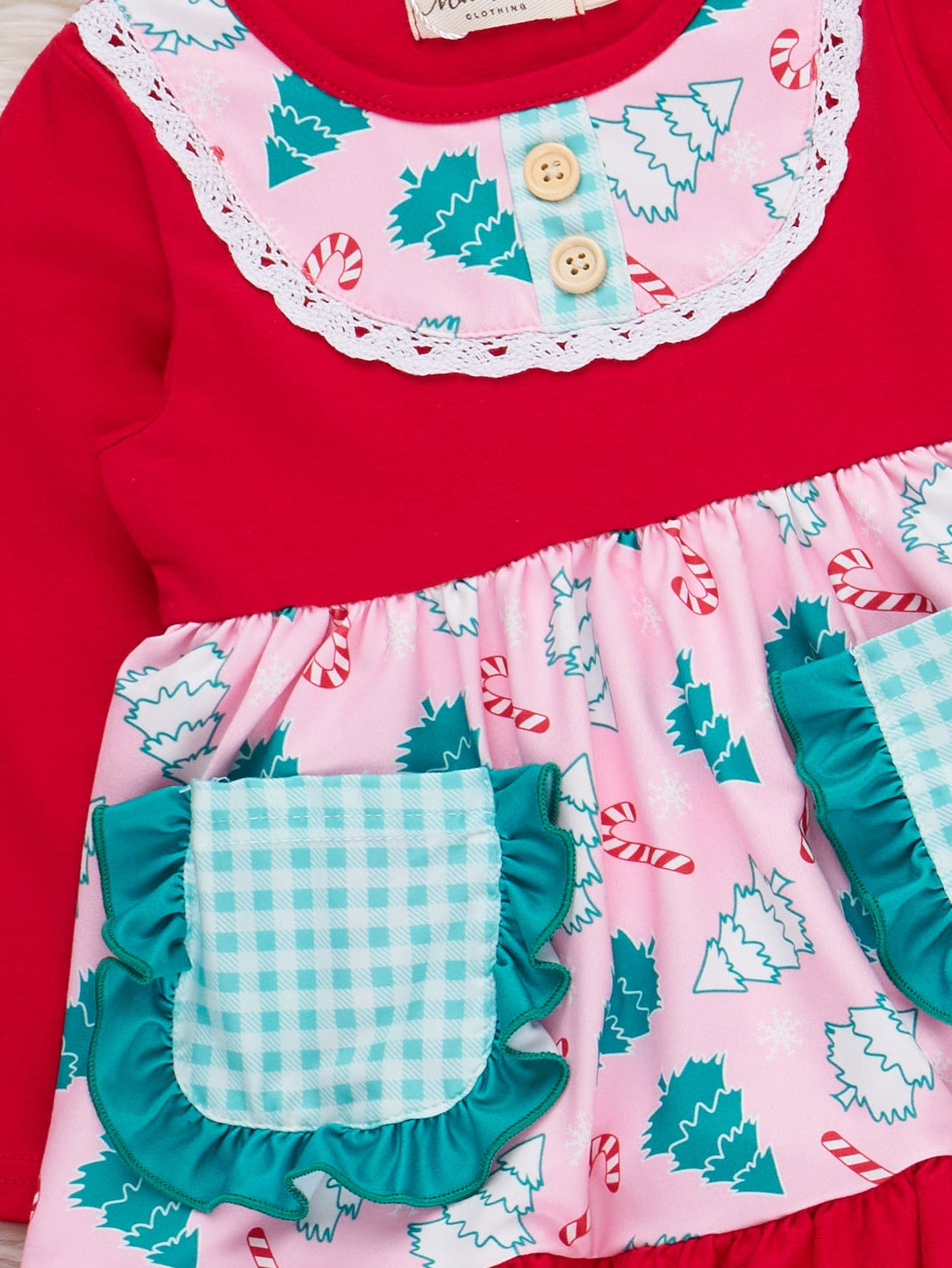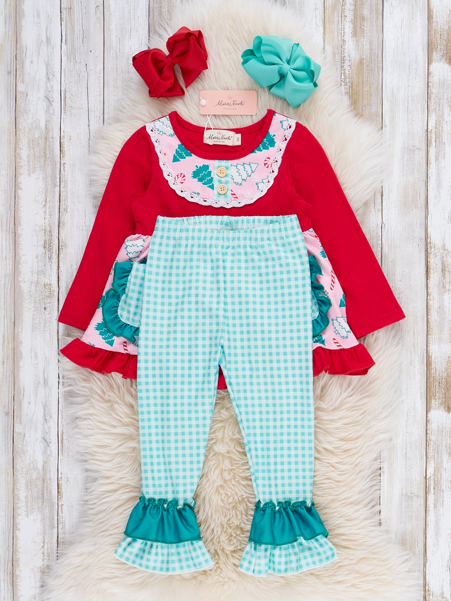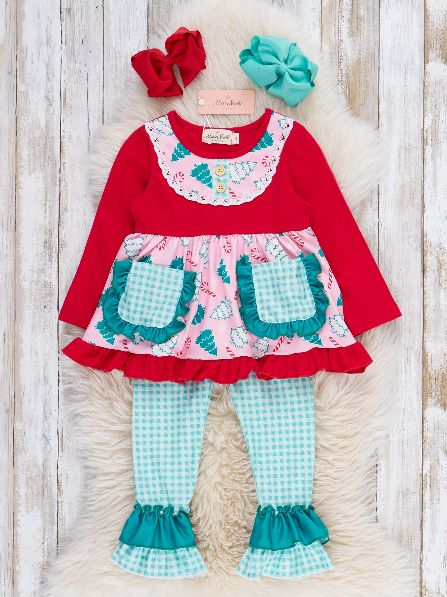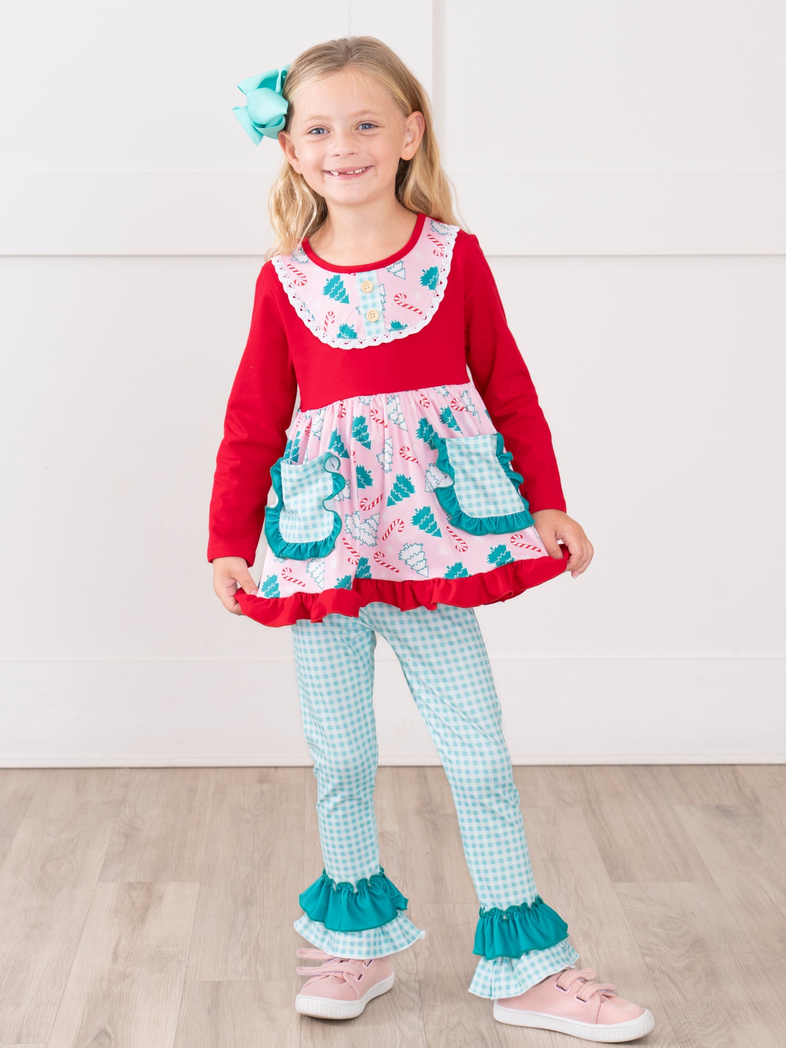 The Forest Festivity Gingham Pocket Outfit features a long sleeve peplum top with forest and gingham patterns, playful patch pockets, and ruffle accents. Coordinating ruffle-hem pants add extra whimsy and comfort, making this two-piece set ideal for holiday parties and everyday seasonal adventures.
