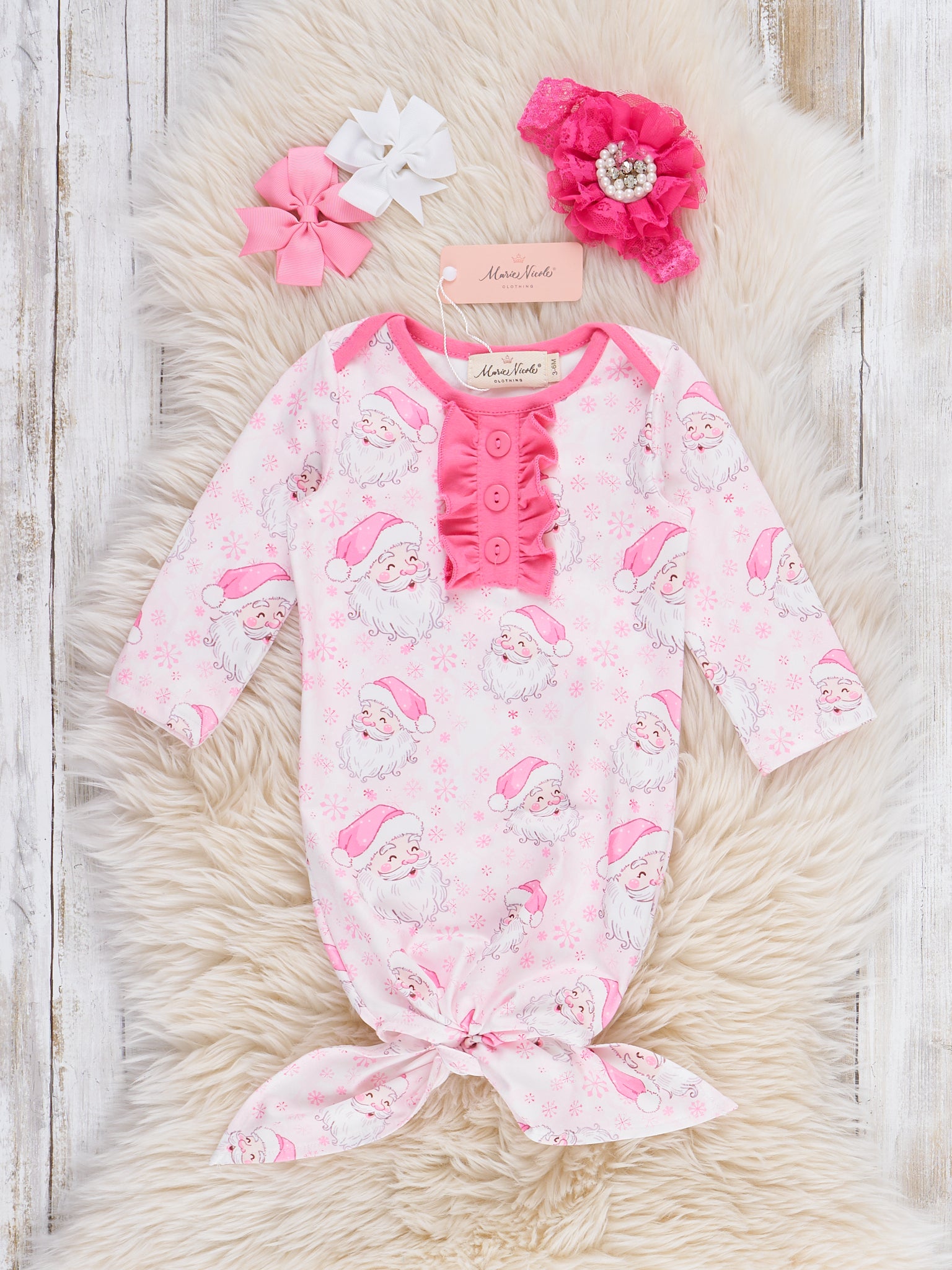 The Holiday Cheer Knot Gown by Marie Nicole Clothing is designed for cozy nights and effortless changes, featuring a sweet holiday print and soft, stretchy fabric. Its knotted bottom make it perfect for keeping little ones snug and comfortable throughout the festive season.