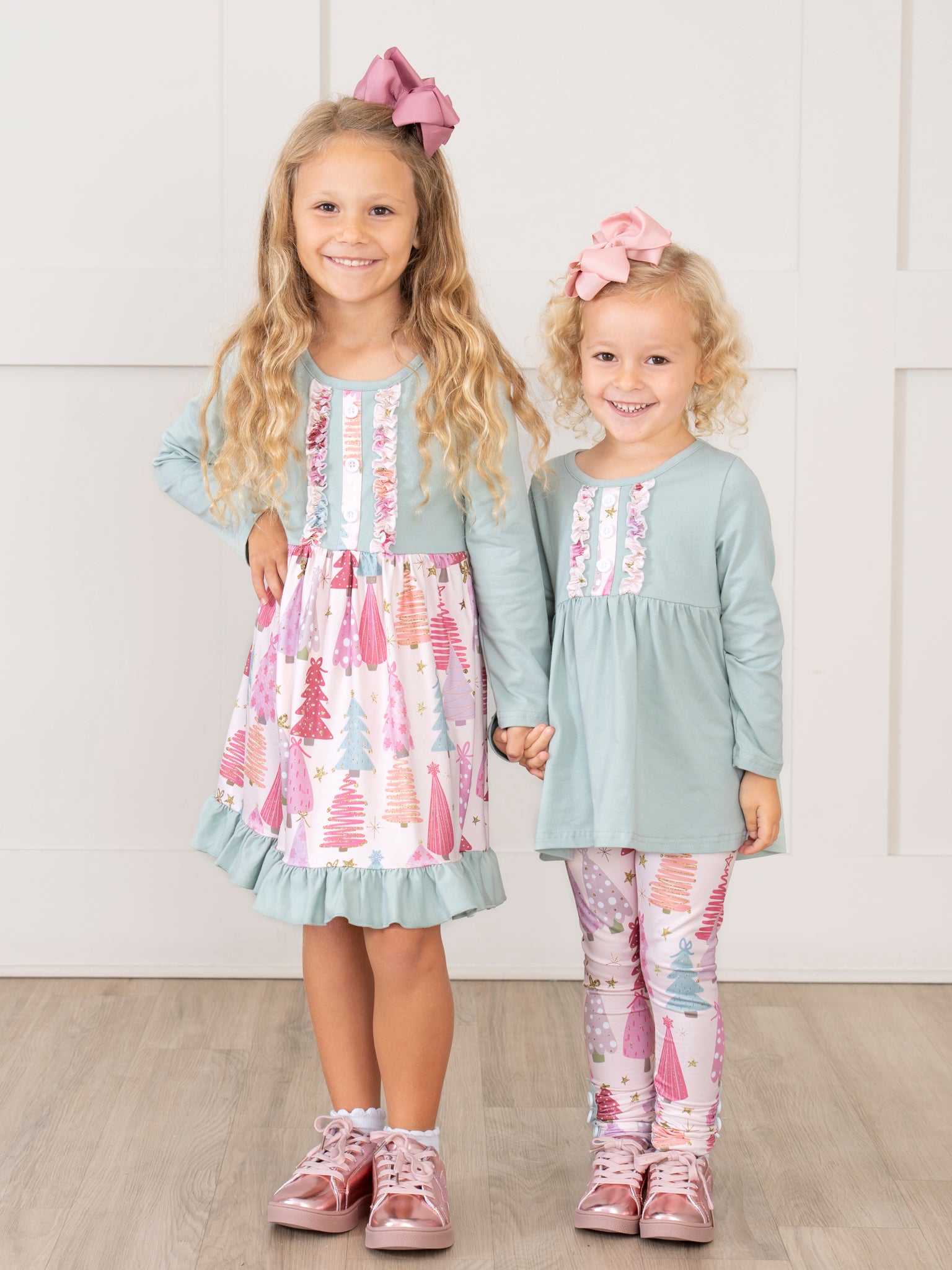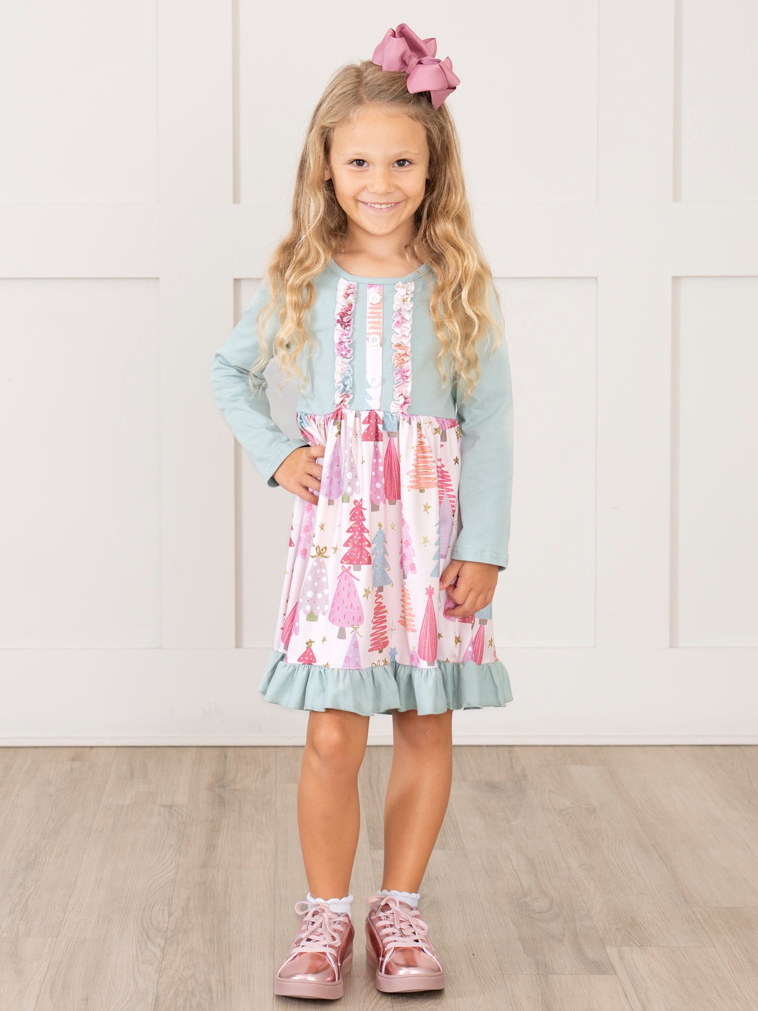 Soft Mint & Pink Christmas Trees Ruffle Dress