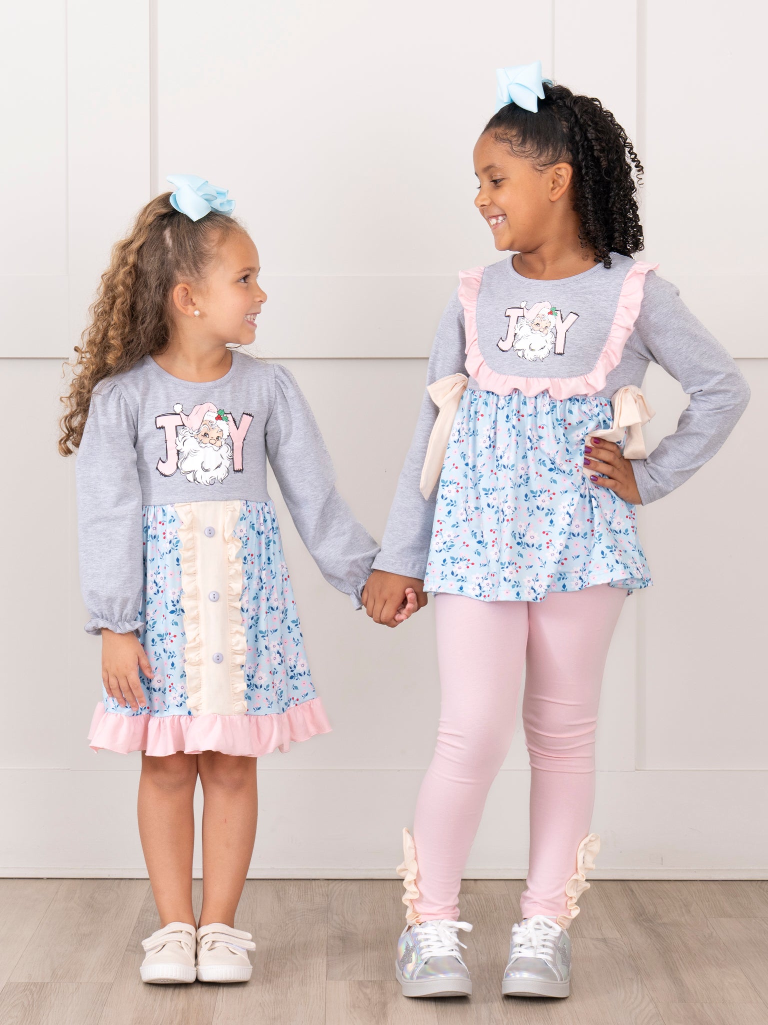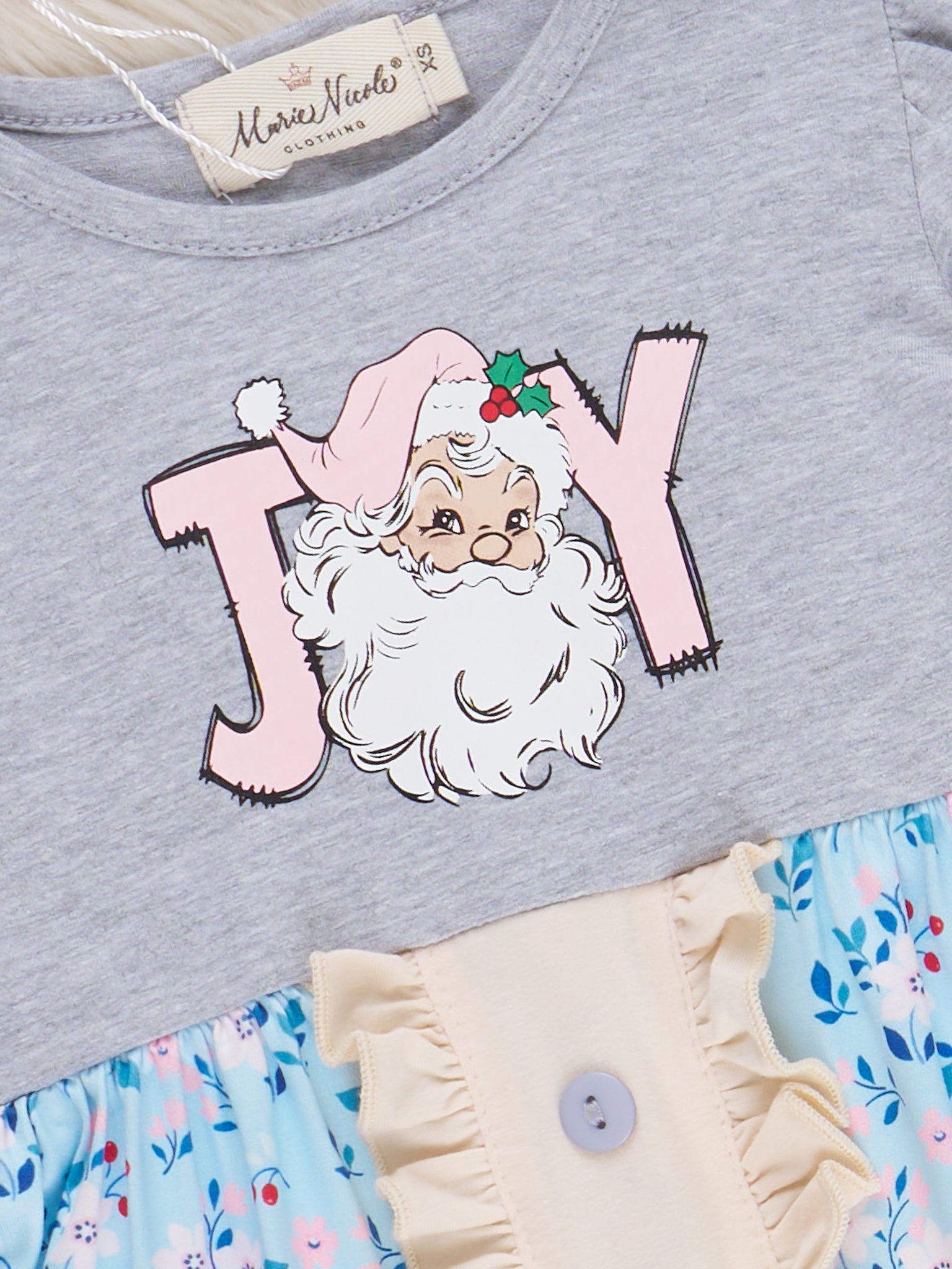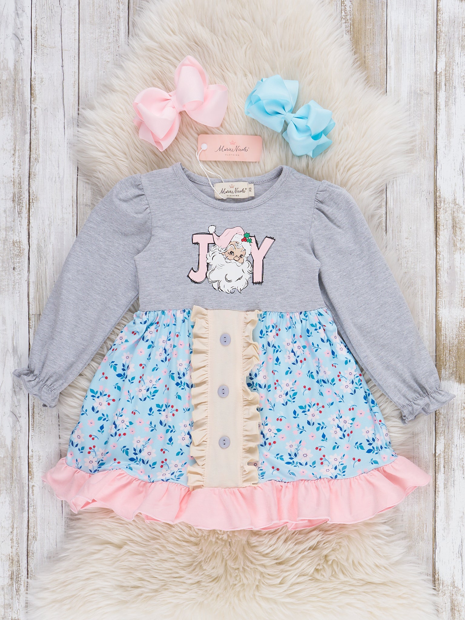 The Joyful Blooms Embroidered Ruffle Dress by Marie Nicole Clothing is a sweet, playful dress adorned with “JOY” embroidery on a comfortable knit bodice. Puffed long sleeves, a button-front floral skirt with contrasting panel, and a ruffled hem create a whimsical silhouette. This charming style is perfect for special occasions and everyday smiles.