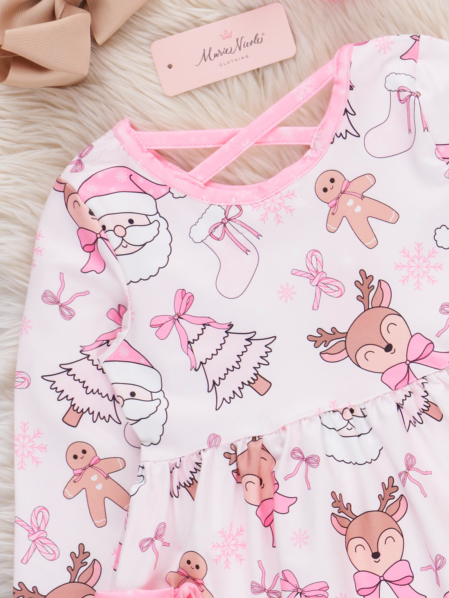 The Merry Magic Ruffle Dress by Marie Nicole showcases a charming holiday print with playful reindeers and Santa's, ruffled hem, and patch pockets for extra whimsy. Designed with a twirly skirt and comfortable sleeves, this dress is perfect for festive gatherings and creating magical seasonal memories.