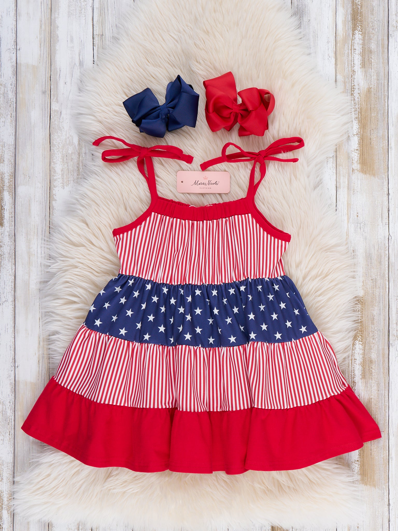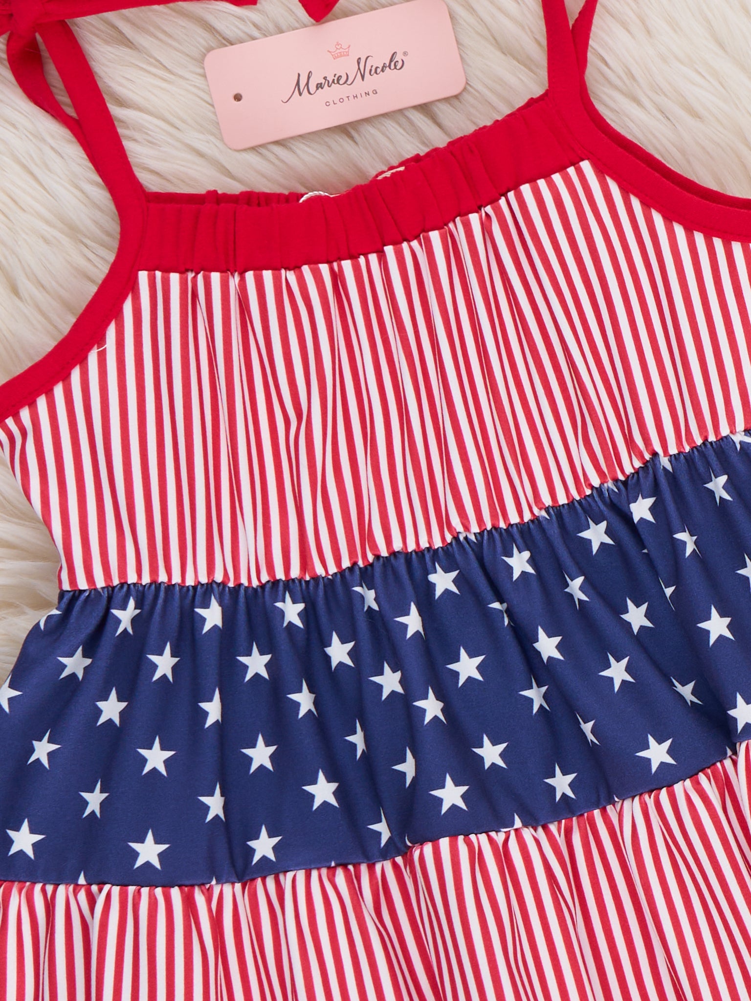 The Stars and Stripes Ruffle Dress by Marie Nicole Clothing is a patriotic, playful choice for matching outfits. Featuring a beautiful tiered design with stripes and stars, this dress combines comfort and festive style. The adjustable tie straps ensure a perfect fit, making it an ideal choice for family gatherings, parades, and all-day celebrations filled with fun and memories.