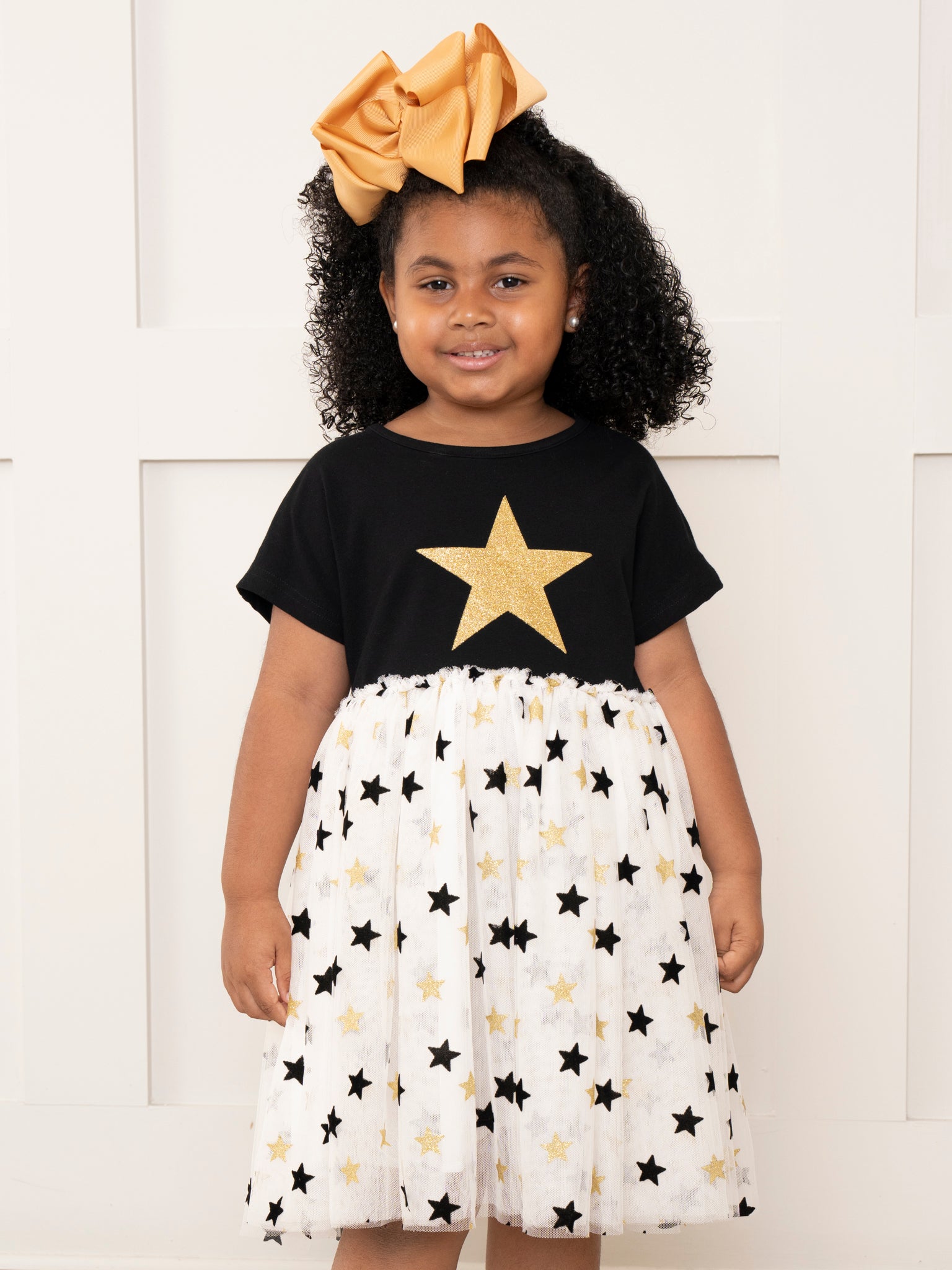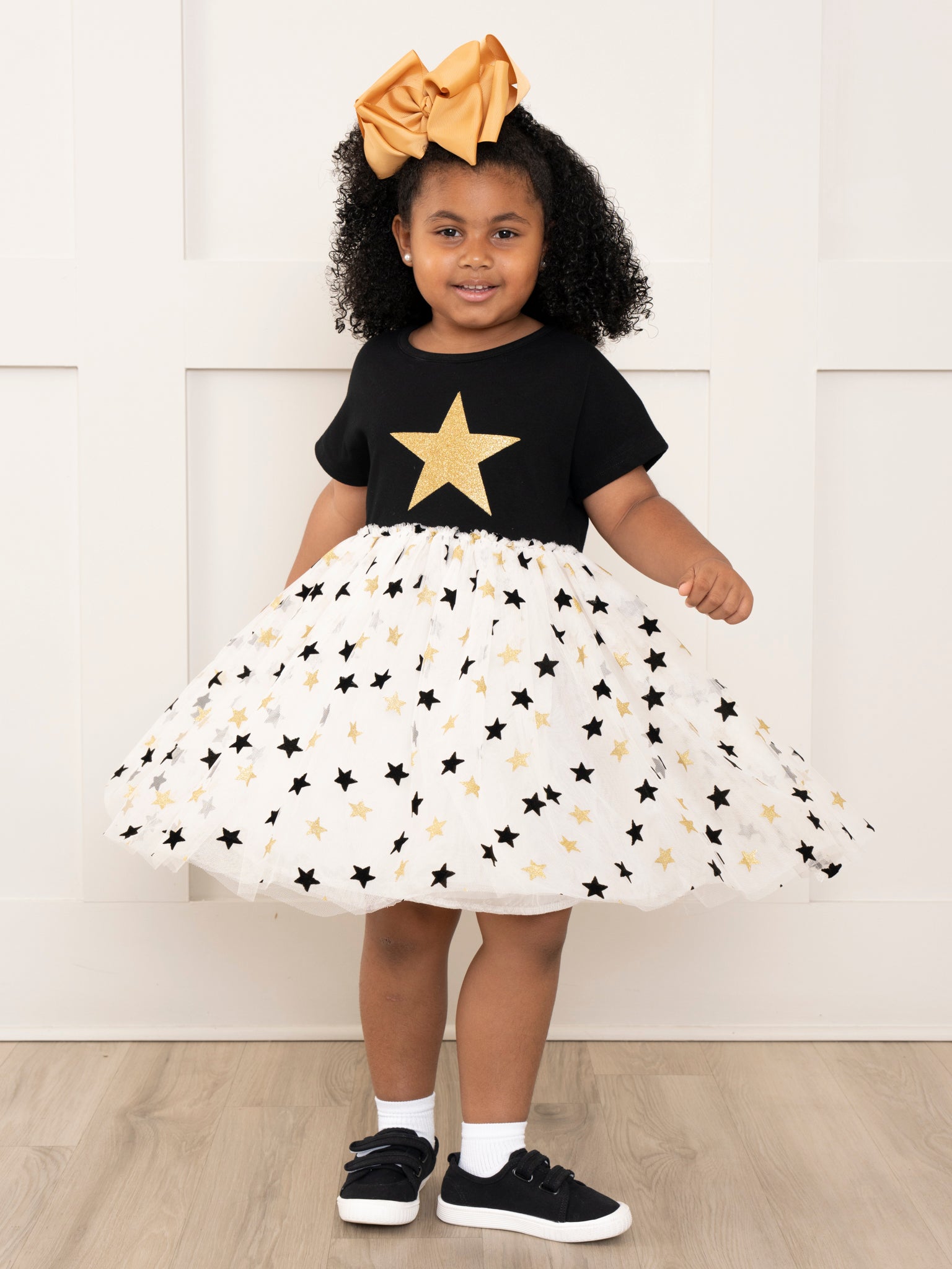 Add a touch of whimsy and sparkle with our Black & Gold Glitter Stars Tulle Dress. ⭐️★ Your little will shine in this dress featuring a soft black top with a bright gold star atop a white tulle skirt adorned with charming black and gold stars, making it perfect for a dazzling look. Stand out and shine in this playful dress!