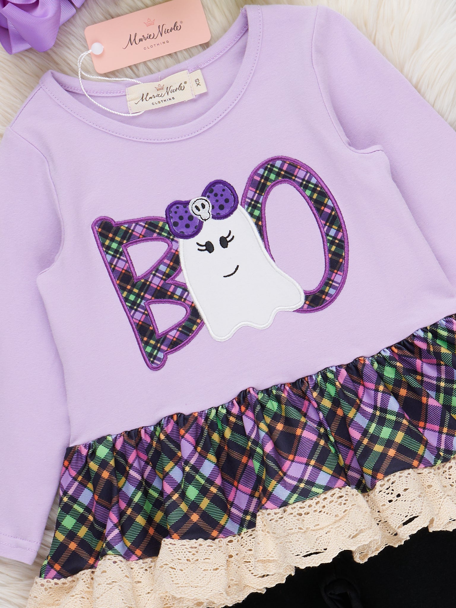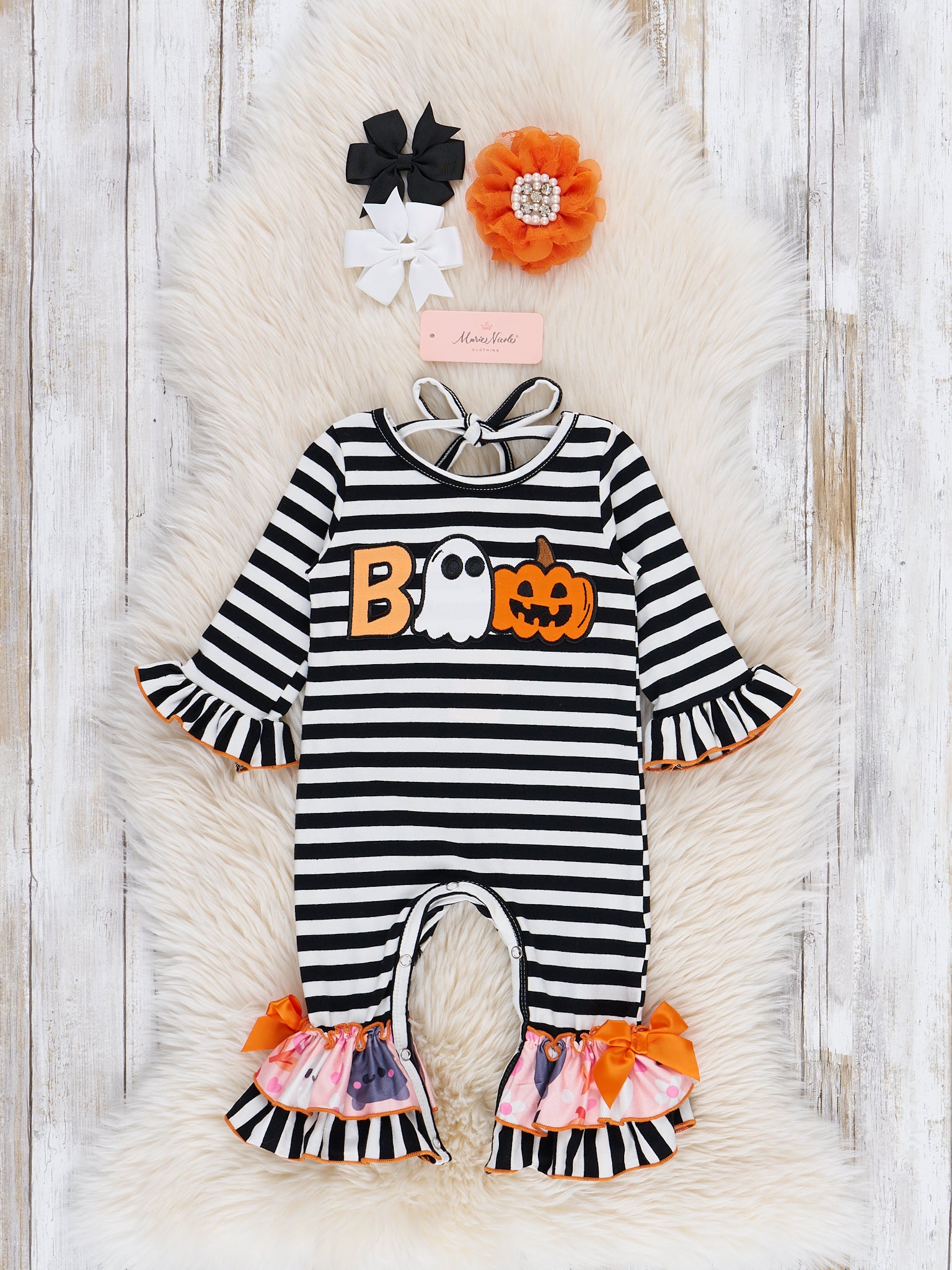 Striped Boo & Pumpkin Embroidered Ruffle Romper