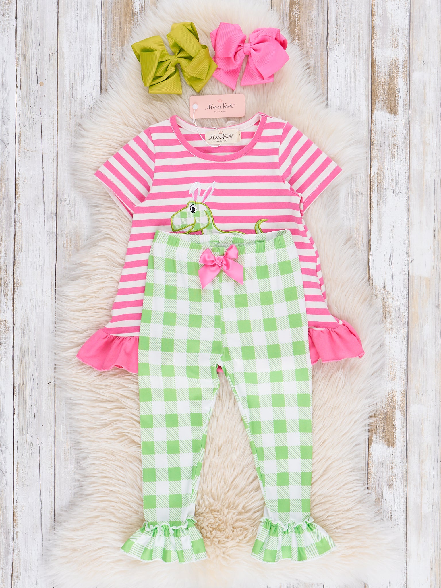 Pink & Green Gingham Embroidered T-Rex Ruffle Outfit
