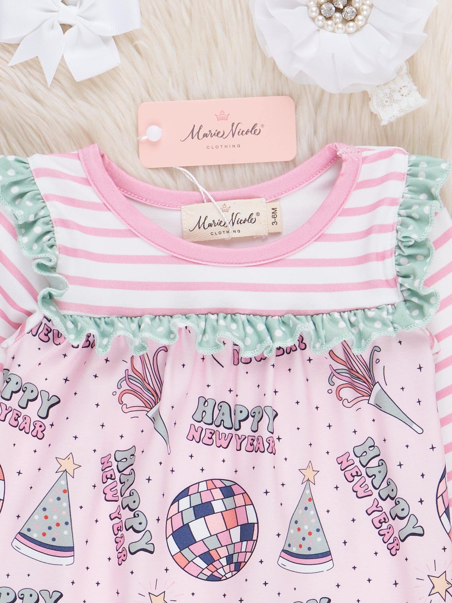 Get ready to ring in the New Year in style with our Pink Striped Ruffle Romper by Marie Nicole Clothing! This adorable girls romper features a playful pink New Year print and trendy teal ruffle accents. Complete the look with our matching sister set. Start the year off with a bang (and some ruffles)!