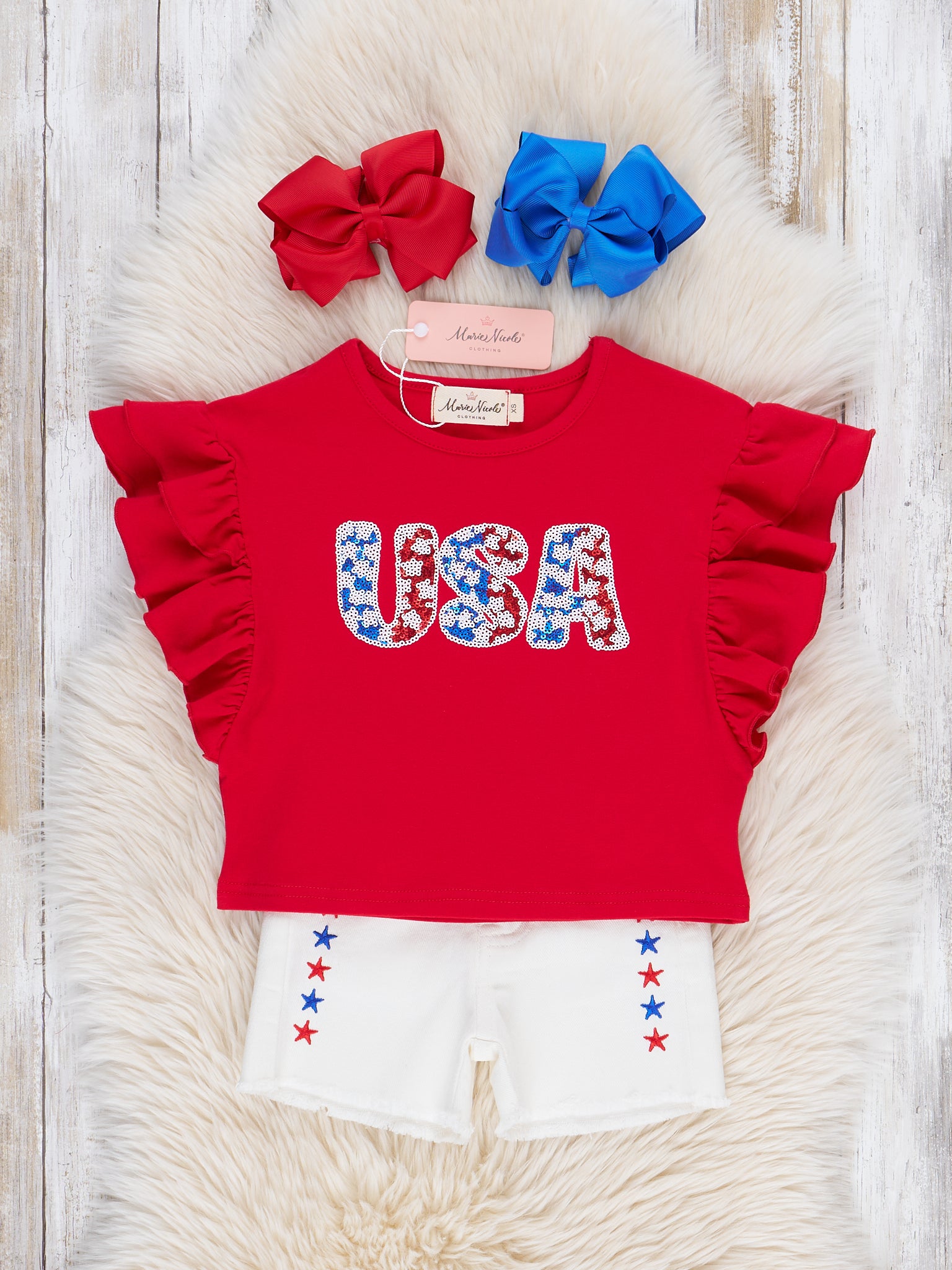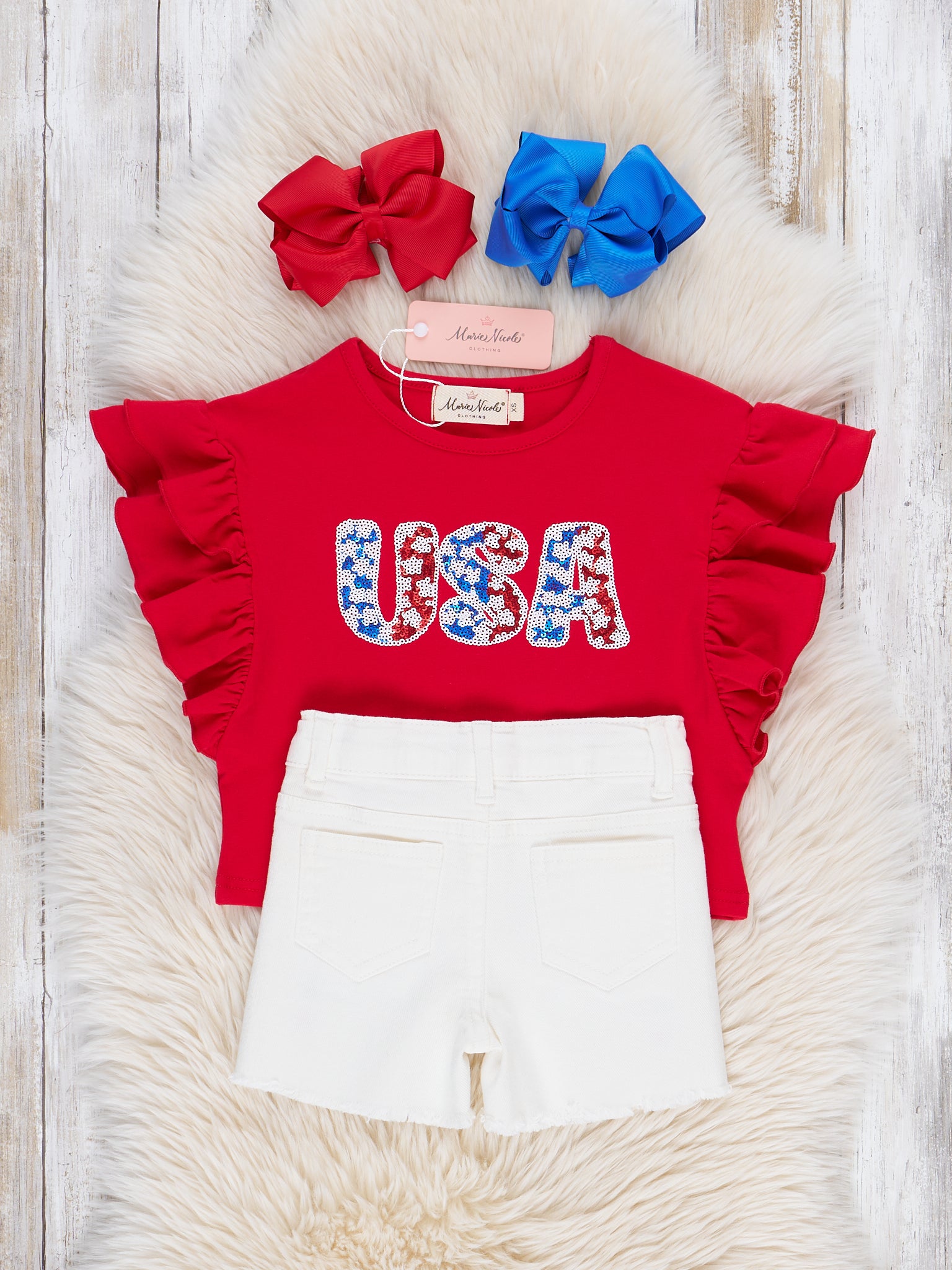 Get ready to rock the red, white, and blue with the USA Stars Ruffle Denim Shorts Outfit! This girls' ensemble features a playful red flutter sleeve top with a sequin USA design, paired with embroidered white denim shorts adorned with stars. Perfect for summer and showing off your patriotic side. By Marie Nicole Clothing.