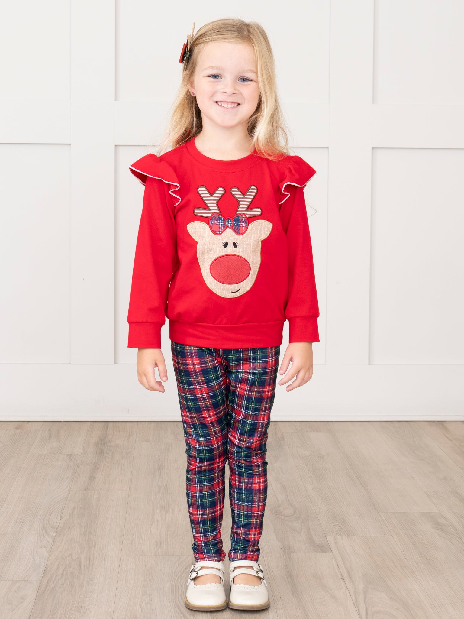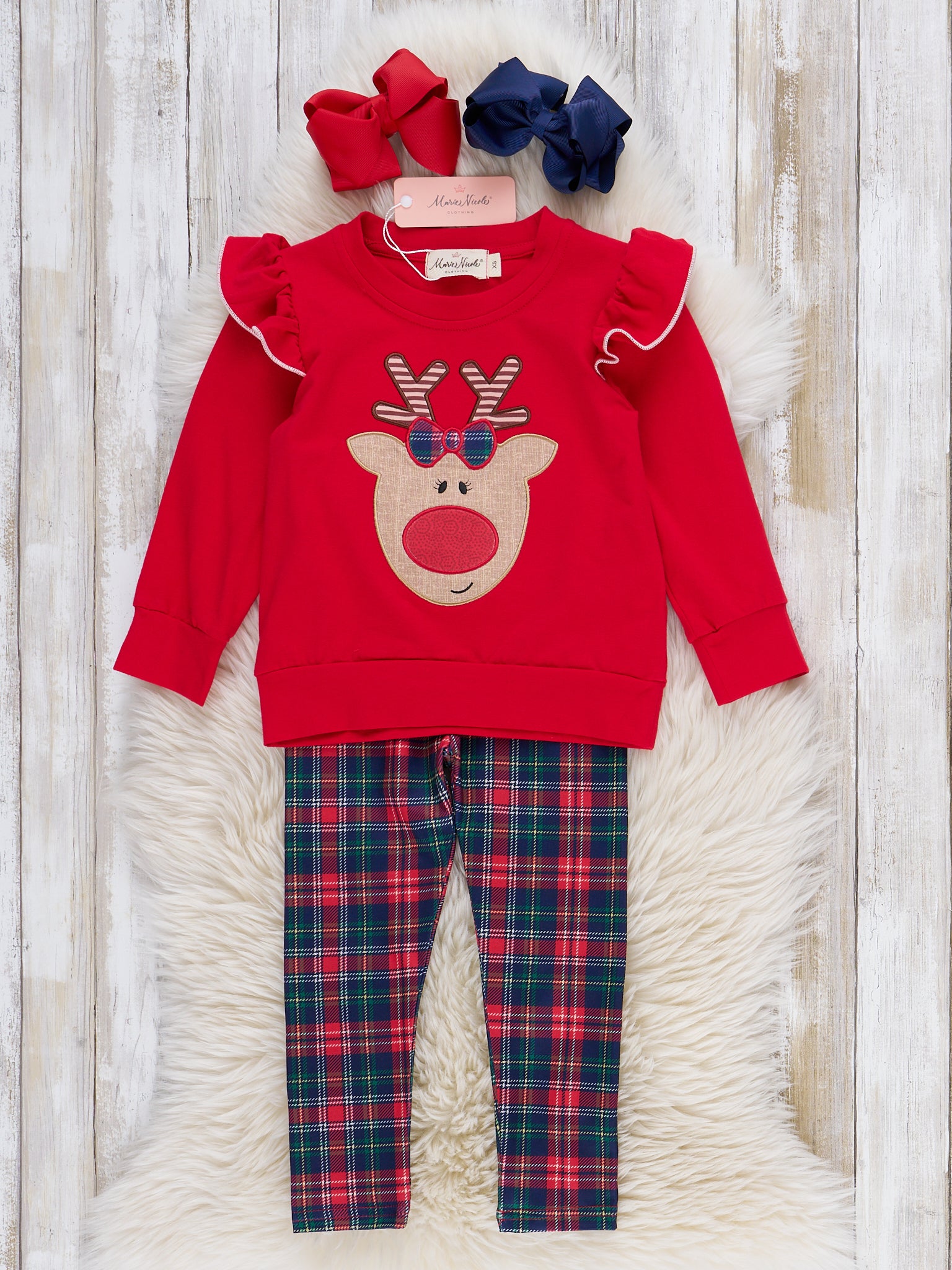 The Big Red Nose Rudolph Ruffle Embroidered Outfit glows like Rudolph's nose! Bright red paired with tartan pants, this two-piece set is adorably festive for the holidays with its embroidered reindeer and ruffled shoulders. Also made with soft, comfortable fabric, your little girl will love this outfit during the winter days and Christmas time.