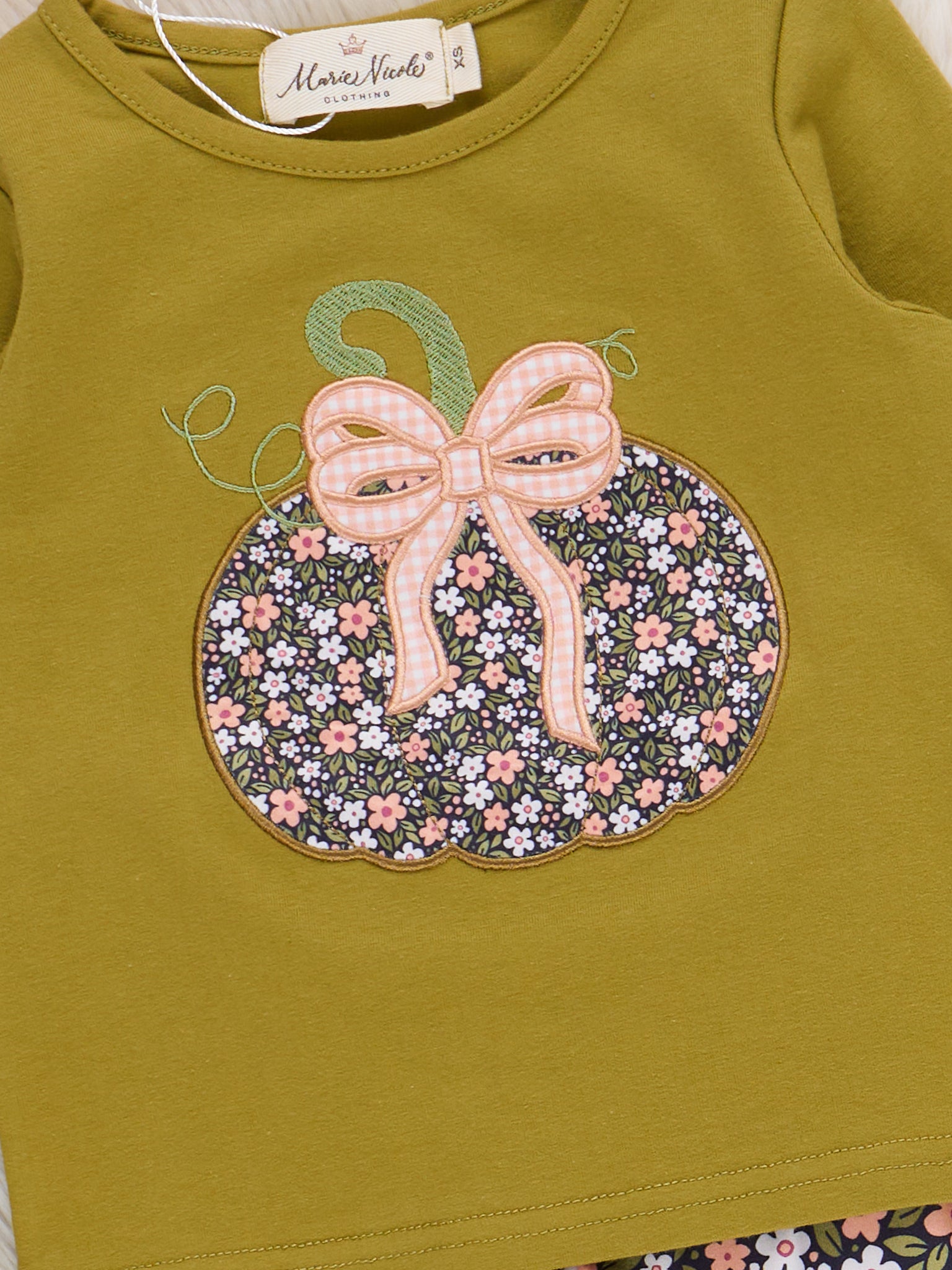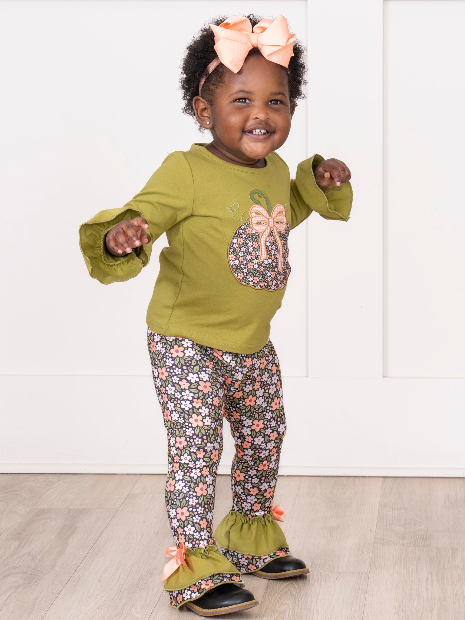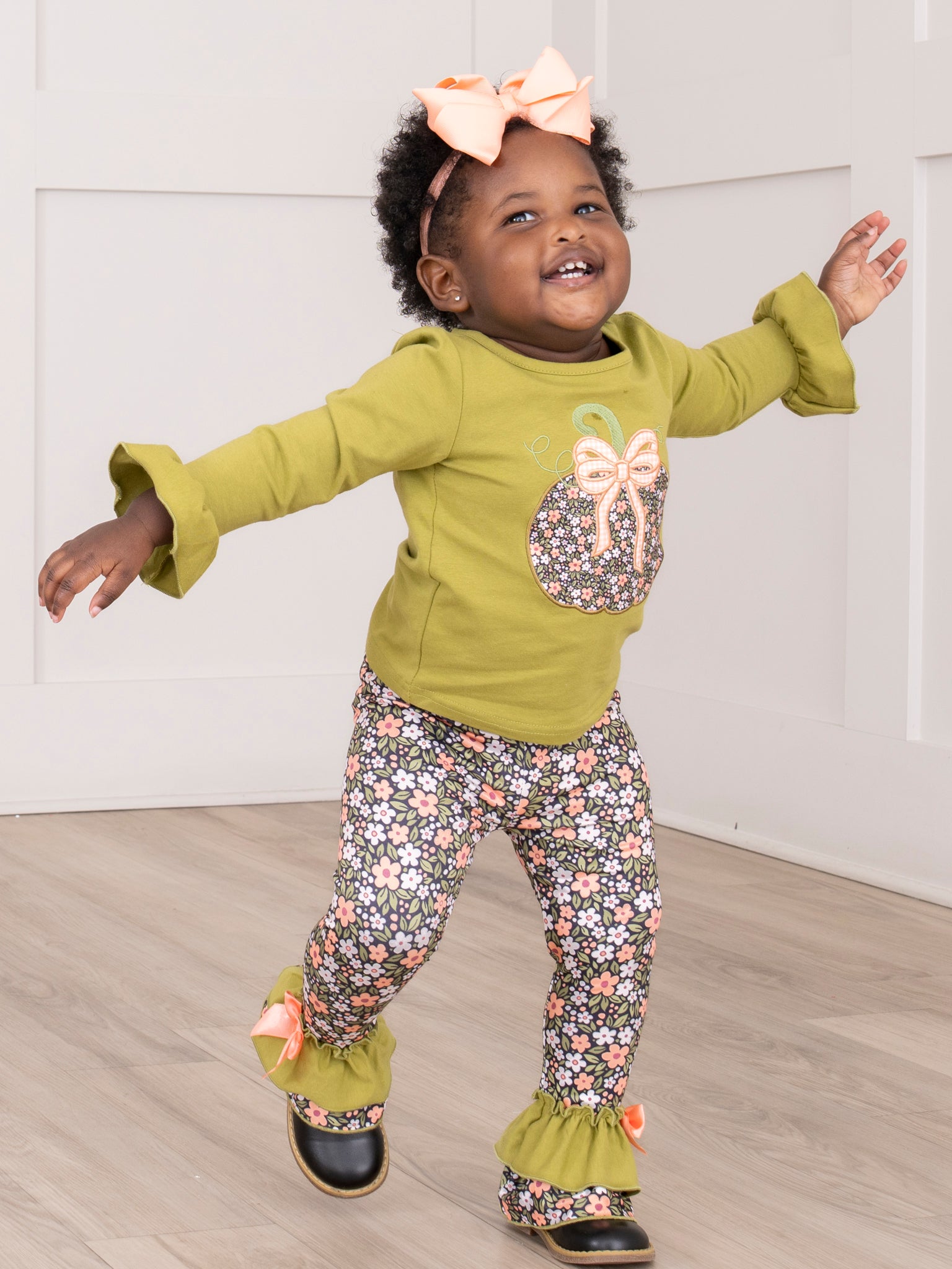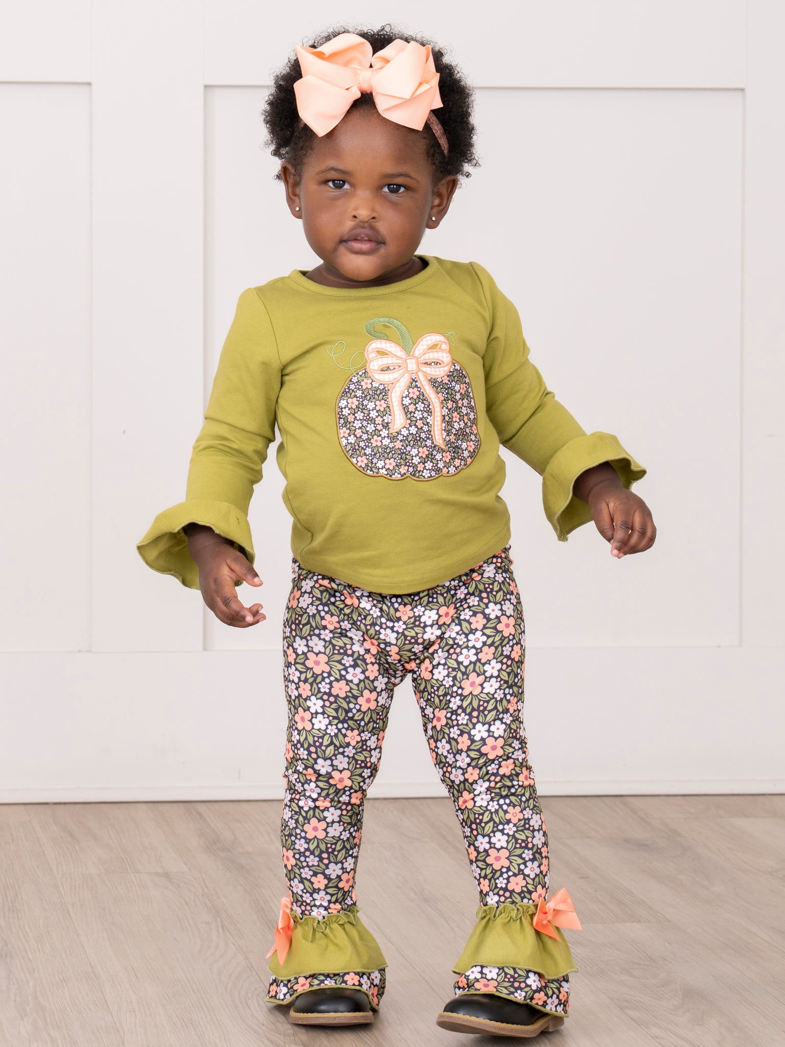The Bow & Blossom Harvest Embroidered Outfit brings together cozy comfort and autumn charm. Featuring sweet embroidered pumpkin and fall florals, this two-piece set from Marie Nicole Clothing is made for festive days and crisp-weather play. With soft, breathable fabric and darling ruffle accents, it’s a picture-perfect pick for pumpkin patches, seasonal strolls, and all your little one’s fall adventures.