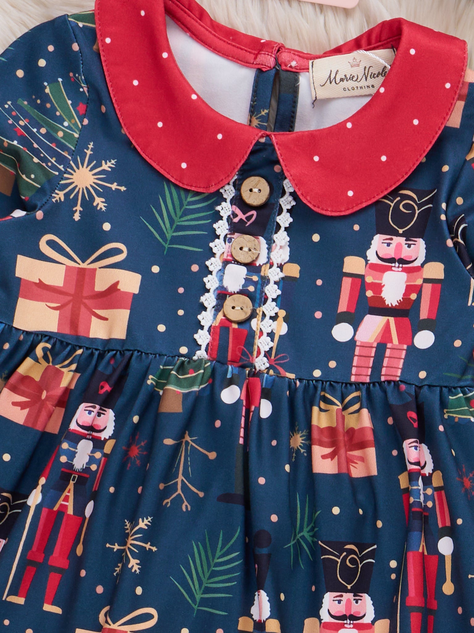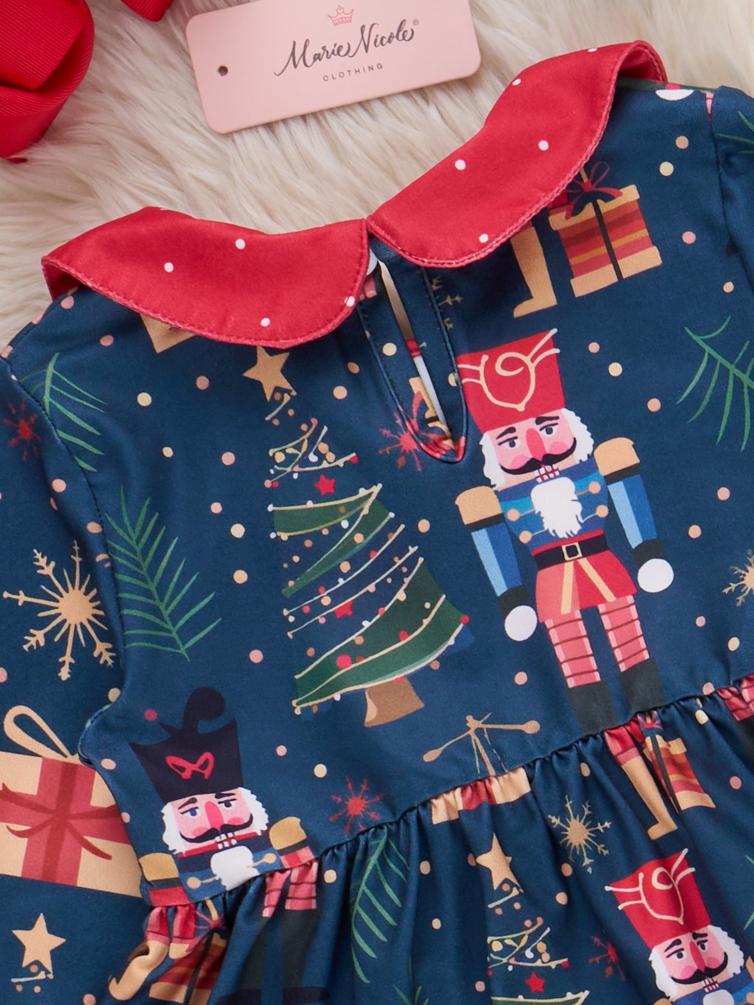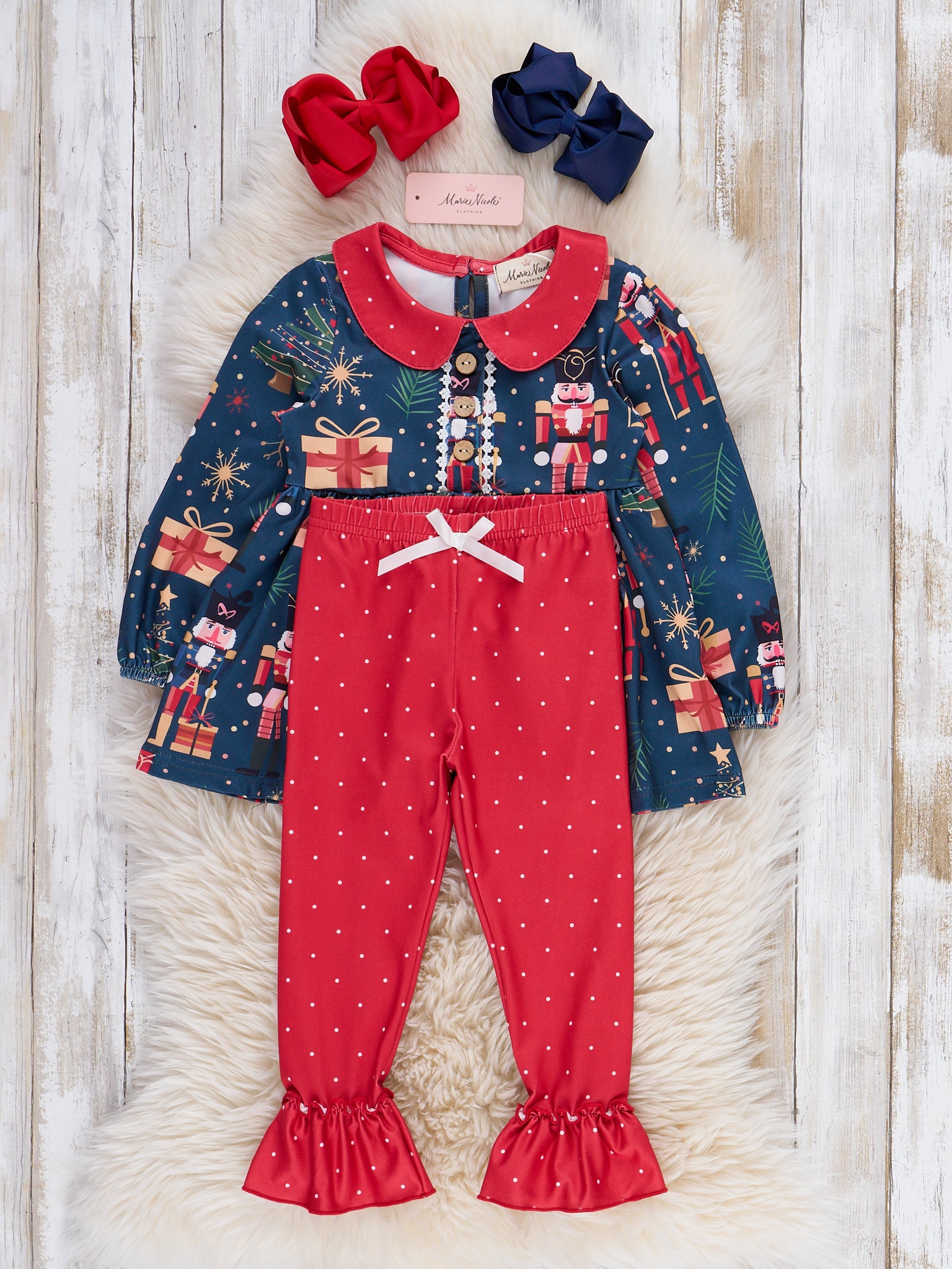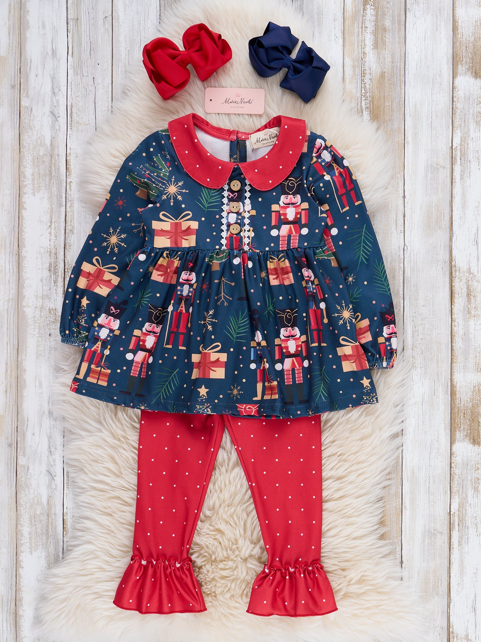 The Christmas Eve Storybook Outfit by Marie Nicole includes a long-sleeve tunic-style dress with a Peter Pan collar and button details, featuring a festive print of nutcrackers, holiday trees, and presents. Coordinating leggings with dainty ruffle cuffs and a petite bow complete this enchanting ensemble, perfect for holiday festivities.