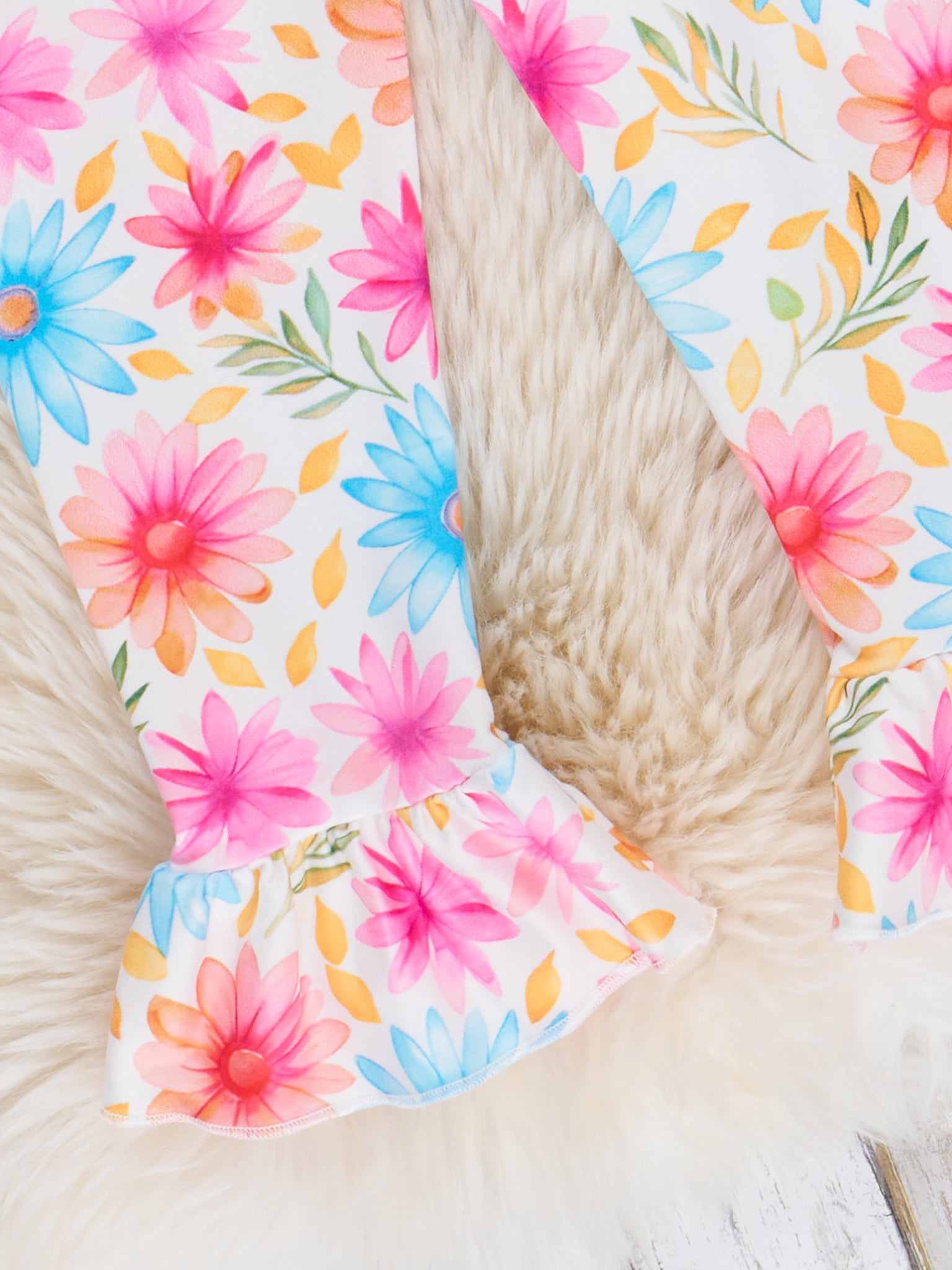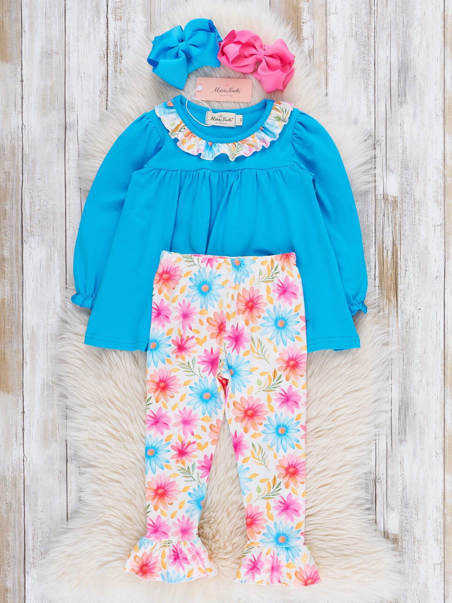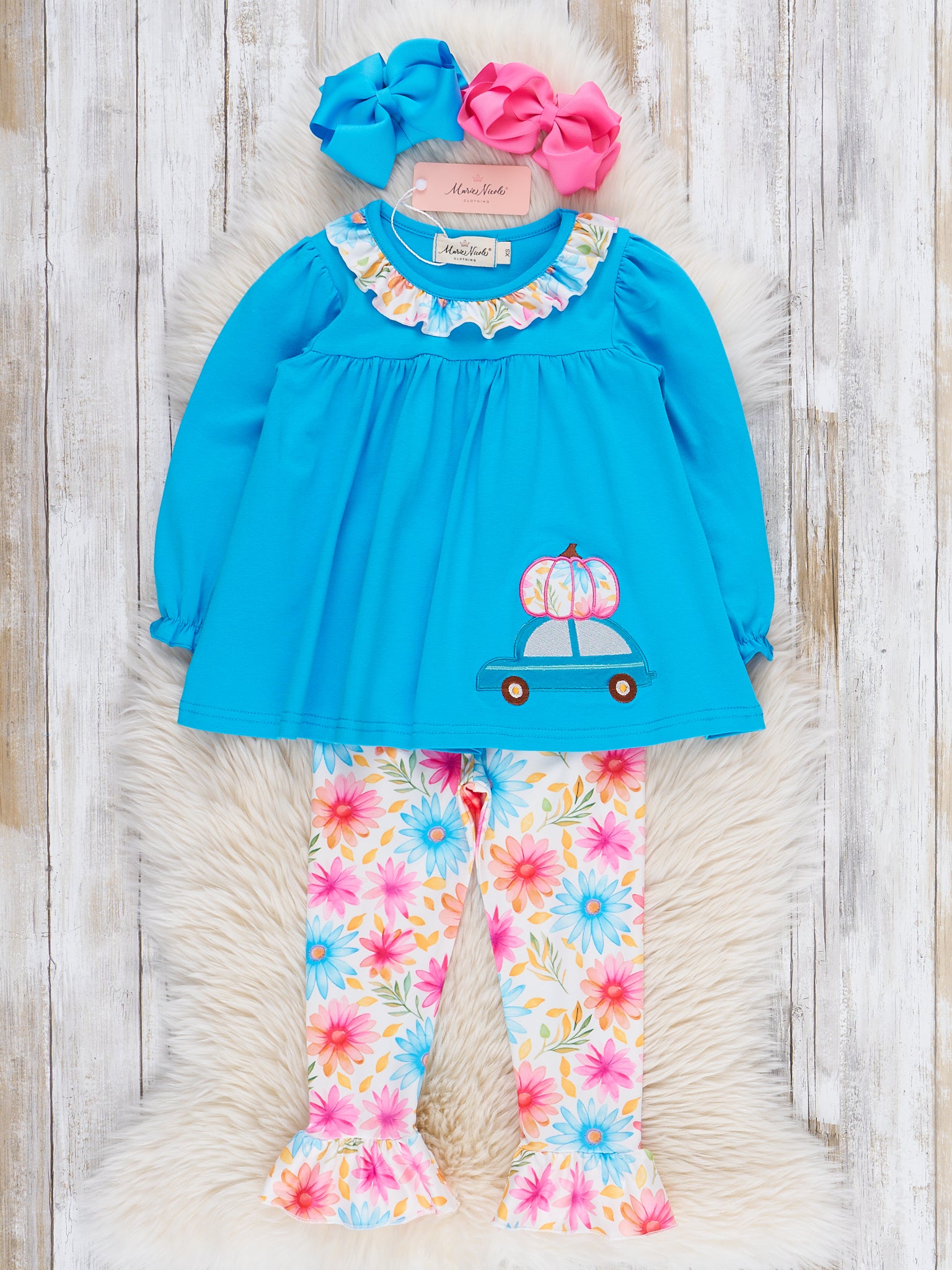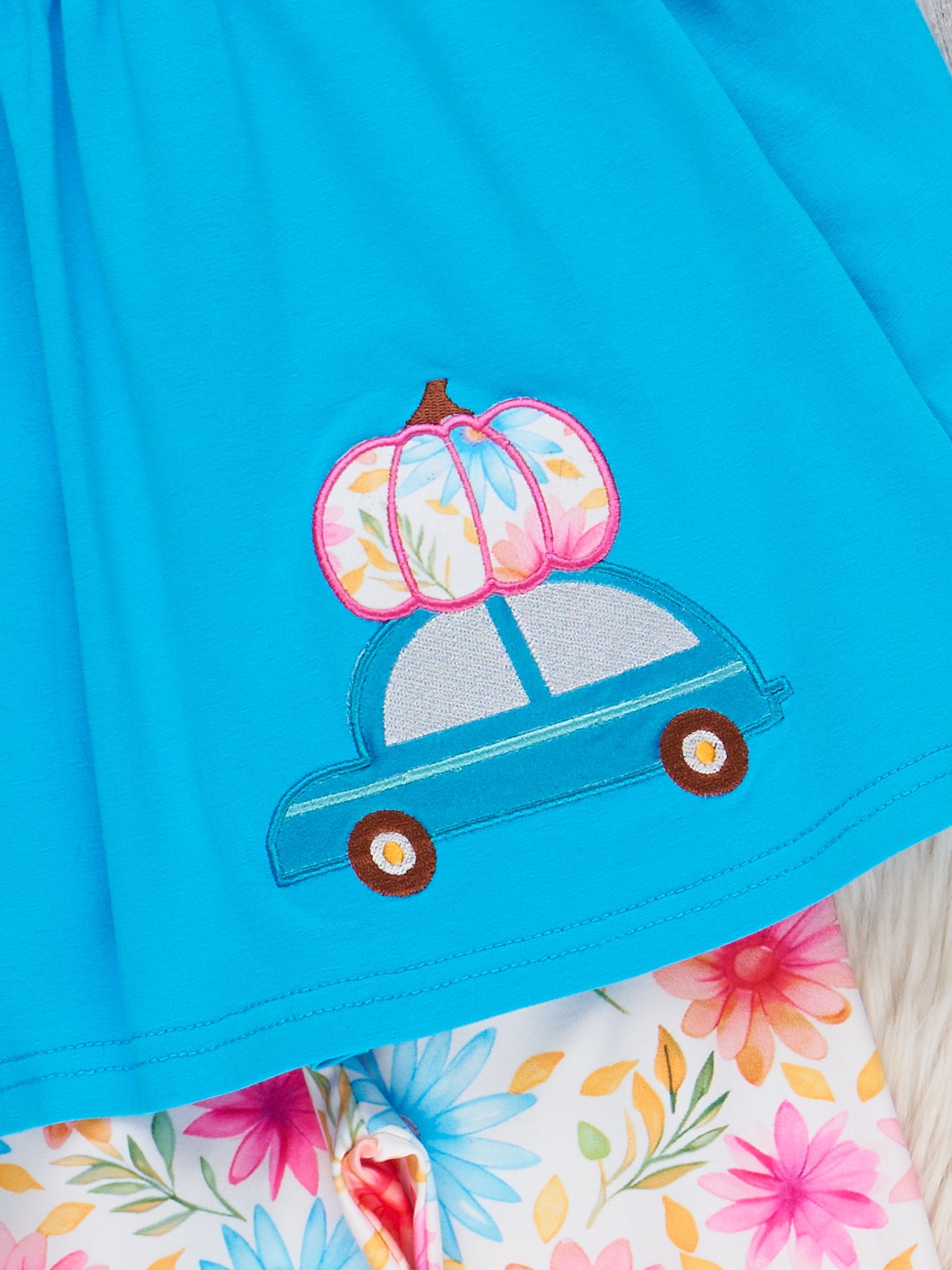 The Floral Patch Road Trip Embroidered Outfit is a sweet and playful choice for sunny days and seasonal adventures. Featuring delicate floral details and a charming pumpkin perched atop a classic car embroidery, this outfit from Marie Nicole Clothing blends garden-inspired whimsy with autumn fun. Made from soft, breathable fabric and finished with ruffle bloomers, it’s perfect for family outings, playdates, and picture-perfect moments.