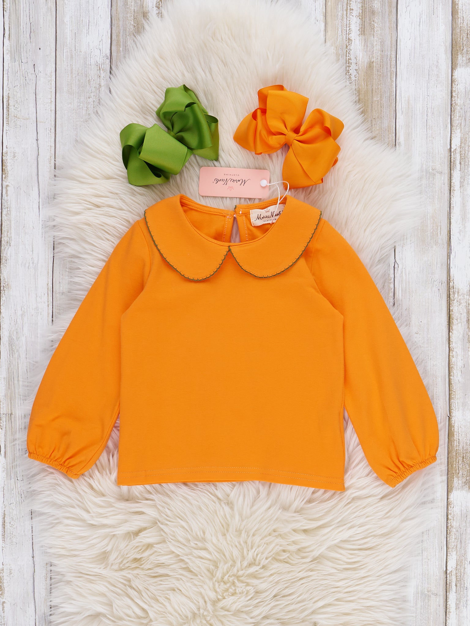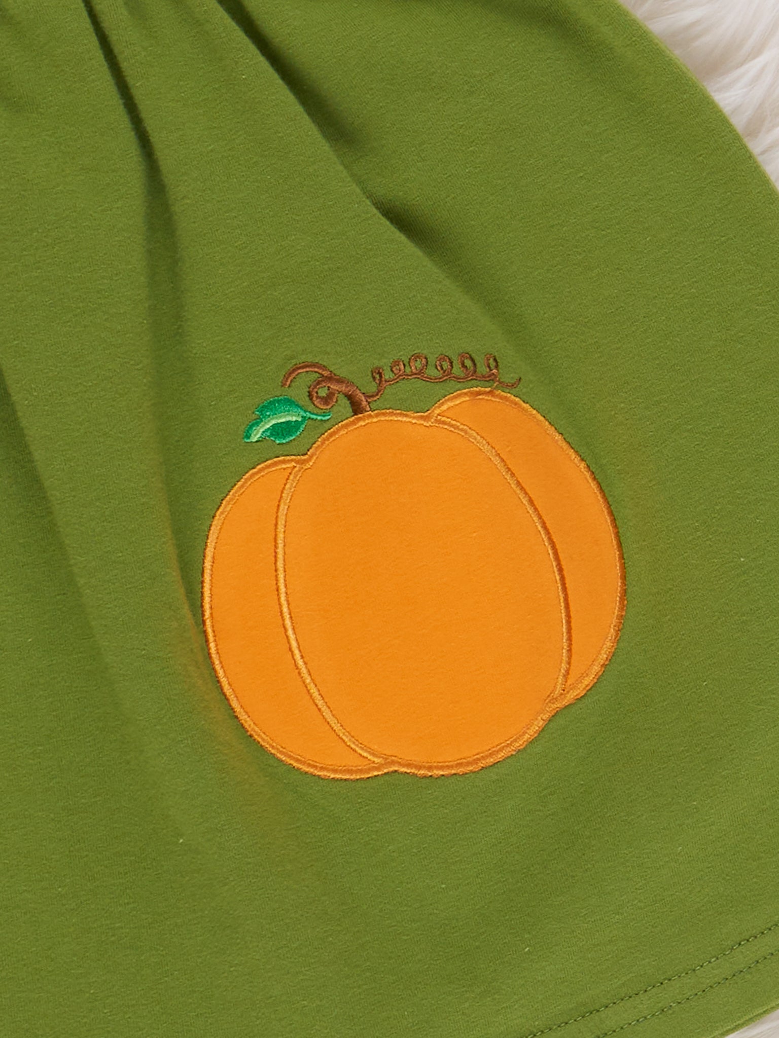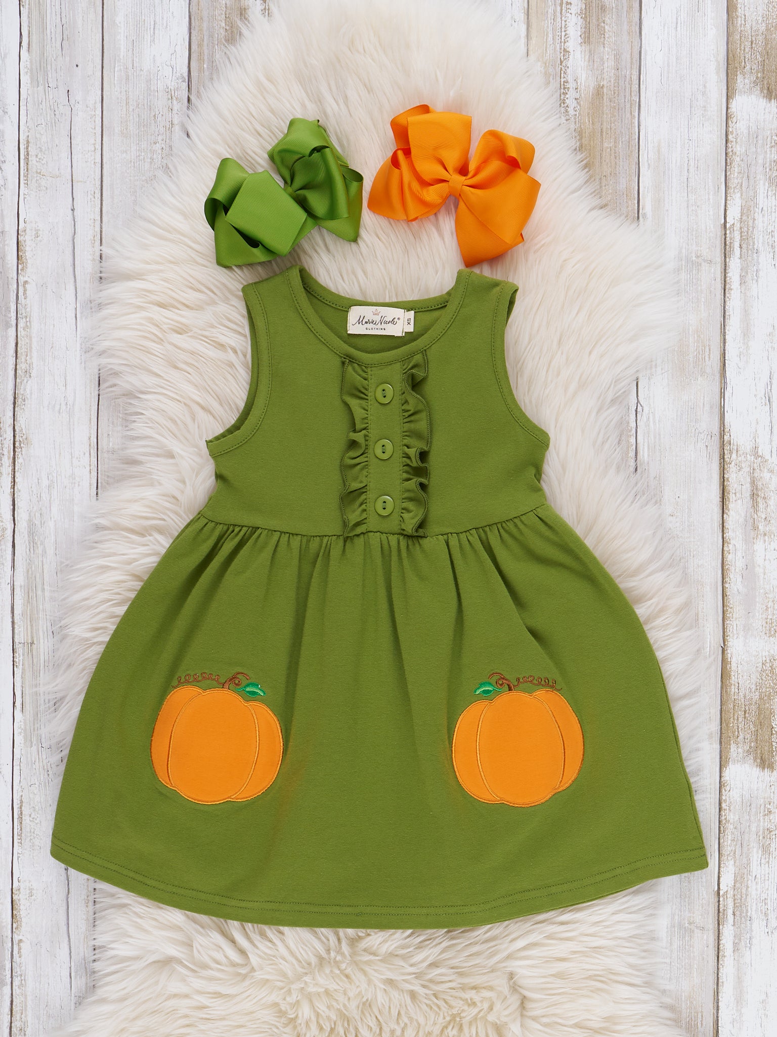 Growing Pumpkin Vine Overall Dress Set is a classic-style outfit full of fall-inspired delight. The ruffled sleeveless dress is embroidered with pumpkins, paired with a long-sleeve top with a lovely peter pan collar. This two-piece set by Marie Nicole Clothing is designed to be soft and comfy, perfect for Thanksgiving and all other autumn moments!