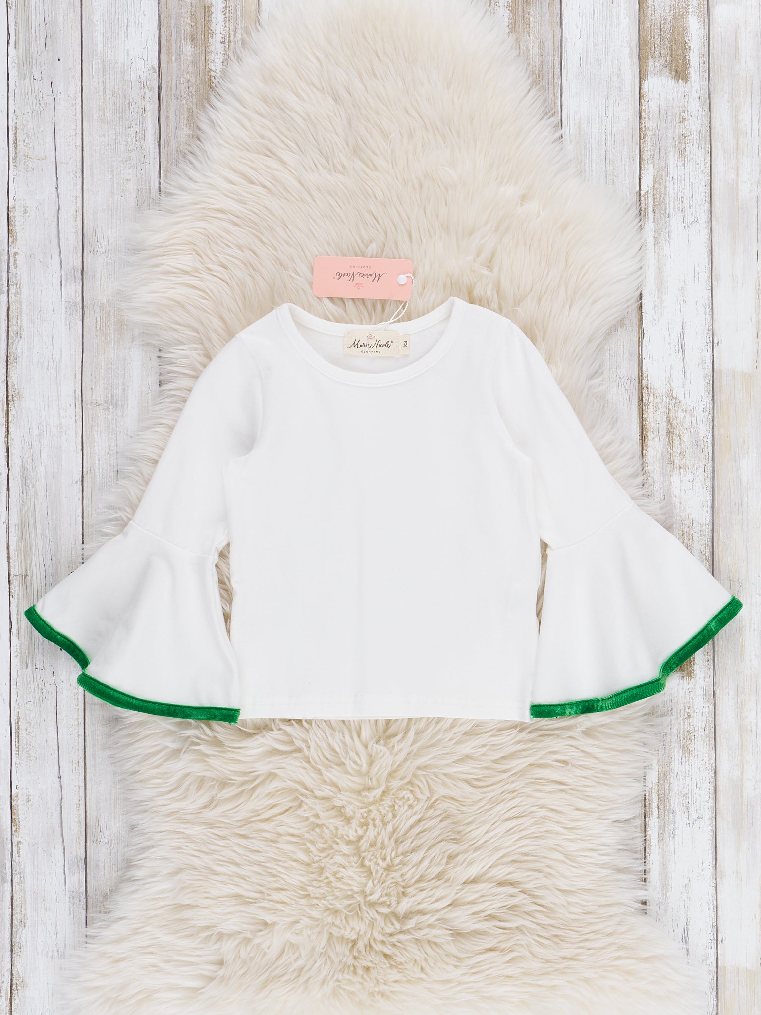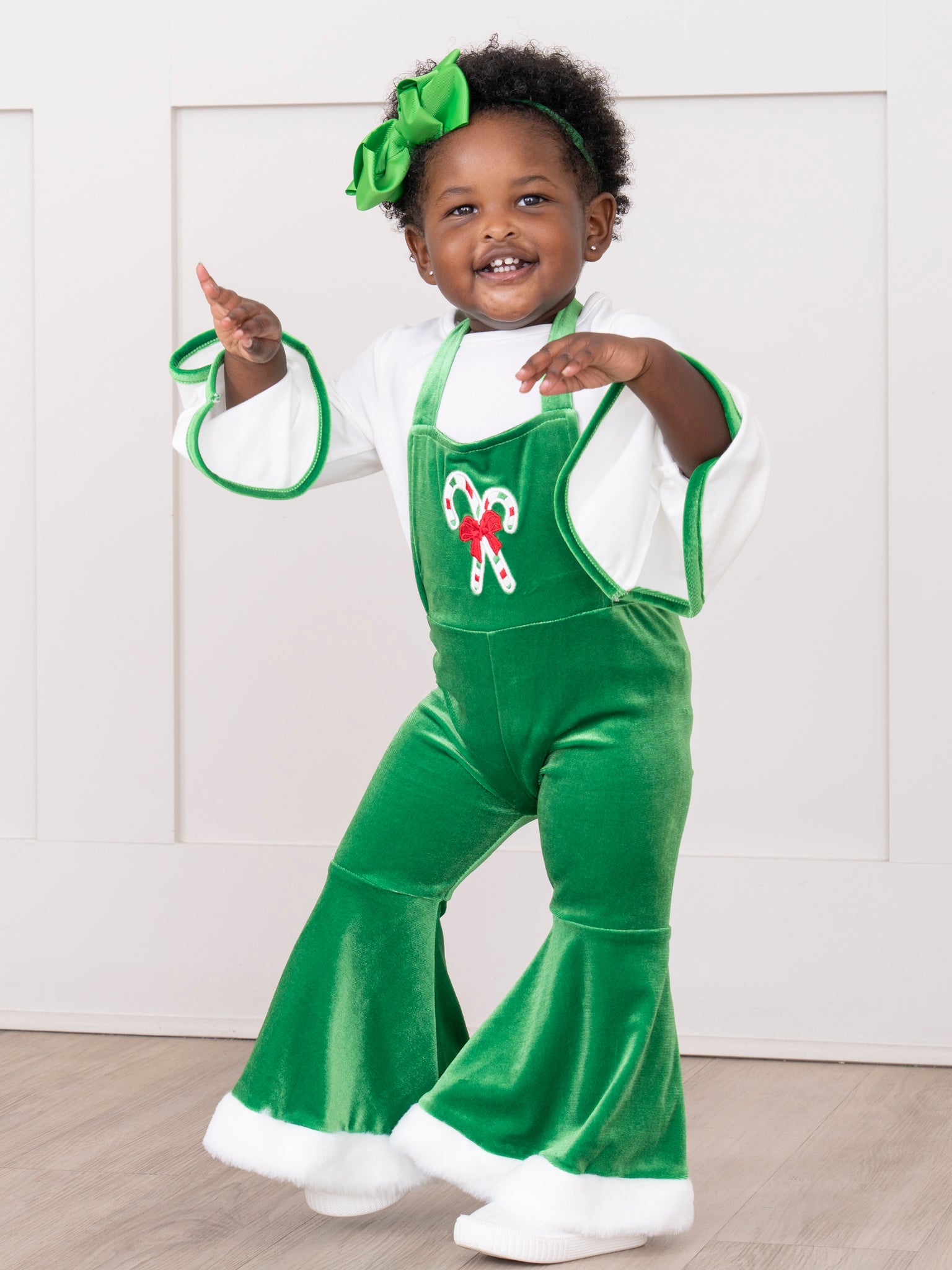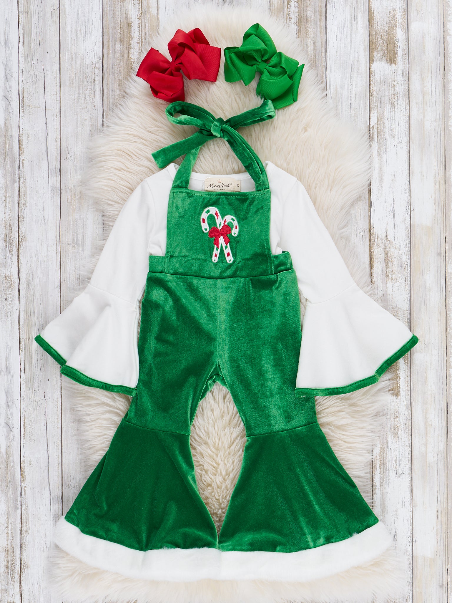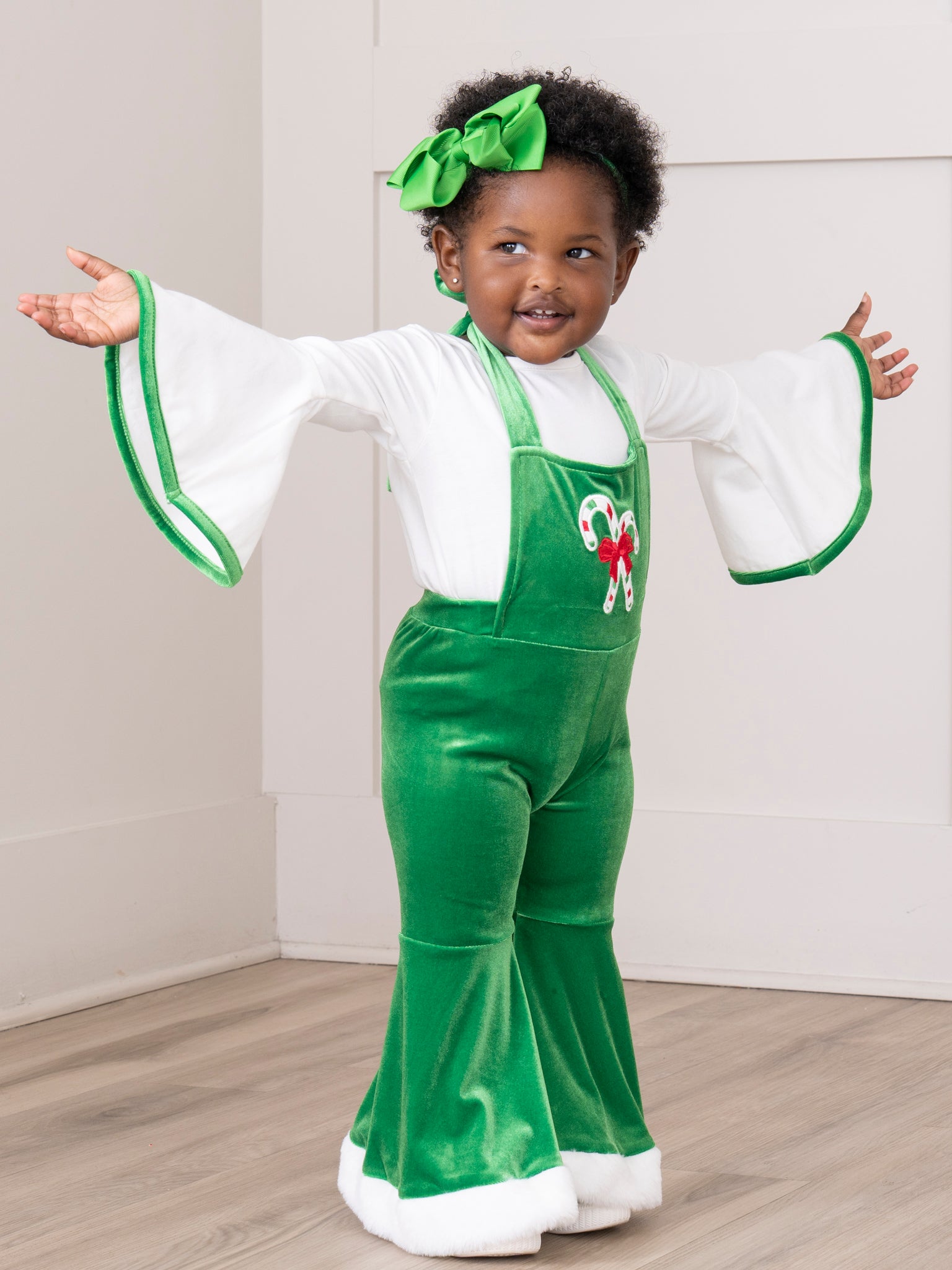 The Jolly Candy Cane Velvet Bell Bottom Outfit features a festive peplum top with a Candy Cane motif and dramatic bell sleeves, paired with plush velvet bell bottom pants trimmed in faux fur. This playful set is perfect for holiday celebrations, seasonal photos, or making joyful memories in style. Its charming details and cozy textures capture the magic of the winter season.