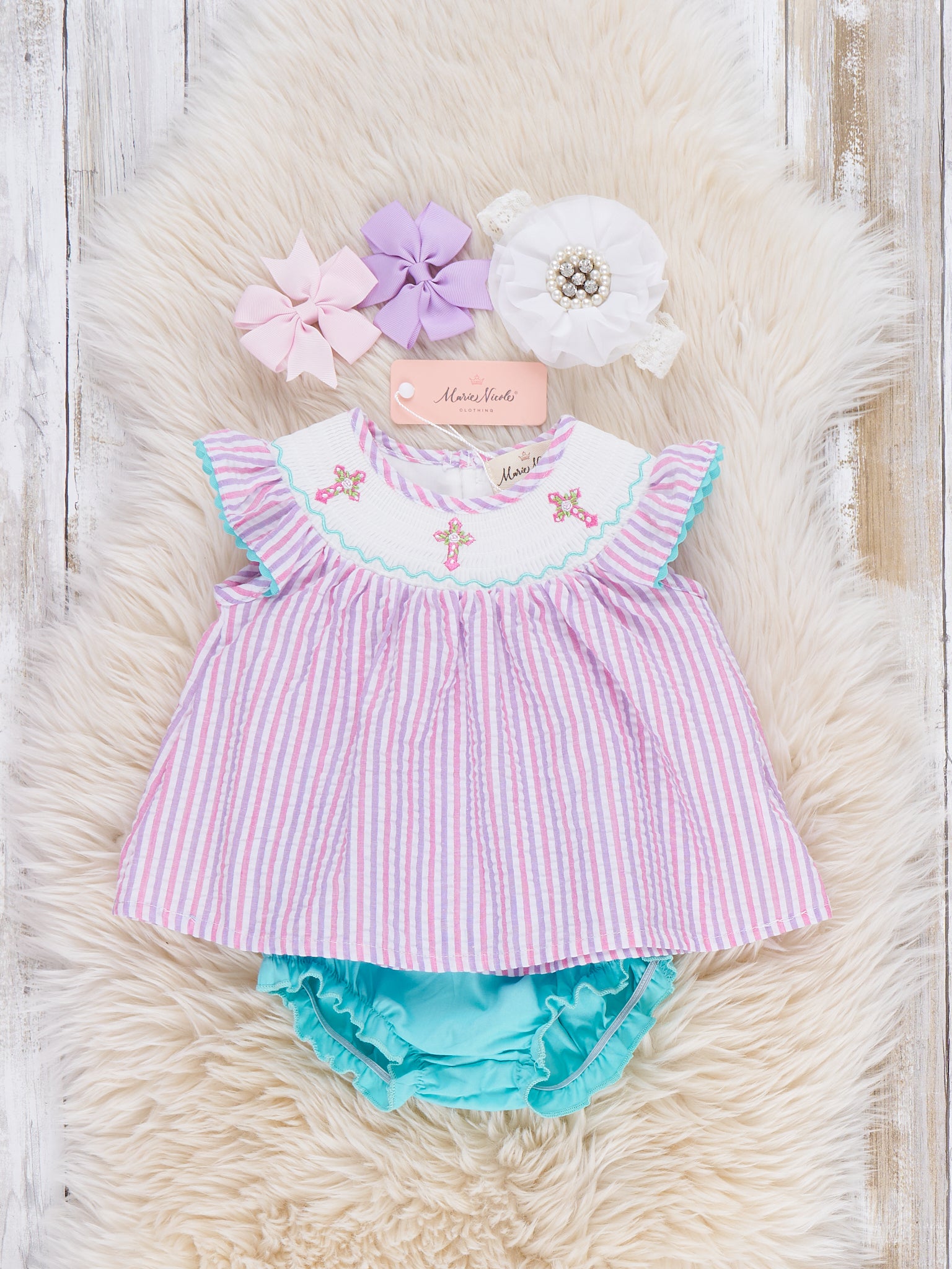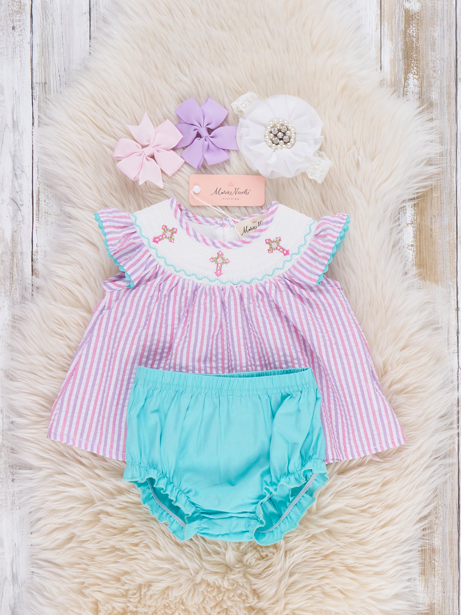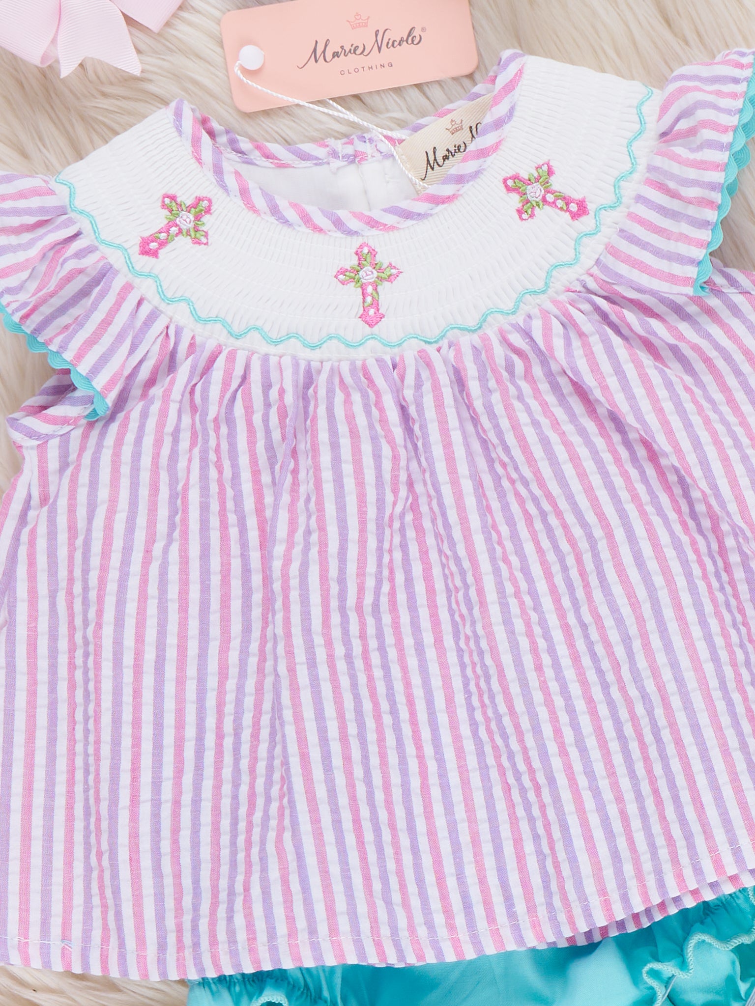 Little Blessings Cross Embroidered Outfit by Marie Nicole Clothing pairs a flutter-sleeve top with dainty cross embroidery on the yoke and coordinating bloomers for an easy, faith-inspired look. The soft fabric, gentle elastic, and simple back and inseam closures keep little ones comfortable for church, family gatherings, and special-occasion photos.
